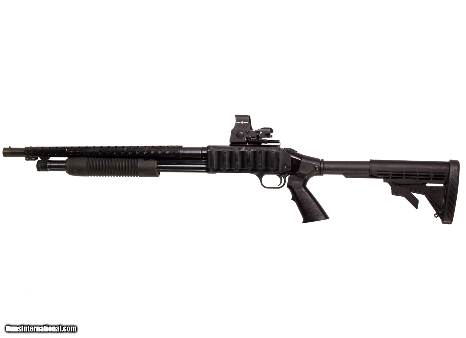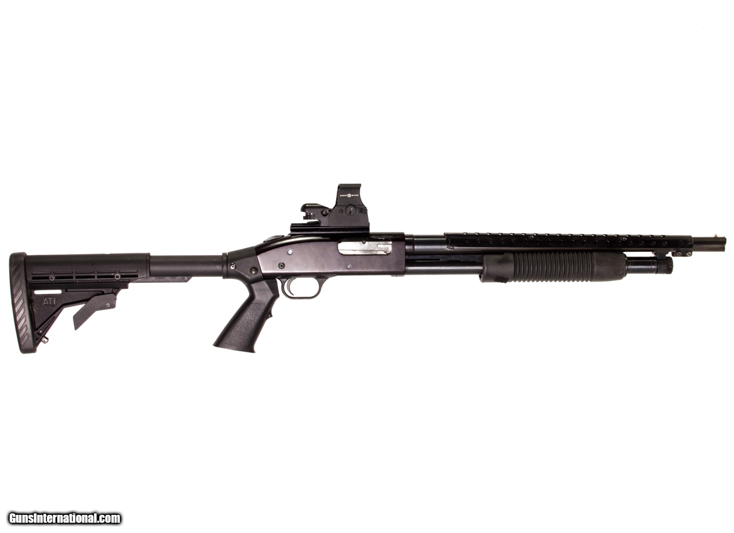 Mossberg 500 in a 12 ga with an adjustable but stock pistol grip sight mark red dot sight and an 18 inch barrel. This gun is in good condition and is covered by Dury's Lifetime Warranty.