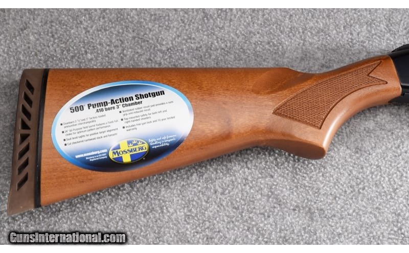 Description: This Mossberg Model 500 in .410 Bore remains in excellent condition. It features a 28" vent rib barrel and wood stock and forend. The original factory stickers are still present. The bore remains bright and shiny. Only a few very minor handling marks on the stock. A very nice .410 pump shotgun!! No box. .410 Bore SOLD Chambers: 3 Metal Condition: Excellent Wood Condition: Excellent Bore Condition: Excellent Barrels: 28" Vent Rib Triggers: Factory Stock Dimensions: 14" LOP Fore End: Checkered Walnut Semi Pistol Grip Stock - Checkered Walnut Forend Butt Pad: Tan Rubber Recoil Pad Weight: 6 lbs Sights: White Bead Front - Brass Mid-Bead Chokes: Fixed Full Item Location: Wheeling |