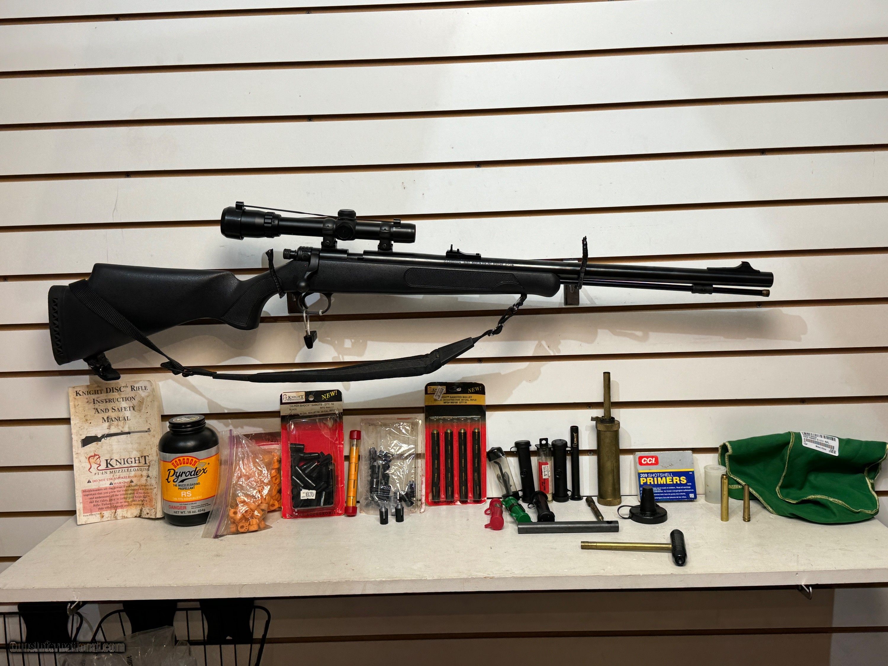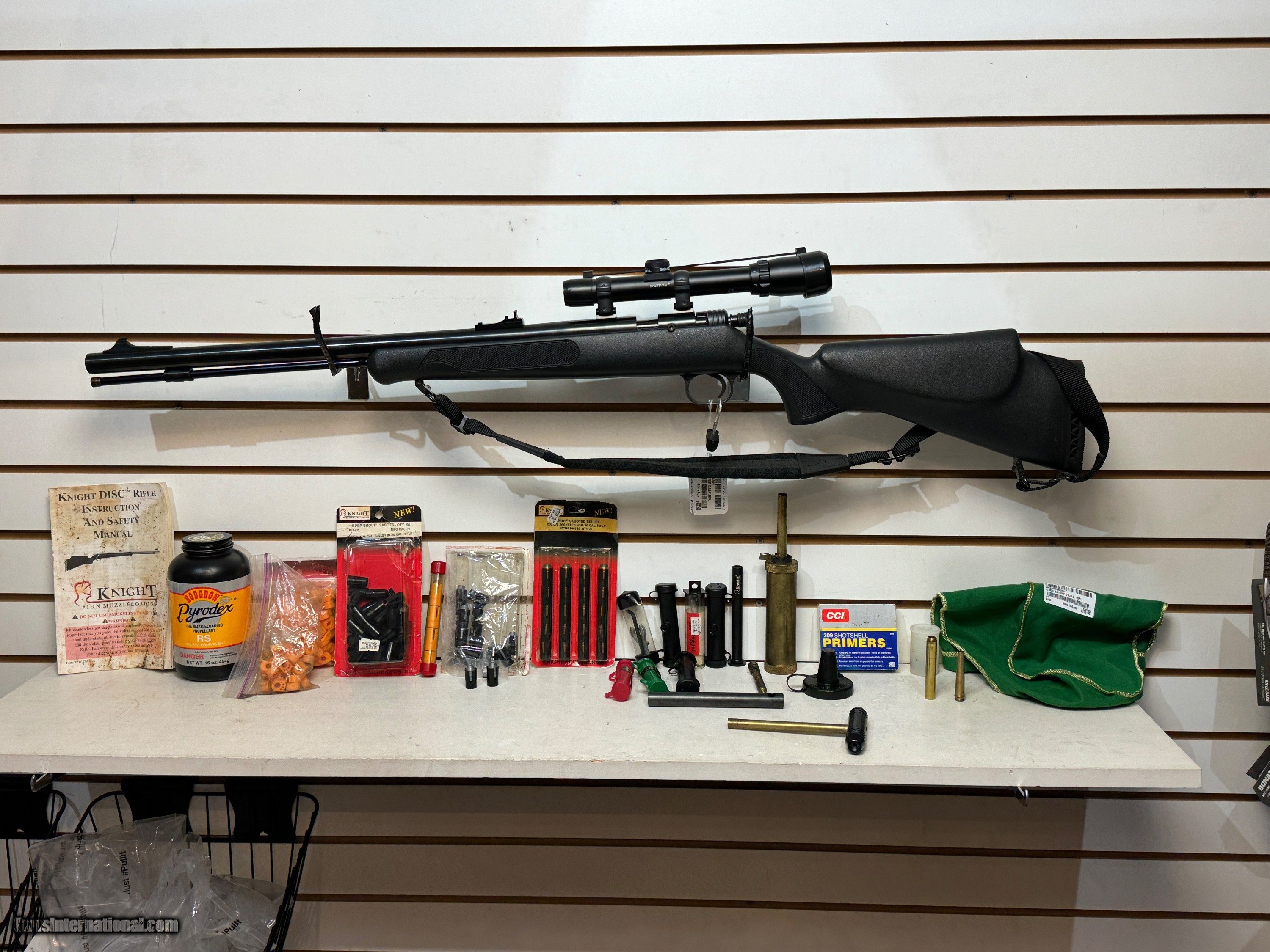 Used Knight D.I.S.C. Rifle 22" bbl Sportview scope 100 discs lots of accessories good condition rare