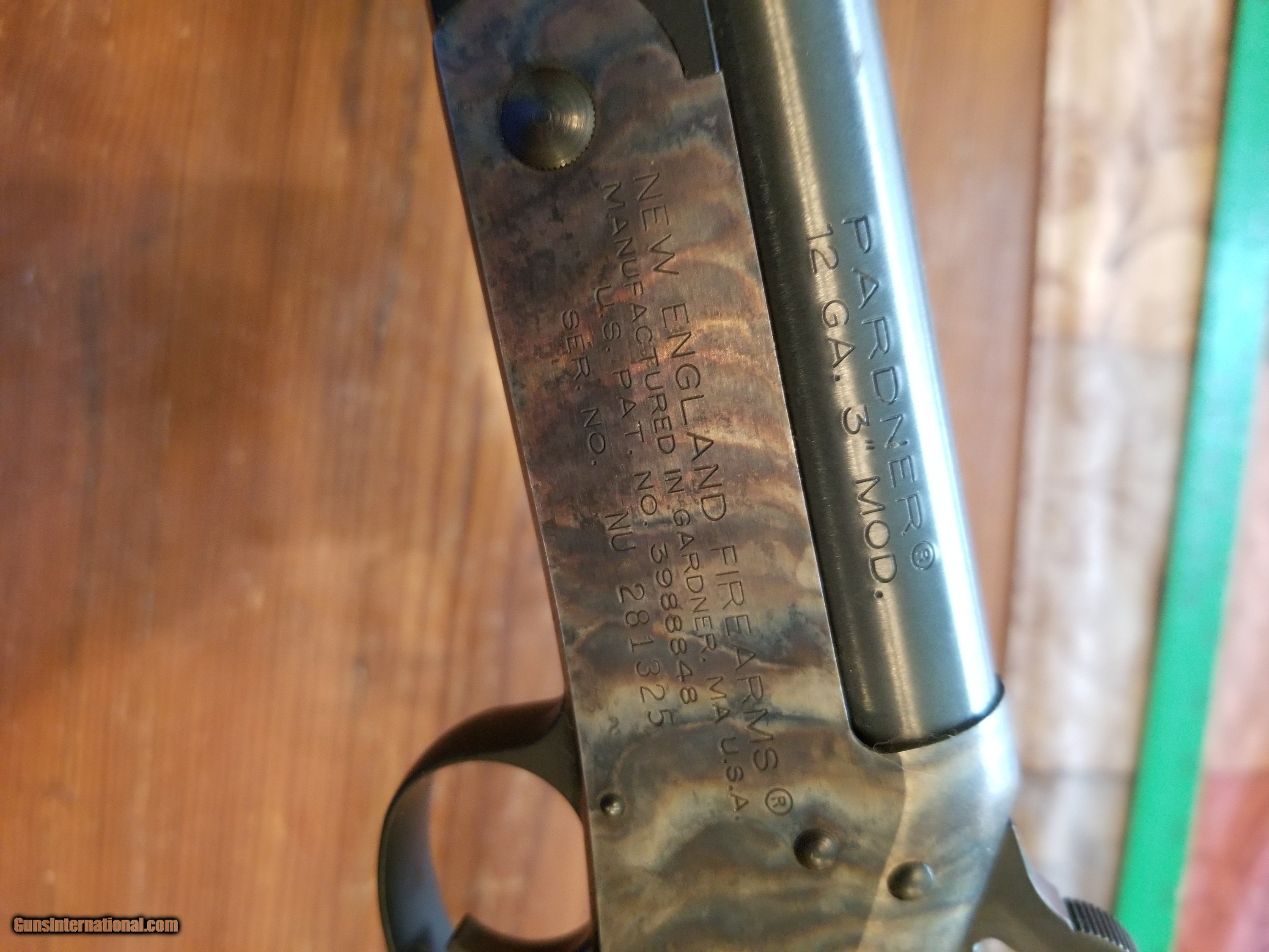 Description: New England firearms pardner. Case hardened receiver 12 gauge single shot. 28" modified barrel. Good overall condition with a few marks on the wood as shown. USPS money order $45 shipping to the lower 48. SPF SOLD Shotgun Gauge: 12 Gauge Manufacturer: New England firearms Model: Pardner Barrel Length: 28 Bore: Excellent Chambers: 3 Condition: Good Metal Condition: Excellent Wood Condition: Good Bore Condition: Excellent Chokes: Modified Item Location: 22840 |