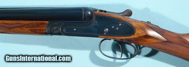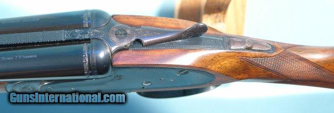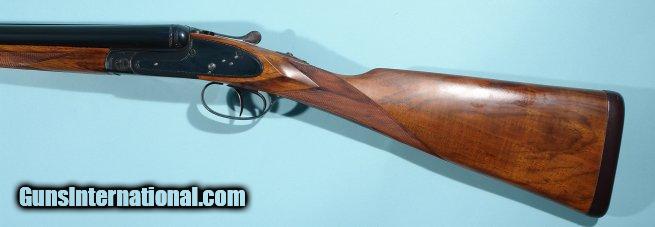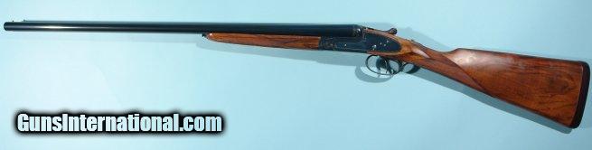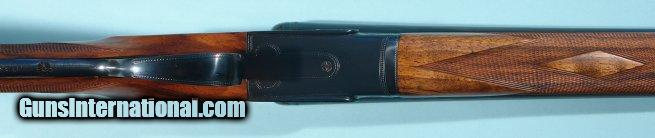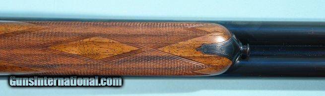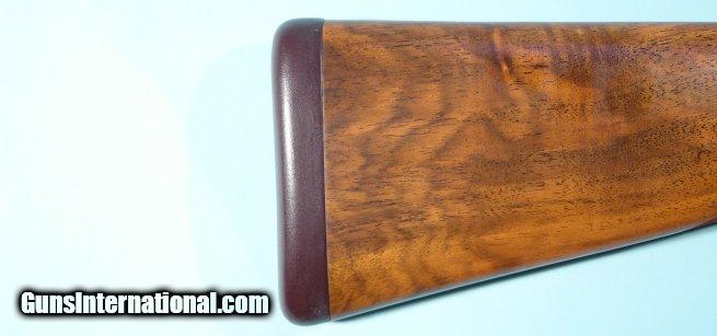 Description: ORVIS UPLANDER 20GA. SIDELOCK QUAIL STRAIGHT GRIP SHOTGUN BY ARIETTA. 25" solid rib barrels choked cylinder and skeet(just perfect for quail or upland game). Mint 100% original blue on barrels and unfired. Receiver same un-used condition with no signs of being fired. Straight english stock with 14 1/2" length of pull over leather covered pad. Crisp checkering appears un-handled. All screws unturned. Double triggers. Still has original packing grease on hinge pins and atumatic ejectors. Self opening. Ejectors very strong. Normal cast for right hander. Weighs 6 1/4 lbs. SOLD |