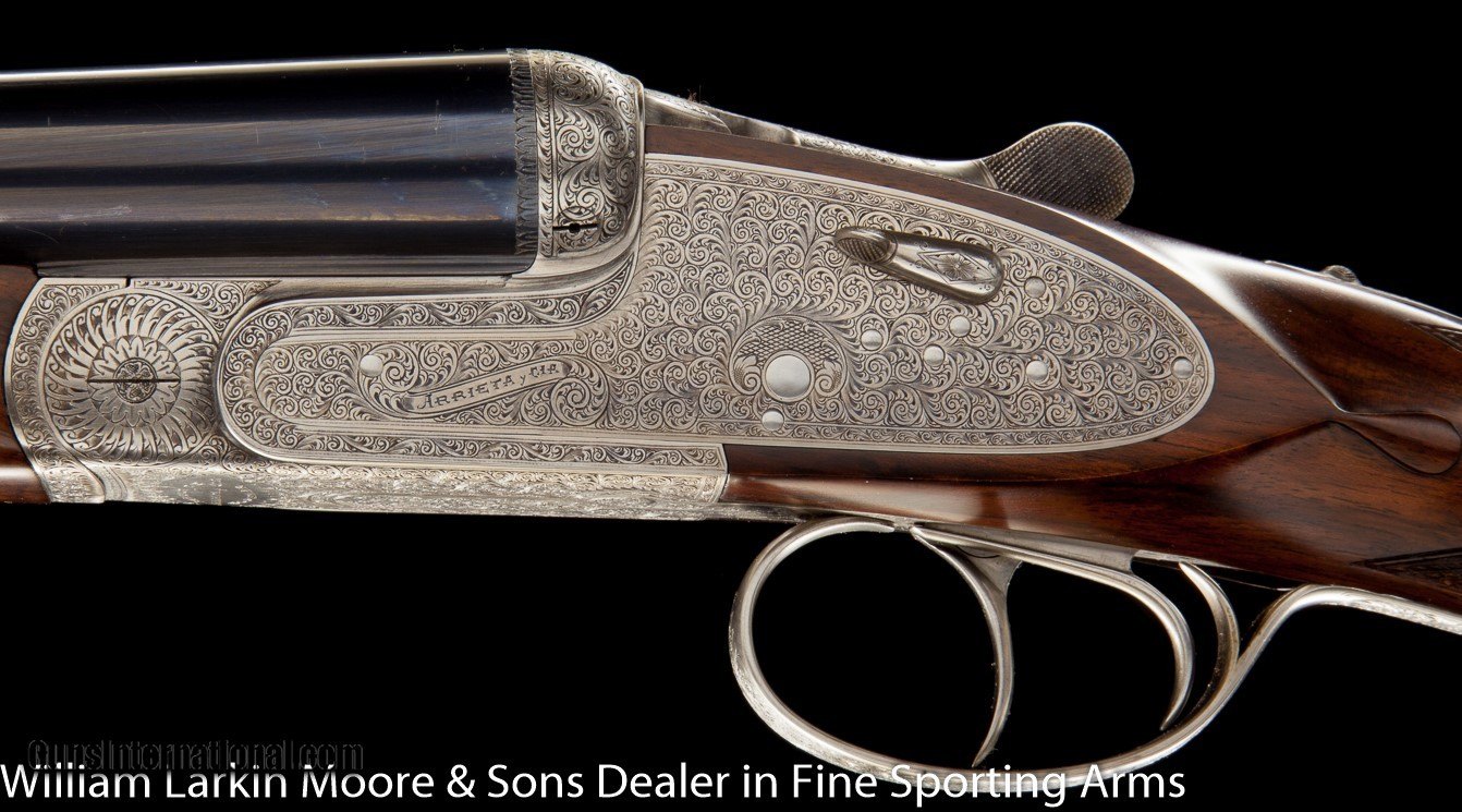 Description: ID # 7707 Make ARRIETA Model Model 801 True Pair Configuration SXS Gauge / Caliber 12 GA Price $14,000.00 NEW LOW PRICE Serial # 36687 & 36688 Country of Origin Spain Barrel Length (in Inches) 27 Choke #1 LtM(.010) & LtM(.010) Choke #2 LtM(.010) & LtM(.010) Trigger DT (Double) Stock Configuration Straight Grip, Drop points, Gold ovals, Checkered butts Forearm Type Splinter Forearm Rib Type Smooth Concave Rib Receiver Finish Coin Finish Engraving Type Churchill style fine scroll Other Options H&H type self-opening mechanisms, H&H type hand detachable locks, Automatic safeties, Articulated triggers Condition EXC. Plus Condition Weight 6#10oz each Dimensions 1 5/8 x 2 1/4 x 15 with 1/4 cast off, Both guns have the same dimensions Other Details Mfg 1990, This is a super nice pair of guns with great specs William Larkin Moore & Sons LLC 16622 N 91st Street Suite 102-103 Scottsdale, AZ 85260 USA Tel or Text: 480-951-8913 Fax: 480-951-3677 SOLD |