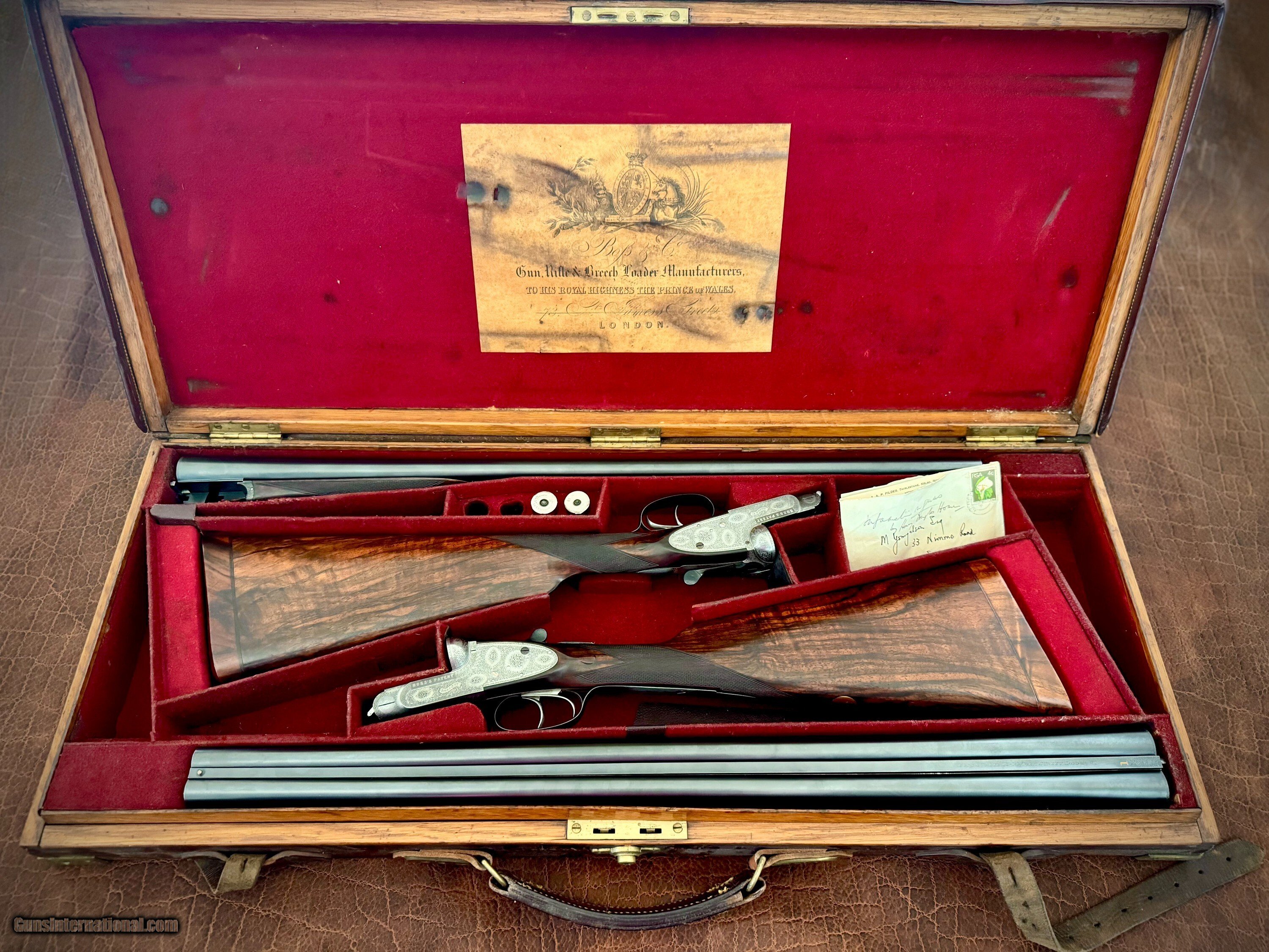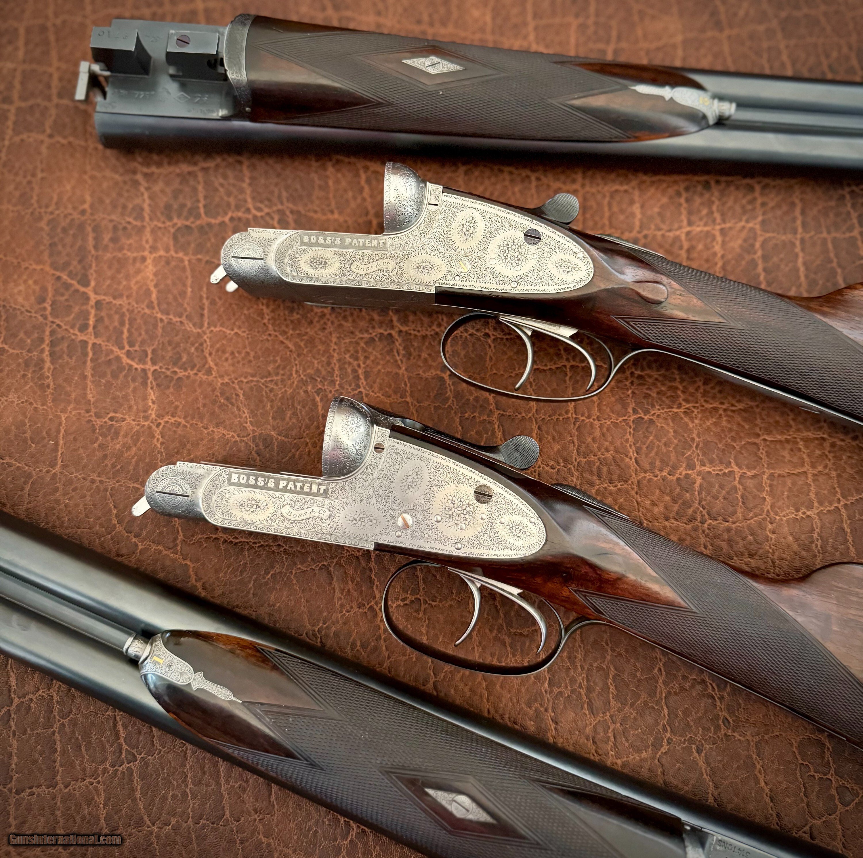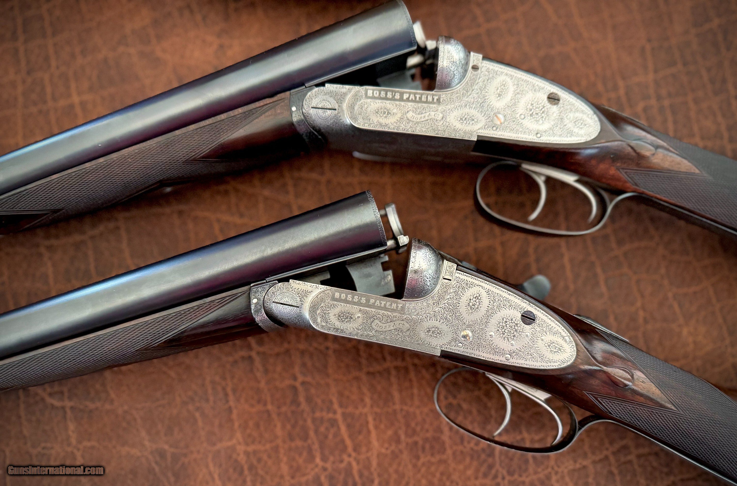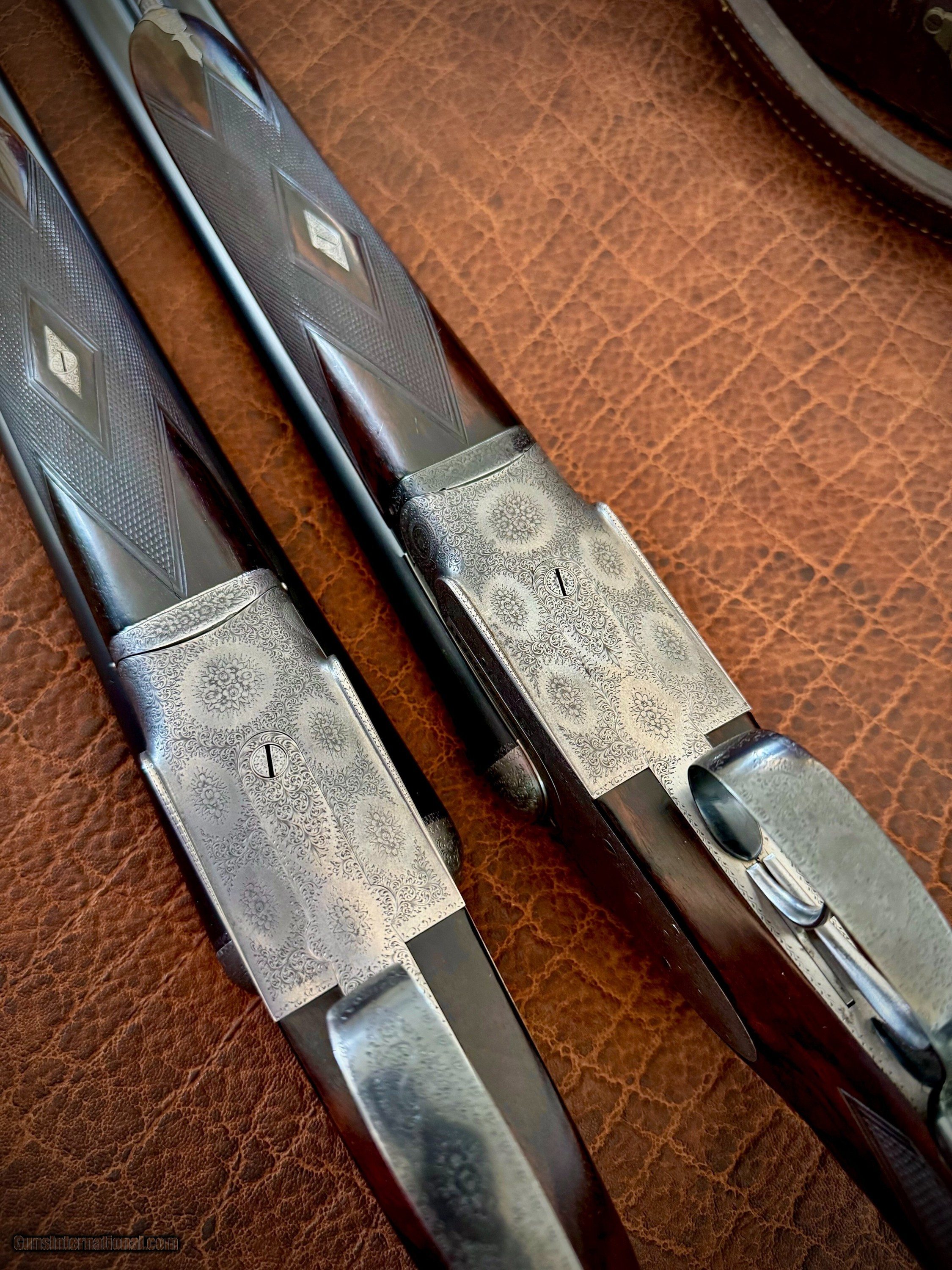 Description: Boss & Co., London – 12-Bore Side-by-Side Shotgun Set Completed 1904 | Re-barreled by Boss, 1976 (SN 4567/8 and then rebarralled SN 9709/10) Fine Boss & Co. London 12-bore side-by-side shotgun set, originally completed in 1904. Returned to the maker in 1976, when a new set of 26 & 28-inch barrels were made and fitted by Boss & Co. Retaining its original ejector system and housed in its original Boss case. There is a vintage letter included with the set. A classic Edwardian Boss, responsibly updated by the maker for modern shooting while preserving original character, balance, and pedigree. Chokes - IC /Mod Bore - 12 LOP - 14.5" BBL - 27" DAC - 1½" DAH - 1¾" Cast - 1/8" off Weight - 7 lbs. 3 oz. 26" BBL - 2-1/2" 28" BBL - 2-3/4" $38,900.00 Shotgun Gauge: 12 Gauge Price: $38,900.00 Contact Seller |