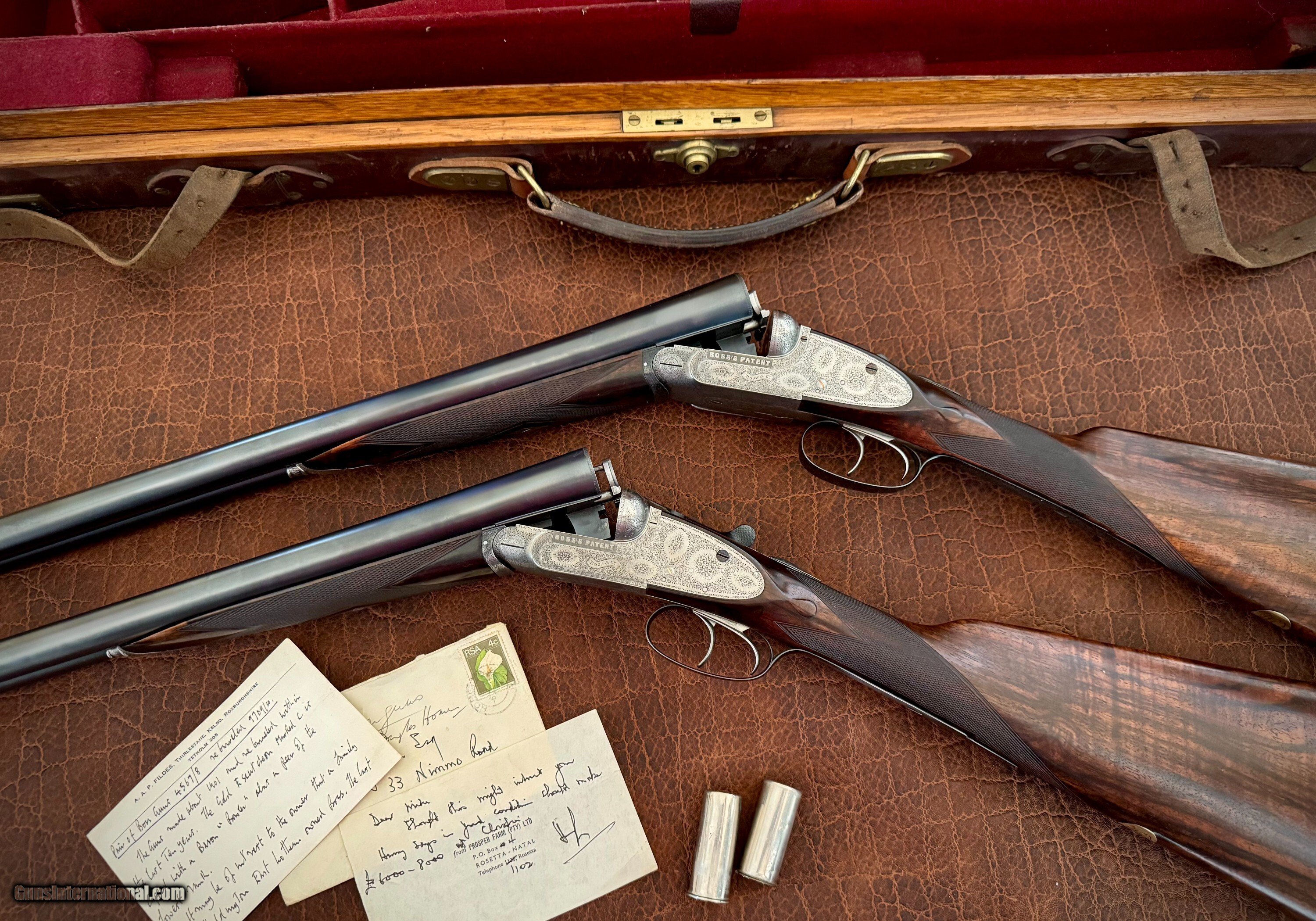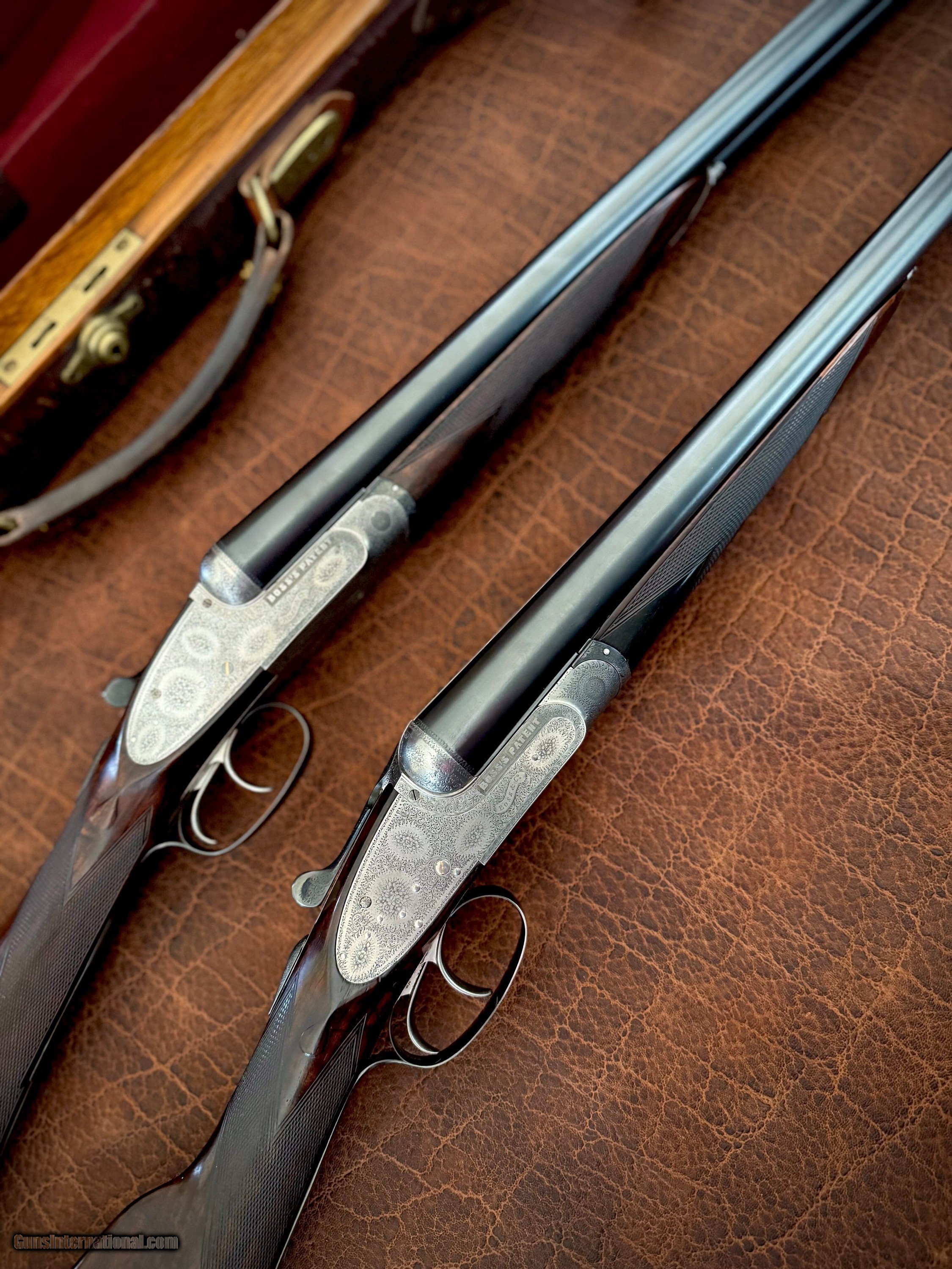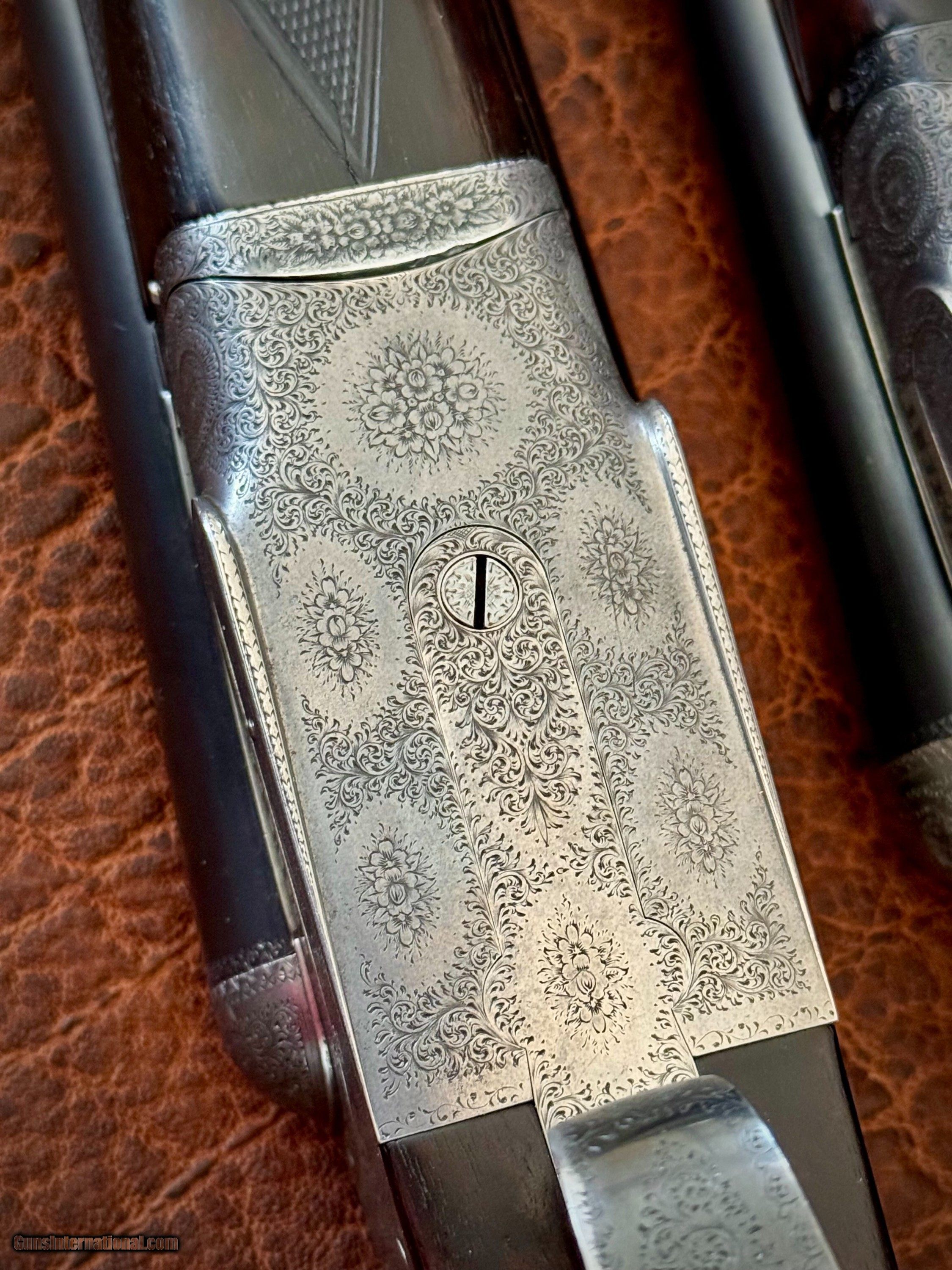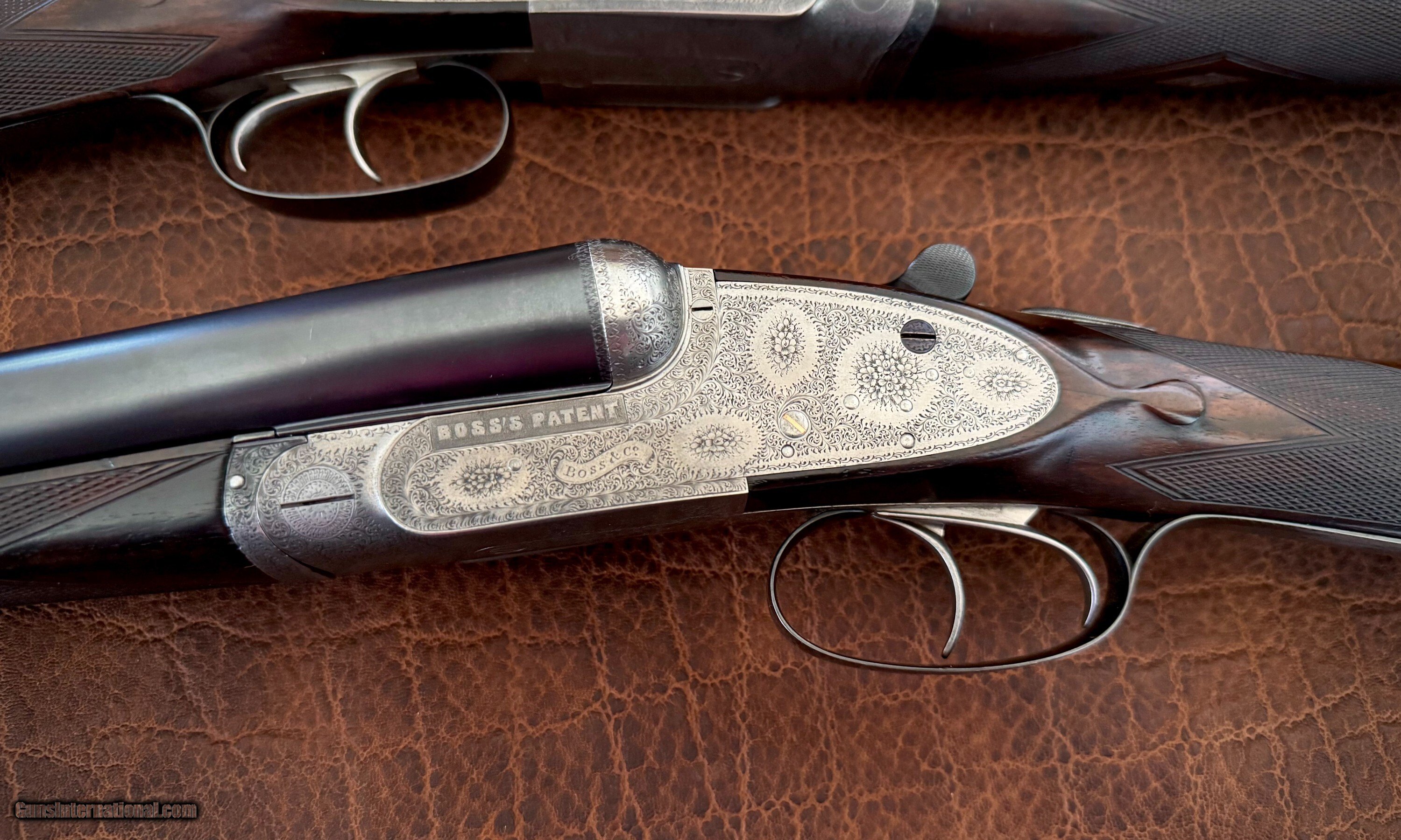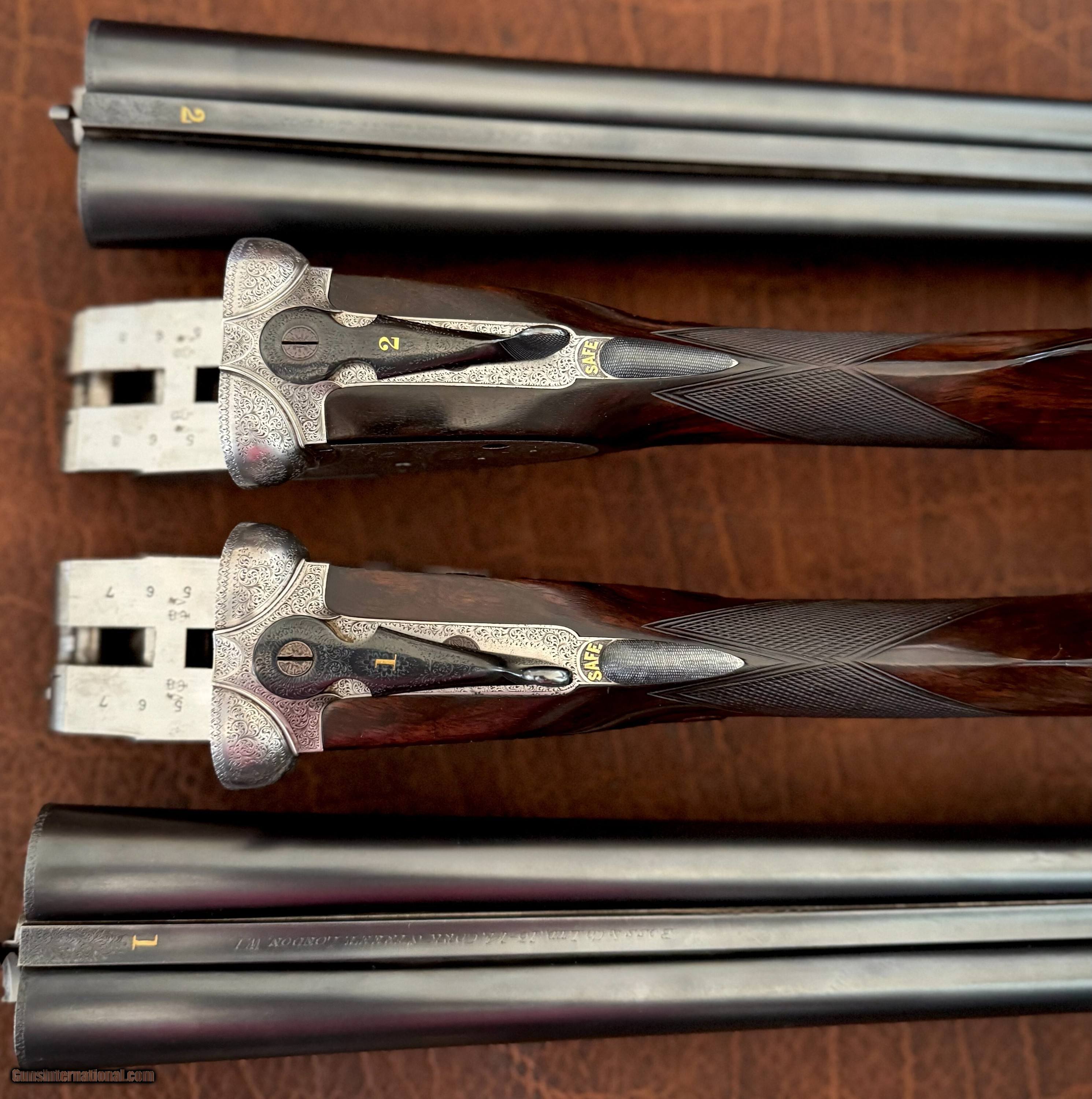 Description: Boss & Co., London – 12-Bore Side-by-Side Shotgun Set Completed 1904 | Re-barreled by Boss, 1976 (SN 4567/8 and then rebarralled SN 9709/10) Fine Boss & Co. London 12-bore side-by-side shotgun set, originally completed in 1904. Returned to the maker in 1976, when a new set of 26 & 28-inch barrels were made and fitted by Boss & Co. Retaining its original ejector system and housed in its original Boss case. There is a vintage letter included with the set. A classic Edwardian Boss, responsibly updated by the maker for modern shooting while preserving original character, balance, and pedigree. Chokes - IC /Mod Bore - 12 LOP - 14.5" BBL - 27" DAC - 1½" DAH - 1¾" Cast - 1/8" off Weight - 7 lbs. 3 oz. 26" BBL - 2-1/2" 28" BBL - 2-3/4" $38,900.00 Shotgun Gauge: 12 Gauge Price: $38,900.00 Contact Seller |