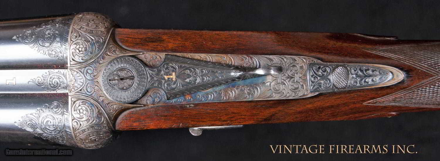Description: Charles Lancaster 20 Bore SxS Shotguns PAIR SELF OPENER, SIDELOCK, SINGLE TRIGGER, #1 & #2 PAIR OF SHOTGUNS, CASED General Specs: Charles Lancaster, Year 1984, 20 Gauge, 5lbs 13oz, Side by Side Serial Number: 25003, 25004 *PHOTOS ARE OF BOTH GUNS, WITH DETAIL PHOTOS OF THE #1 OF PAIR. FOR MORE PHOTOS PLEASE EMAIL US OR SEE THE INDIVIDUAL LISTINGS FOR EACH OF THESE GUNS, WITH FULL PHOTOS. Charles Lancaster has been one of the elite names in the British shotgun business for well over 100 years. Absorbed by Grant and Lang in the 1930's, the guns Lancaster designed remained in production and his patents and styles continued to be utilized by the "BEST GUN" trade. This pair of guns is described below and the details are shown in the table attached to this ad. THIS LISTING IS PRICED AS A PAIR, BOTH SHOTGUNS, WITH CASE. *PAIR OF CHARLES LANCASTER DLX SIDELOCK EJECTOR SINGLE TRIGGER SELF-OPENING GAME GUNS WITH CASE.SN 25003 / 25004. Cal. 20 Ga. 2-3/4" Chambers. 28" Chopper lump barrels are engraved “Chas. Lancaster. Birmingham.” on low narrow concave game ribs with nos. “1" and “2" inlaid in gold on each gun, respectively. Breech ends of bbls have 1" triangles of shaded scroll. Bottoms of bbls are fitted with Holland & Holland style assisted opening spring mechanism. Bbl flats show 1984 Birmingham nitro proofs for 2- 3/4" chambers. Holland style bar lock actions feature non-automatic safeties (SAFE is inlaid in gold), bushed strikers, and non-selective single triggers. Lockplates are fitted with H & H style hand detachable pin. Actions and lockplates are engraved with well executed large flowing open scroll. “Chas. Lancaster” is in arched rib band on each lockplate. Bottoms of actions are engraved “De Luxe Assisted Opener”. Blued top levers have “1" and “2" inlaid in gold, respectively. Single beaded small bow trigger guards are scroll engraved, with SN on tangs. Well matched broadly streaked and lightly figured European walnut straight grip buttstocks measure 14- 7/16" LOP, with one showing a Silvers pad. (IF YOU WANT THE GUNS TO MATCH WE CAN INSTALL PURDEY STYLE LEATHER PADS ON BOTH GUNS AND RETAIN THE SAME LOP OR SIMPLY ANOTHER SILVERS PAD). Stocks feature diamond hand drop points and gold shields on toe lines, engraved “JCC”. Nicely cut approx 28 LPI flattop standard point pattern checkering has double line border. Matching splinter forends have Anson releases (“1" and “2" are inlaid in gold on each tip, respectively). Large oak and leather double motor case has brass corners with handle mounted on top. Interior is lined with maroon cloth with large black leather gold embossed Lancaster label. These very well-made sidelock guns are assembled, finished, and proofed in Birmingham England and represent an incredible value when compared to their London made counterparts. Case is excellent Antiqued leather has a few minor marks and scrapes. Straps show some fraying, but are strong. Interior cloth is excellent. Barrels Barrel Length: 28" Chokes: .008/.018 Bores: mirror Bore Diameter: .618/.619 Wall Thickness: .031/.033 % Blue: 99% Chambers: 2 3/4" Ribs: tight smooth sunk Sights: single Action Action: tight, centered Ejectors or Extractors: ejectors, strong, timed Case Color: 99% factory Screws: perfect Engraving: bank note 95% Trigger Type: single non selective trigger, crisp Trigger Guard Color: 99% rolled edge Stock Type: english stock/splinter forend, diamond profiled wrist LOP: 14 3/8" LOP To End Of Wood: same DAH: 1 7/8" DAC: 1 1/2" Cast: neutral Checkering Condition: 28 lines per inch wraparound ; triple border Butt Treatment: checkered butt There are more photos upon request. We offer a 30 day mechanical warranty on this fine shotgun. Call us for full details. PLEASE SEE MY OTHER FINE VINTAGE FIREARMS. Just open one of my ads and click on the line that says “see all items from this seller” and a very nice list of fine sporting and collectible arms will appear. I have many more fine sxs shotguns not yet listed. Thanks for looking! JOIN US at the Orvis Game Fair and Country Sporting Weekend, September 19 & 20, 2015, at Orvis Sandanona in Millbrook, NY! We employ a full time gunsmith on premises and can perform alterations to suit your needs within a few weeks of purchase. Payment Methods: Money Order, Certified Check, Personal Check, Wire Transfer Inspection Period / Return Policy: Three Days from the date the item was received. Sales Tax: 6% Michigan Only Shipping & Insurance: Ground $140.00 We ship internationally! Item Condition: Used Requires FFL?: Yes If you have any questions about this item or payment, please email or call us directly, at #616-292-6240. Thanks! Vintage Firearms, Inc SOLD |
