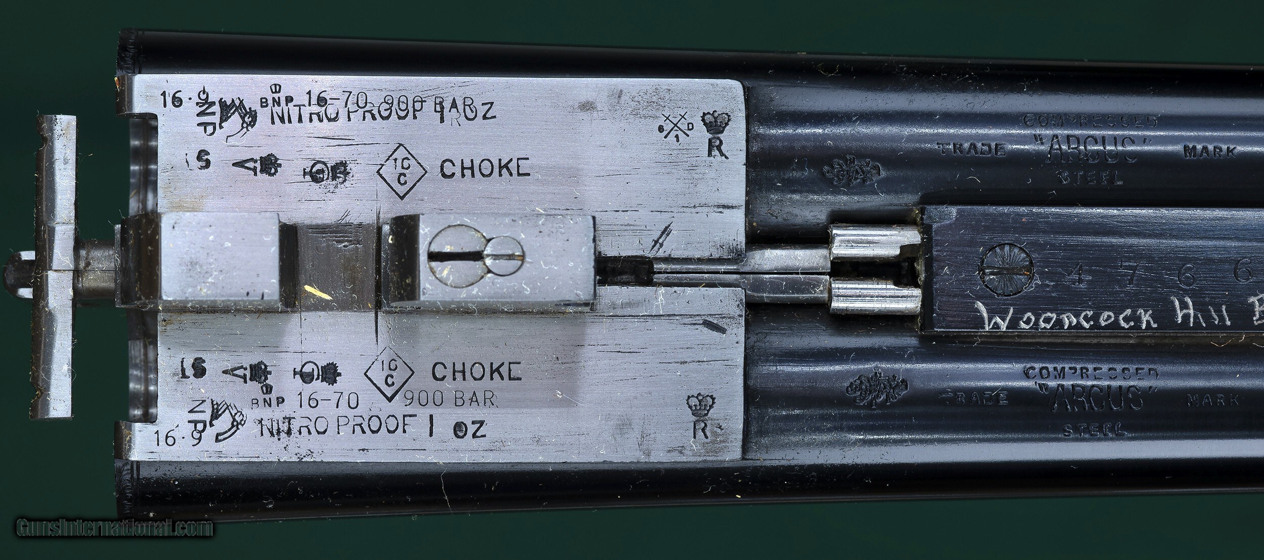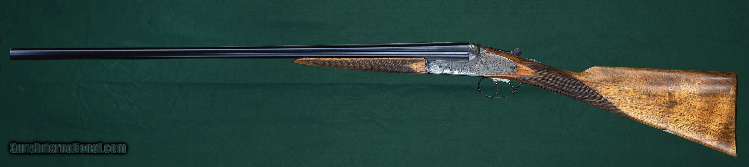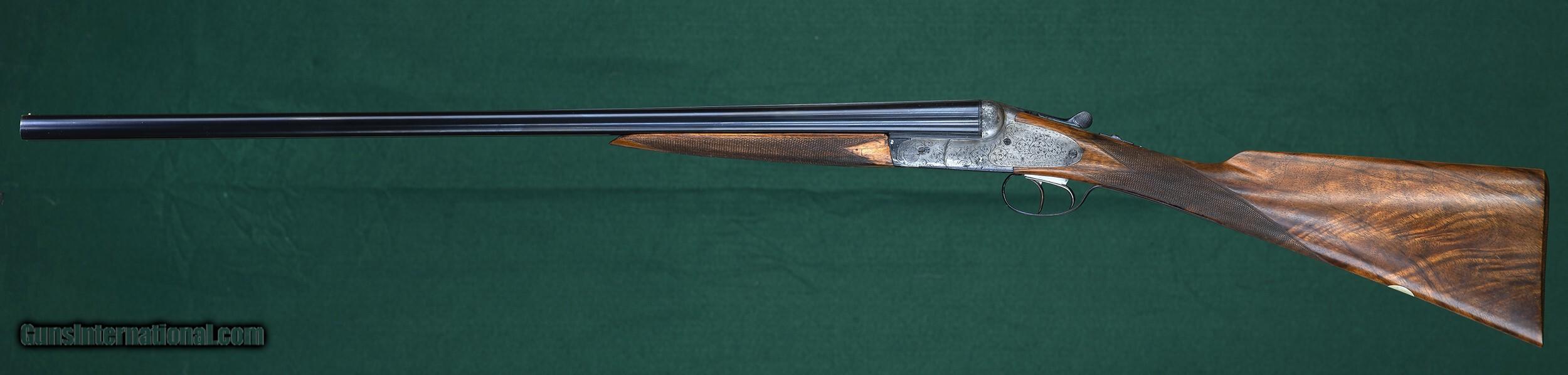Description: 27 1/2" SxS dovetail barrels with smooth concave ribs both choked improved cylinder & modified. 14 1/2" pull from front triggers to checkered wood butts. 1 5/8" - 2 1/4" drops. 3/8" cast off. Lightly figured European walnut stocks with snap-fastened splinter forends, straight English grips, classic point-pattern checkering, and vacant silver initial ovals. Scroll engraved boxlock actions with sideplates and Greener crossbolts, and automatic top tang safeties. Each weighs 5lbs, 15oz. Consecutively numbered and with components engraves 1 and 2. Chambers lengthened to 2 3/4" and Birmingham reproved in 2004---with original proof certificates. Barrels and furniture reblued to 100%. Traces original casehardening colors. Tight and with ejectors in time. In leather double trunk case with maker's label. Curio/Relic: Yes Shotgun Gauge: 16 Gauge Manufacturer: Cogswell & Harrison Model: Avant Tout Serial Number: 47667 & 47668 Barrel Length: 27 1/2 Ejectors: Yes Stock Comb: 1 5/8 Stock Heel: 2 1/4 Fore End: Splinter Butt Pad: Checkered wood LOP: 14 1/2 Rib: Smooth concave Choke Left: modified Choke Right: improved cylinder Engraving: Scroll engraved Case: Leather double trunk case with maker's label. Item Location: Livingston, Montana Proof:Nitro: Yes Price: $12,450.00 Contact Seller |