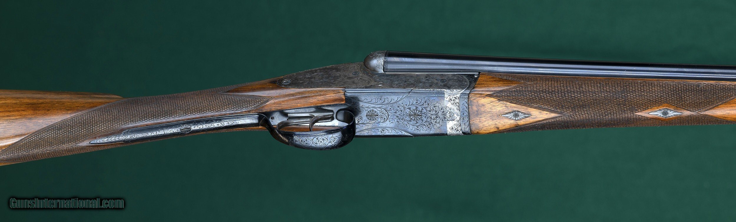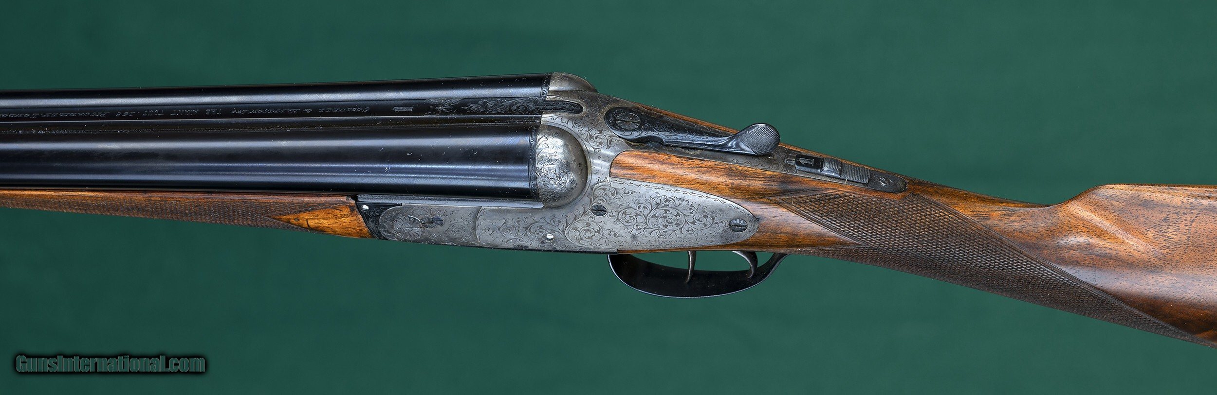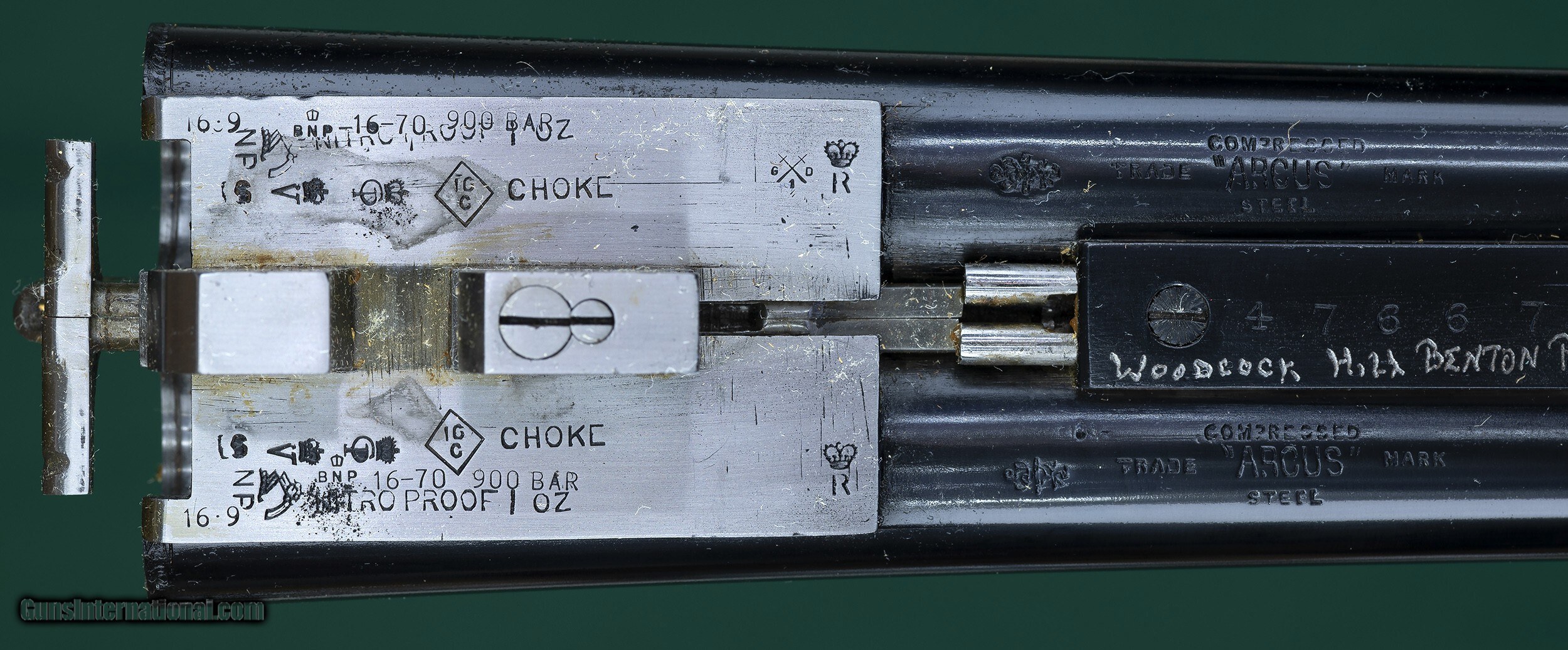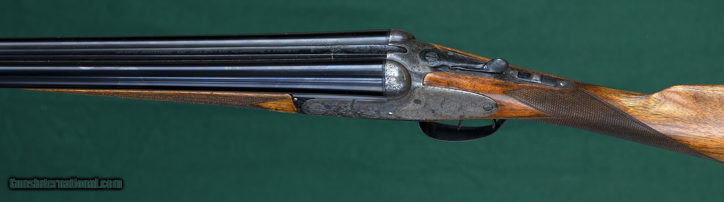 Description: 27 1/2" SxS dovetail barrels with smooth concave ribs both choked improved cylinder & modified. 14 1/2" pull from front triggers to checkered wood butts. 1 5/8" - 2 1/4" drops. 3/8" cast off. Lightly figured European walnut stocks with snap-fastened splinter forends, straight English grips, classic point-pattern checkering, and vacant silver initial ovals. Scroll engraved boxlock actions with sideplates and Greener crossbolts, and automatic top tang safeties. Each weighs 5lbs, 15oz. Consecutively numbered and with components engraves 1 and 2. Chambers lengthened to 2 3/4" and Birmingham reproved in 2004---with original proof certificates. Barrels and furniture reblued to 100%. Traces original casehardening colors. Tight and with ejectors in time. In leather double trunk case with maker's label. Curio/Relic: Yes Shotgun Gauge: 16 Gauge Manufacturer: Cogswell & Harrison Model: Avant Tout Serial Number: 47667 & 47668 Barrel Length: 27 1/2 Ejectors: Yes Stock Comb: 1 5/8 Stock Heel: 2 1/4 Fore End: Splinter Butt Pad: Checkered wood LOP: 14 1/2 Rib: Smooth concave Choke Left: modified Choke Right: improved cylinder Engraving: Scroll engraved Case: Leather double trunk case with maker's label. Item Location: Livingston, Montana Proof:Nitro: Yes Price: $12,450.00 Contact Seller |