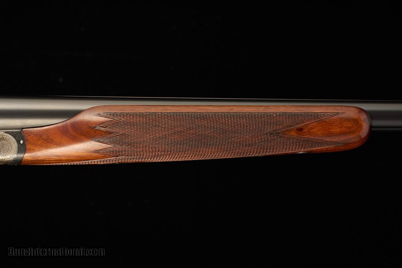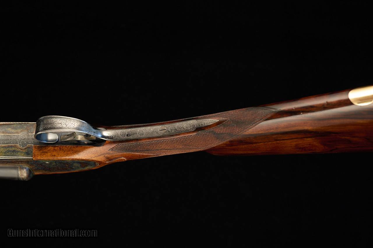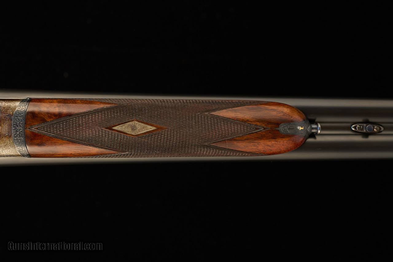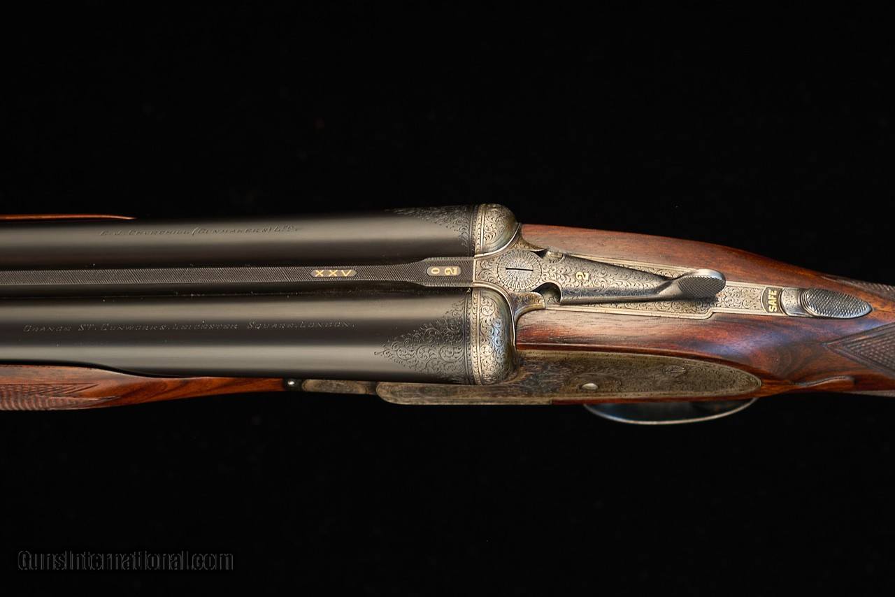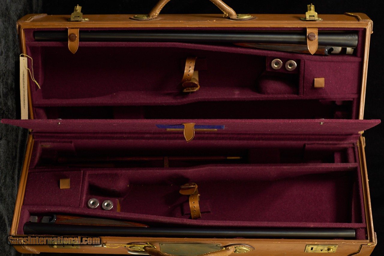 Straight hand grip, single trigger on a square bar action, pin-less locks, auto-safety, cross-filed raised Churchill rib, small brass front bead, hold open top lever, gold inlaid "SAFE" ahead of the safety catch, gold inlaid XXV on the rib, gold inlaid “1” and “2” on the top lever, rib, and forend iron tip, gold lined cocking indicators, vacant gold oval, drop points, maker's name in banners on both sides, double beaded trigger guard, an Anson push button forend release, checkered splinter forend and wrist with mullered borders. The guns are housed in a maker’s toe-under leather case with burgundy baize, maker’s label, two sets of snap caps, key, two-piece cleaning rod, jag, mop, and a brass brush. The extra set of beavertail forend barrels for each gun fit in the case. Circa early 1960s guns proofed in London at 3 ¼ tons with 2 ¾” chambers that measure the same.