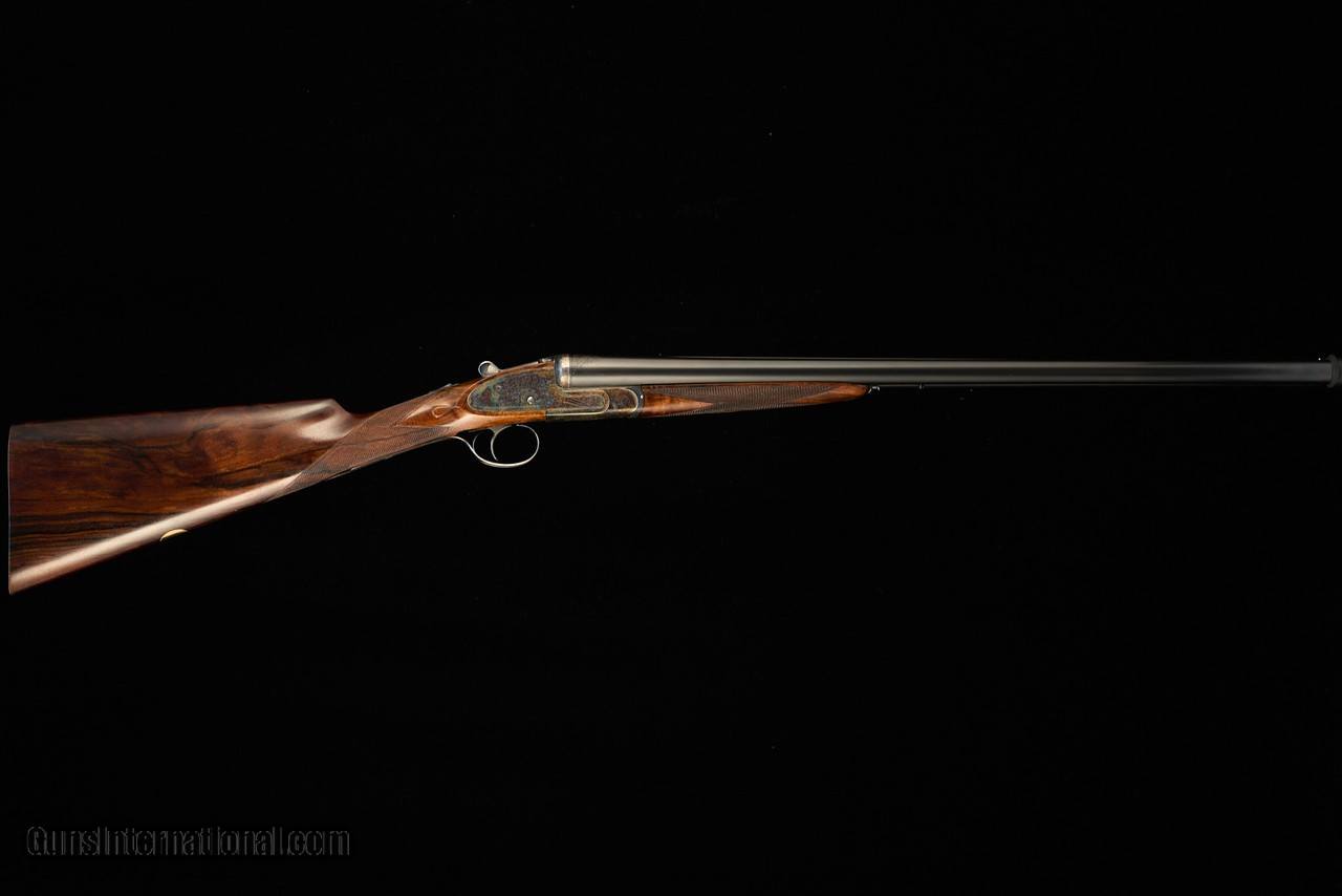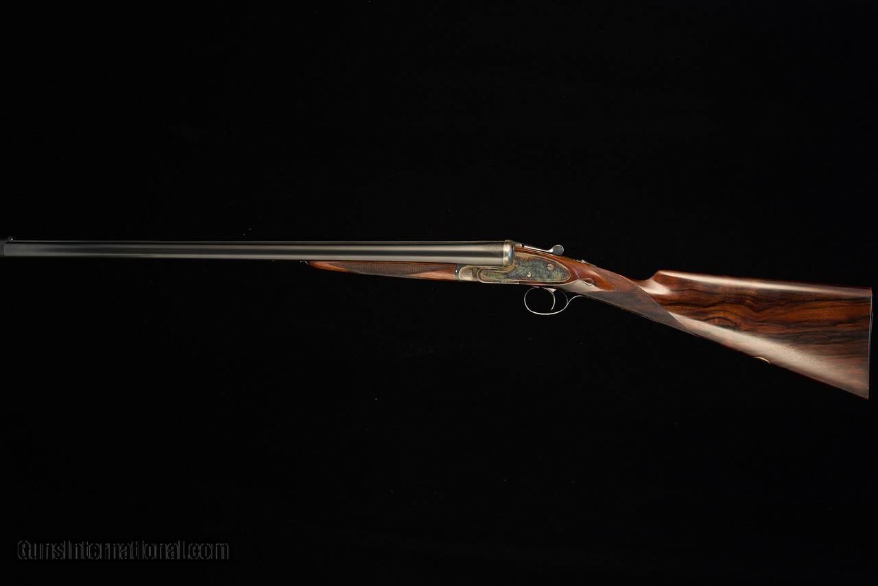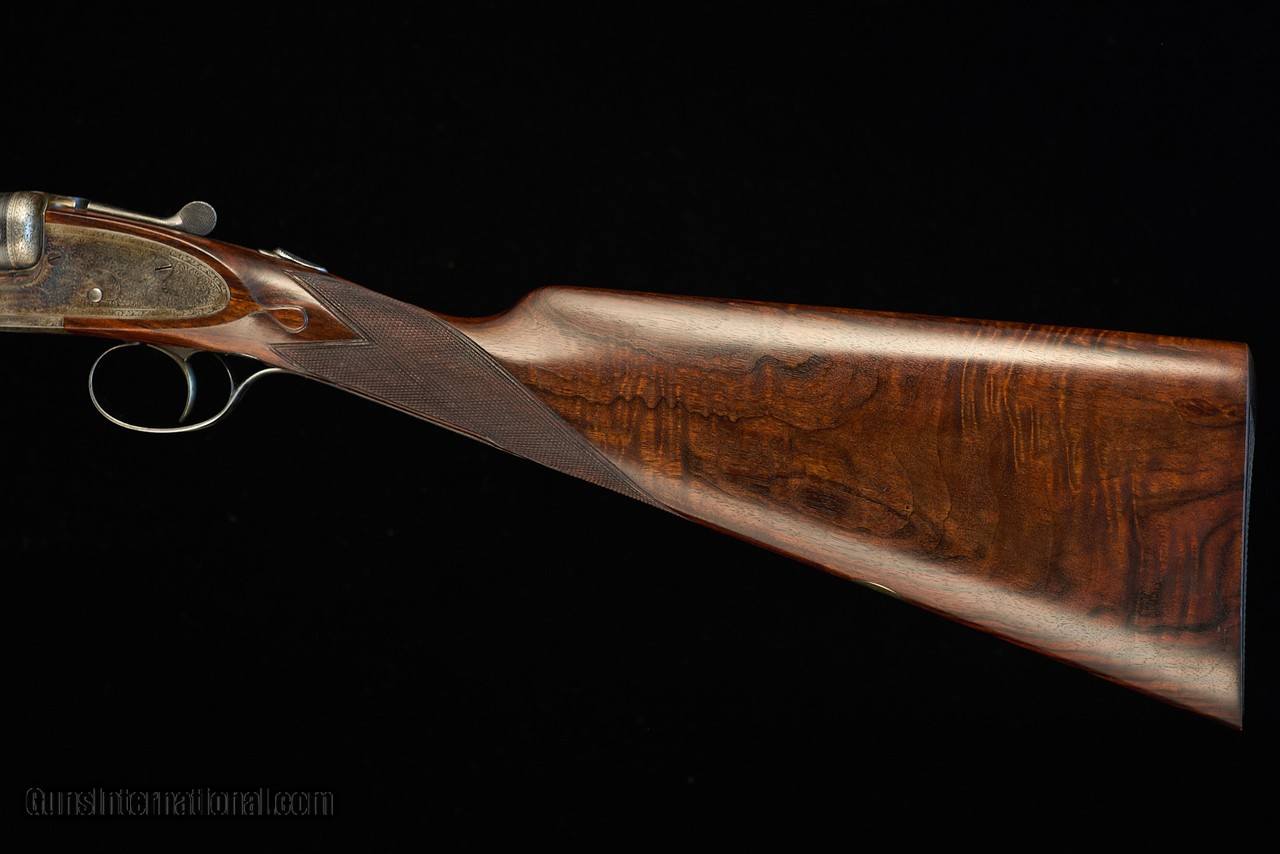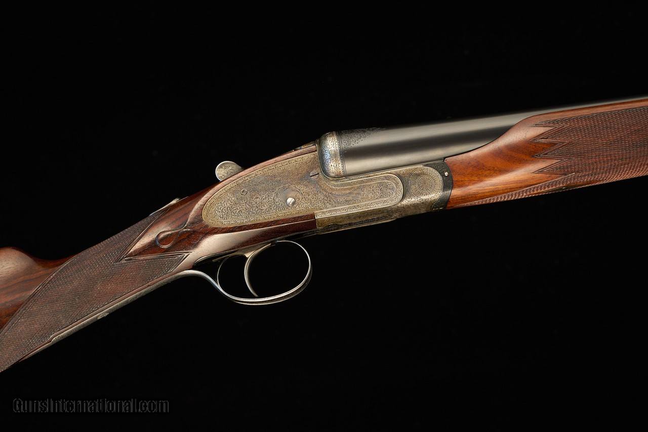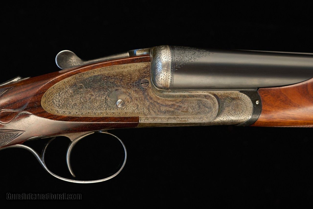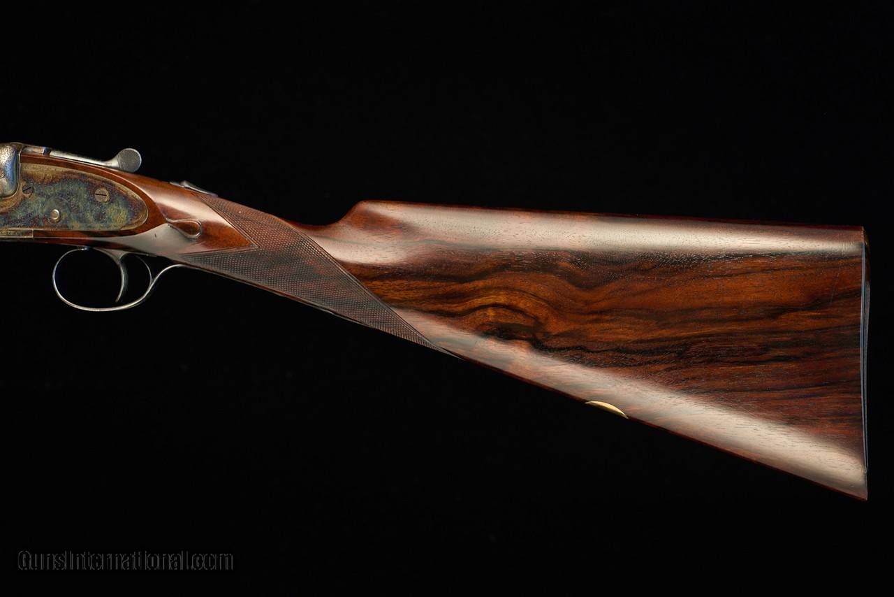 Straight hand grip, single trigger on a square bar action, pin-less locks, auto-safety, cross-filed raised Churchill rib, small brass front bead, hold open top lever, gold inlaid "SAFE" ahead of the safety catch, gold inlaid XXV on the rib, gold inlaid “1” and “2” on the top lever, rib, and forend iron tip, gold lined cocking indicators, vacant gold oval, drop points, maker's name in banners on both sides, double beaded trigger guard, an Anson push button forend release, checkered splinter forend and wrist with mullered borders. The guns are housed in a maker’s toe-under leather case with burgundy baize, maker’s label, two sets of snap caps, key, two-piece cleaning rod, jag, mop, and a brass brush. The extra set of beavertail forend barrels for each gun fit in the case. Circa early 1960s guns proofed in London at 3 ¼ tons with 2 ¾” chambers that measure the same.
