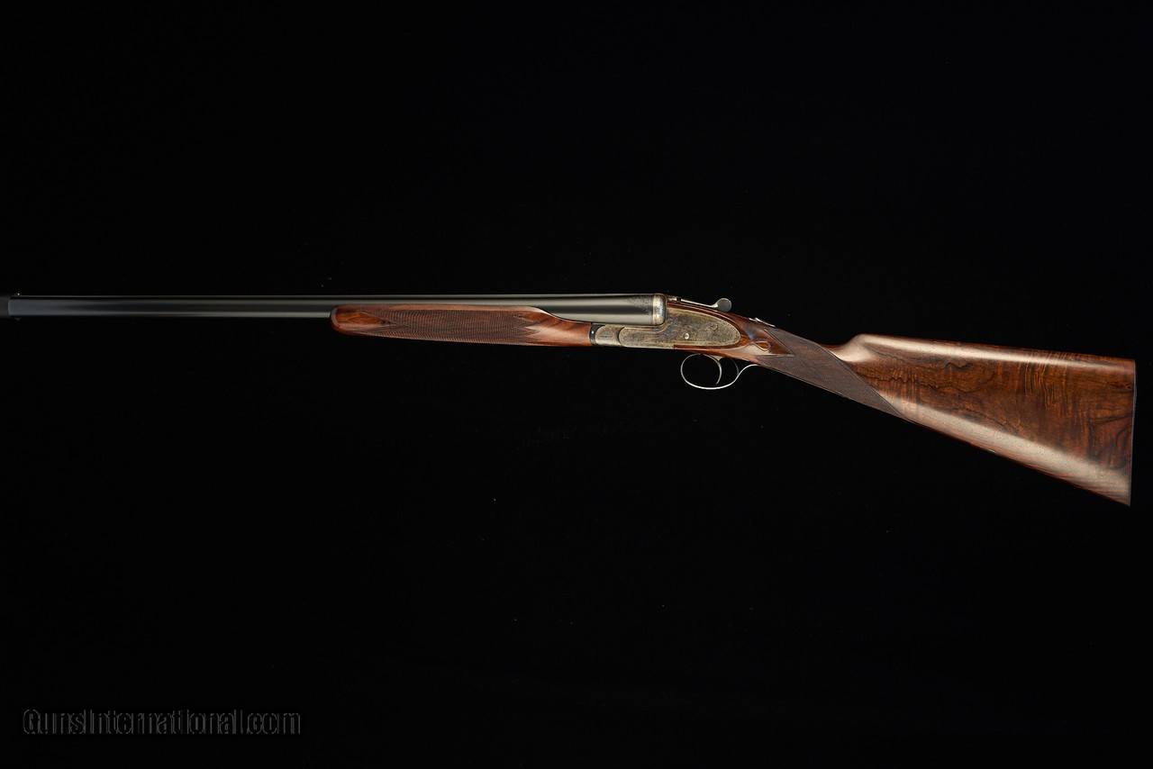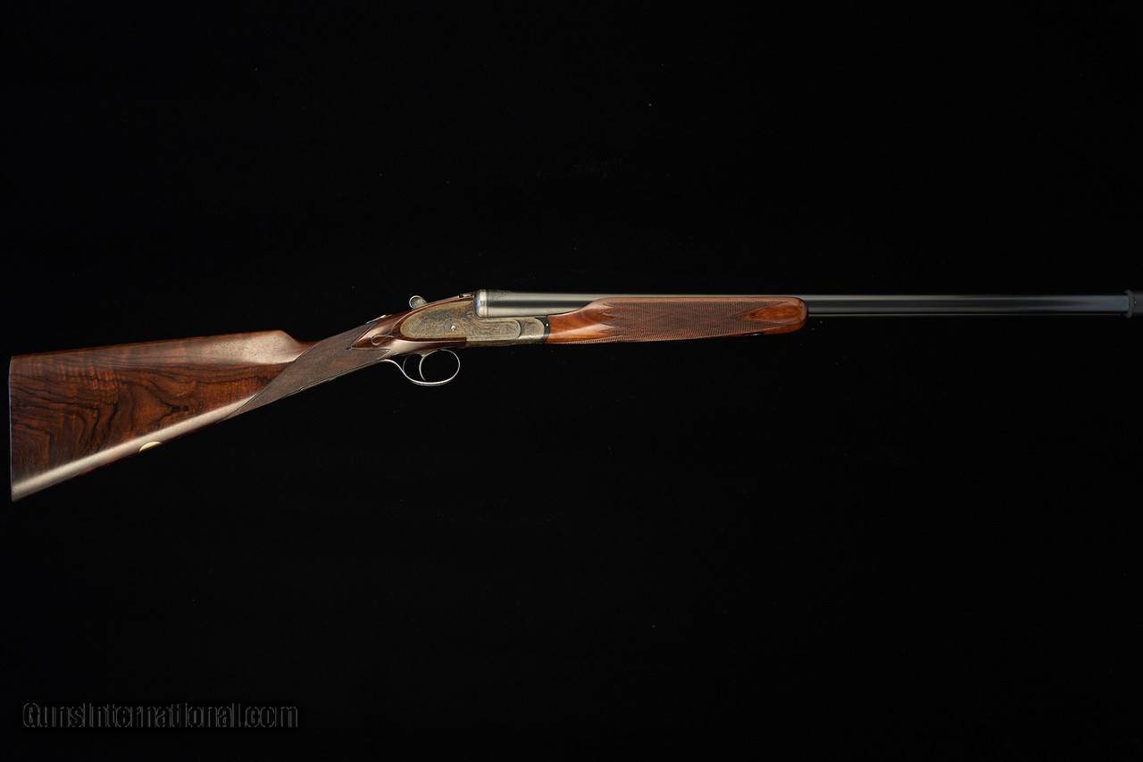 Description: Cased pair of EJ Churchill Premier 12 bore self-opening sidelock ejector guns with 25" barrels. Gun 1 is choked improved cylinder and modified with the second set of barrels choked full and full. Gun 2 is choked skeet and modified with the second set of barrels choked cylinder and cylinder. Length of pull of 15 3/8” over a checkered butt. Straight hand grip, single trigger on a square bar action, pin-less locks, auto-safety, cross-filed raised Churchill rib, small brass front bead, hold open top lever, gold inlaid "SAFE" ahead of the safety catch, gold inlaid XXV on the rib, gold inlaid “1” and “2” on the top lever, rib, and forend iron tip, gold lined cocking indicators, vacant gold oval, drop points, maker's name in banners on both sides, double beaded trigger guard, an Anson push button forend release, checkered splinter forend and wrist with mullered borders. The guns are housed in a maker’s toe-under leather case with burgundy baize, maker’s label, two sets of snap caps, key, two-piece cleaning rod, jag, mop, and a brass brush. The extra set of beavertail forend barrels for each gun fit in the case. Circa early 1960s guns proofed in London at 3 ¼ tons with 2 ¾” chambers that measure the same. Embellished with the very recognizable Churchill's Premier grade small scroll engraving. Case color hardened action and blued furniture. About 80% case colors remain on gun 1, gun 2 at about 60% with bottom straps silvering on both guns. Darker exhibition grade walnut stocks. Crisp and clean checkering and excellent stocks with minimal sign of field use in the form of some scratches. Excellent bores and bluing on barrels. Top lever at center position on gun 1 and slightly right of center on gun 2. Both guns remain on face and ejectors are in time. Gun 1 Serial #7,829 Gun 2 Serial #7,830 Manufacturer: E. J. Churchill Caliber Info: 12 Gauge Barrels: 25 Action: Side by Side Triggers: Double Gauge: 12 Gauge Stock Cast: 1/4" On LOP: 15 3/8 Chokes: Fixed Price: 13,900.00 Contact Seller |
