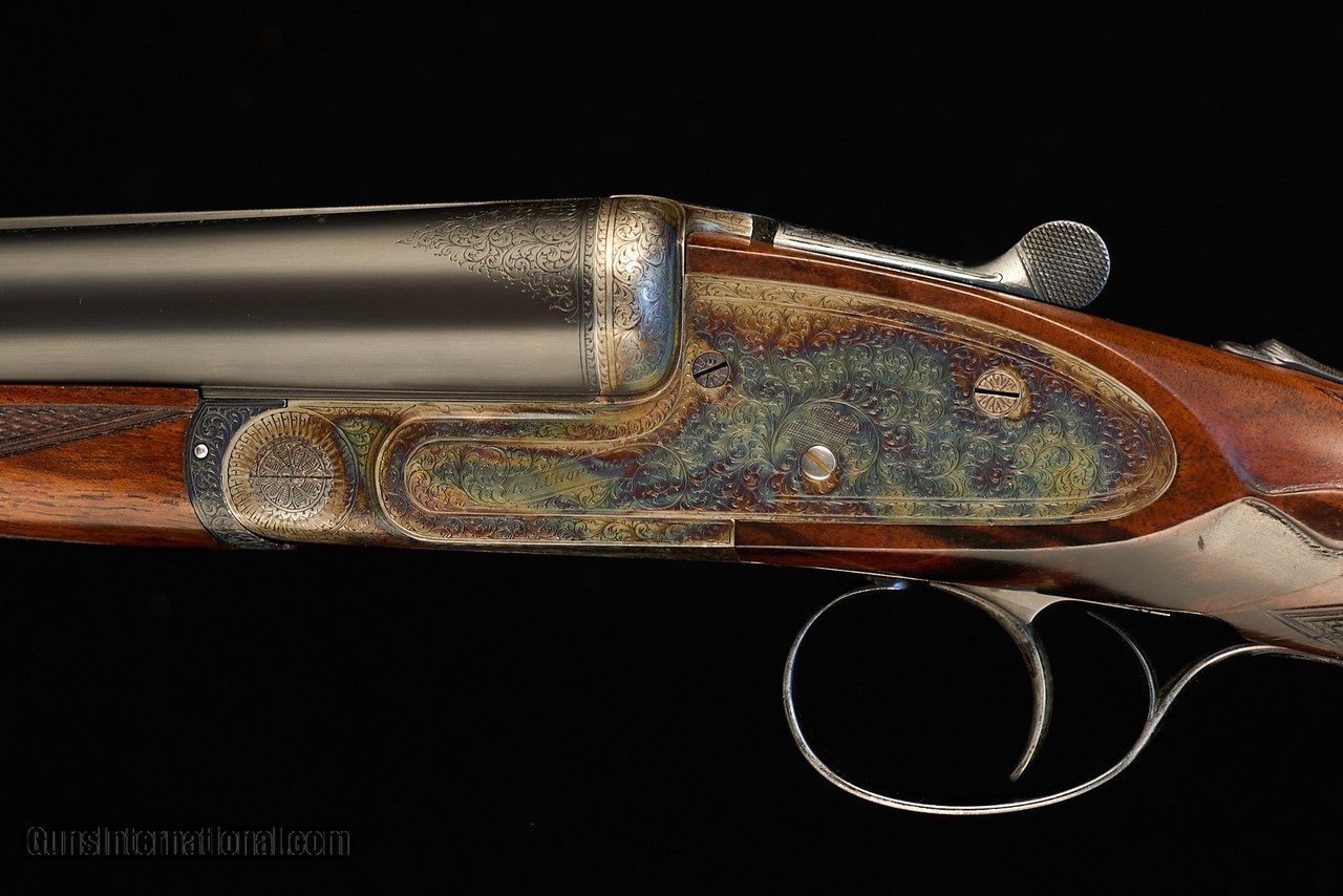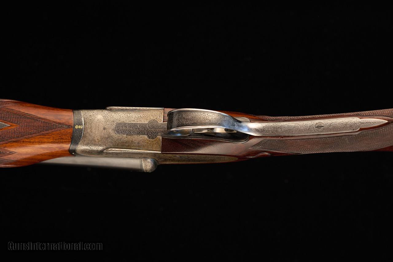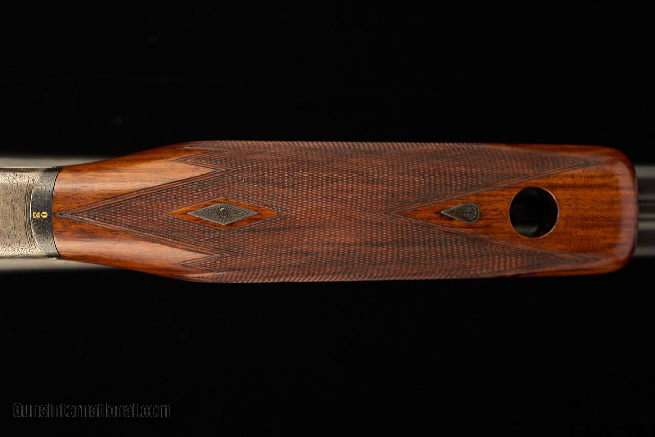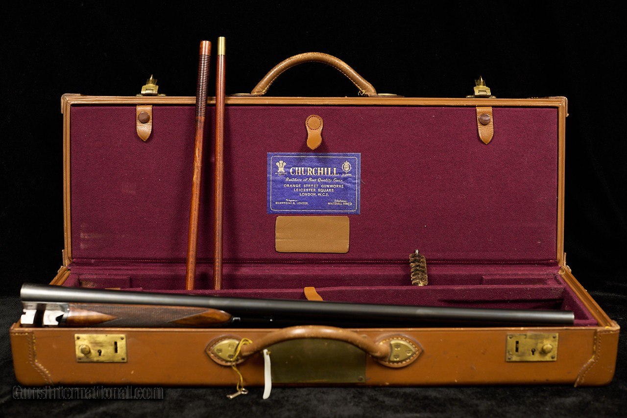 Embellished with the very recognizable Churchill's Premier grade small scroll engraving. Case color hardened action and blued furniture. About 80% case colors remain on gun 1, gun 2 at about 60% with bottom straps silvering on both guns. Darker exhibition grade walnut stocks. Crisp and clean checkering and excellent stocks with minimal sign of field use in the form of some scratches. Excellent bores and bluing on barrels. Top lever at center position on gun 1 and slightly right of center on gun 2. Both guns remain on face and ejectors are in time.