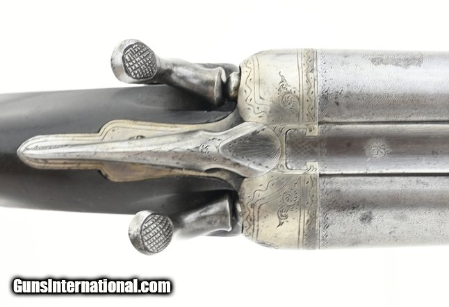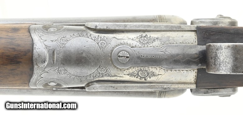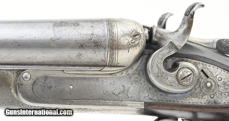 Description: " Parker Brothers Side by Side 12 Gauge shotgun. Hammer gun with 30” Damascus barrels. Manufactured in the 1880’s. Bores have pitting. Receiver and side locks have scroll engraving. Original butt plate has a repair at toe. Good to very good overall condition. A handsome side by side hammer gun.