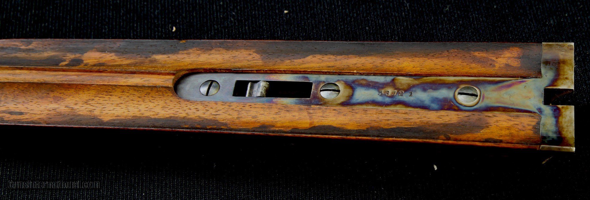 Description: Extremely fine and near mint early 12ga hammer gun. Made on a #1 Frame with 30" laminated barrels, this gun with splinter forend, double triggers, capped pistol grip buttstock with original Dogs Head buttplate. The gun is lightly engraved in typical Grade 1 Pattern. What makes this gun outstanding is its incredible original condition. The gun appears to have minor handling marks only and remains in near mint original condition throughout. The only area of loss is on the belly of the frame where the color has toned just a tad. Breech face appears unmarred. Hinge pin with gorgeous original high polish blue. Stocks are sound and excellent and retain nearly all of their original finish with only very minor handling marks. Buttplate is excellent with screws showing original color. Barrels are near mint with mirror bright bores. Mechanics are crisp and overall this gun is a gem. This gun is priced at $6995 shipped. Please dont hesitate to contact me at (704) 280-2382 or via PM on this site with any questions or reasonable offers. SOLD Antique: Yes Manufacturer: Parker Model: Grade 1 Barrel Length: 30 Chambers: 2-5/8 Condition: Near mint Metal Condition: Near Mint Wood Condition: Near mint Bore Condition: Brilliant and shiny Barrel Type: Laminated Triggers: Double Triggers Stock Comb: 2 Stock Heel: 3 Fore End: Splinter Forend LOP: 14-3/8 Weight: 7lbs 110z Choke Left: .754 with .023 choke Choke Right: .754 with .036 choke Minimum Wall Thickness Left: .035 Minimum Wall Thickness Right: .028 |