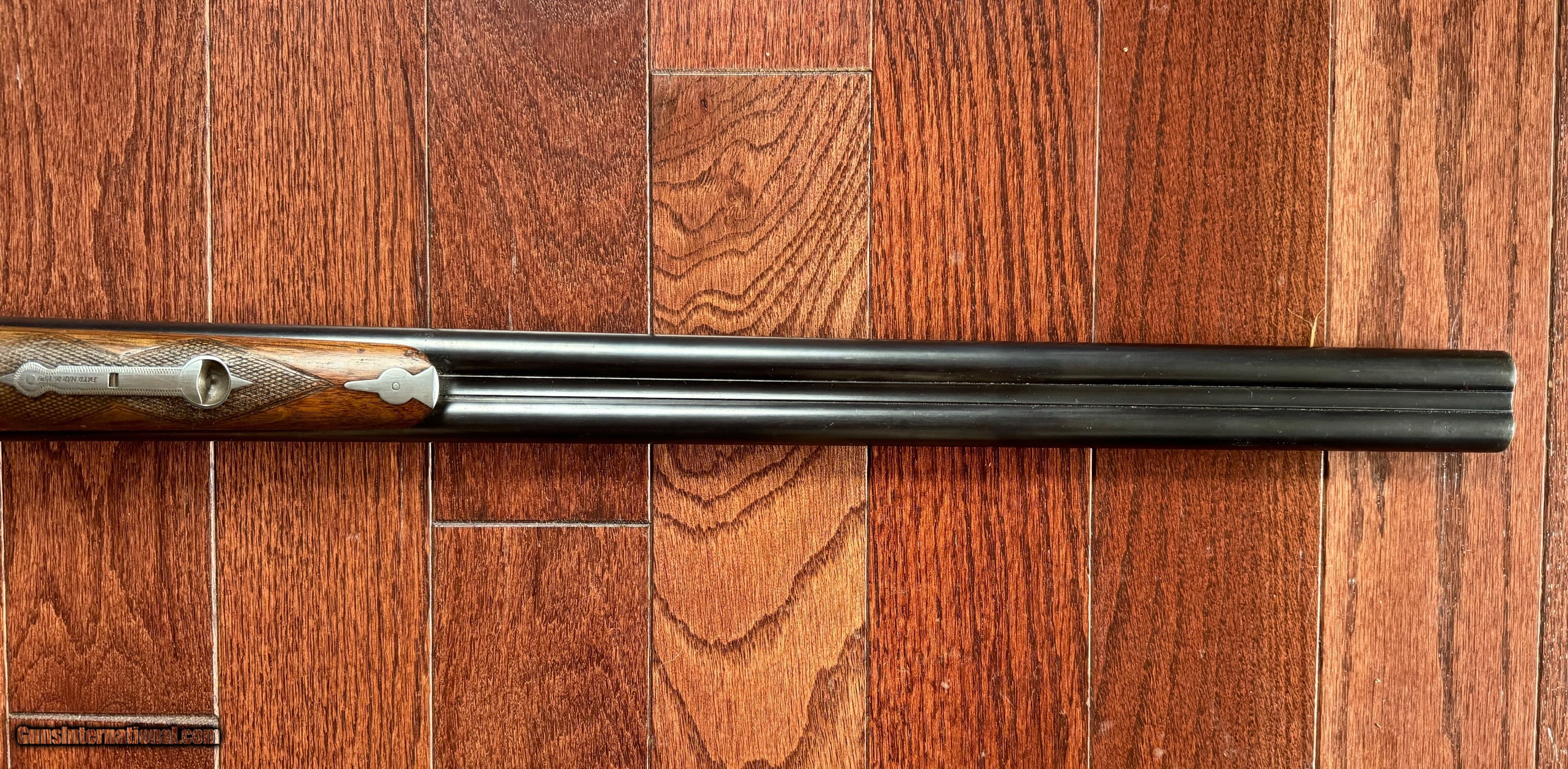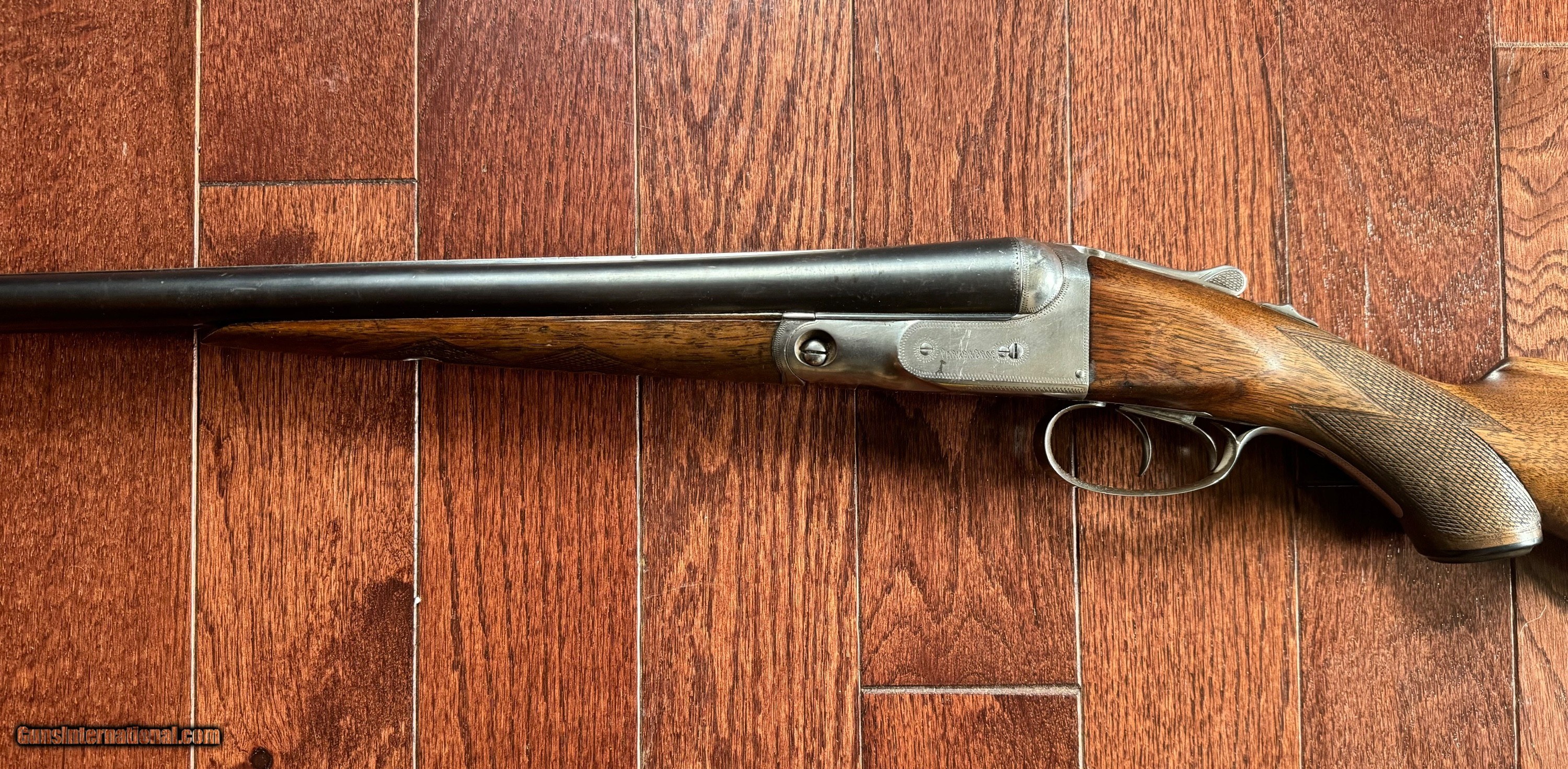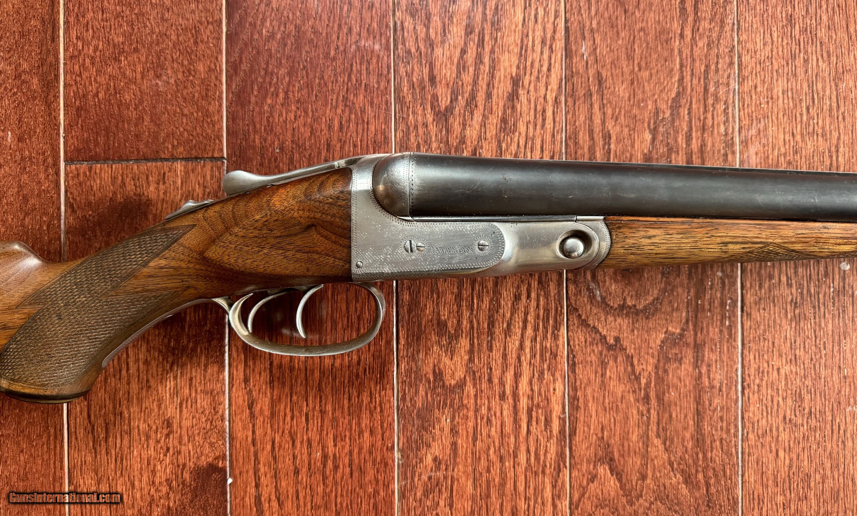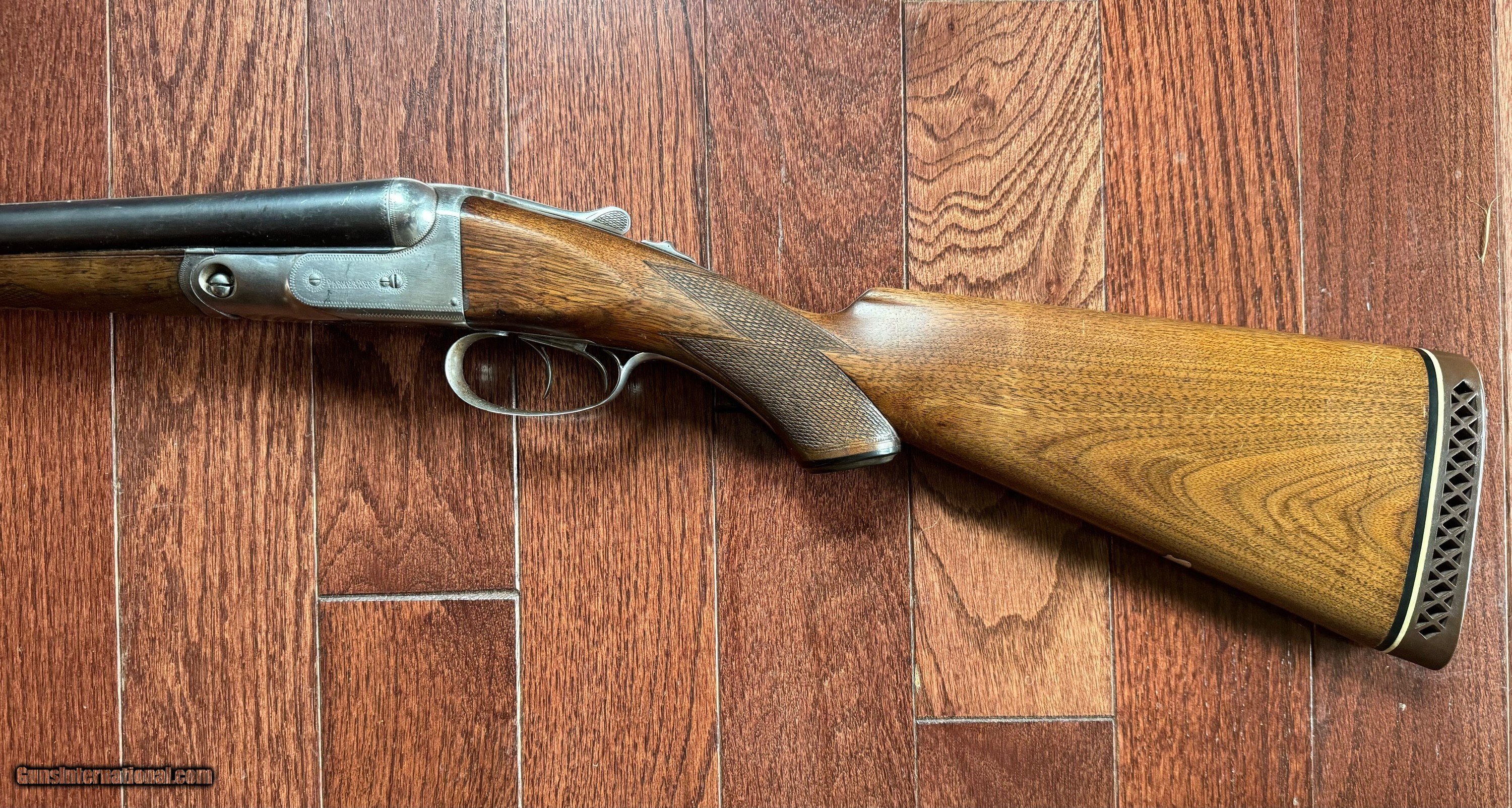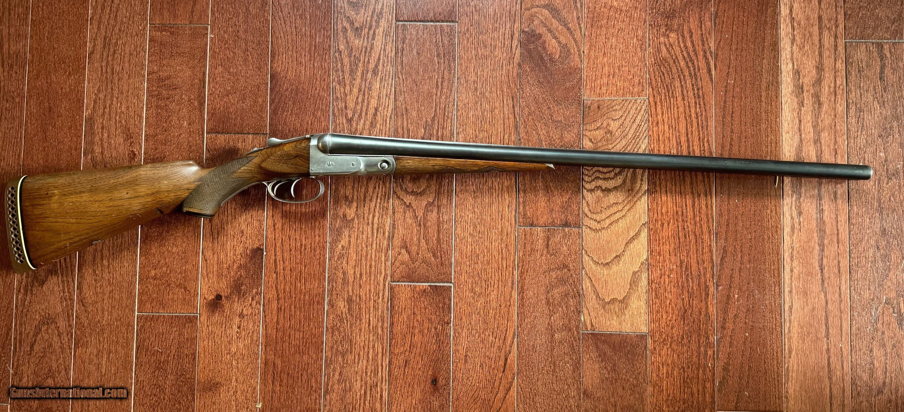 Description: FINAL PRICE REDUCTION!! Parker Brothers 16G V grade side by side shotgun. 2 trigger 26" bbl with silver receiver/action with fine sewing stitch engraving. Barrel address top of rib Parker Brothers, Makers, Meriden, Conn. Vulcan Steel. Extractors. Solid rib with single silver front bead. Case hardened color in protected areas only. Beautiful deep grain walnut wood checkered stock with silver inlaid medalion for initials. Pistol grip with Parker Bros Meriden Conn. cap. Stock length corresponds to factory length - 14.25". Tang safety and bbl release. Frame size 1. 1908 manufacture. Ser. #147xx9. All parts match serial number. Rubber recoil pad. Metal in good condition. Wood in very good condition with minor dings, scratches and one 1/2" long divet on right front of buttstock behind pistol grip. See photos. SOLD Curio/Relic: Yes Shotgun Gauge: 16 Gauge Manufacturer: Parker Brothers Model: V Grade Serial Number: 147xx9 Barrel Length: 26” Ejectors: Extractors Condition: Excellent Metal Condition: Very good Wood Condition: Very good Bore Condition: Shiny, clean Barrel Type: Side by Side Triggers: Two Manufacture Date: 1908 Item Location: Oregon |
