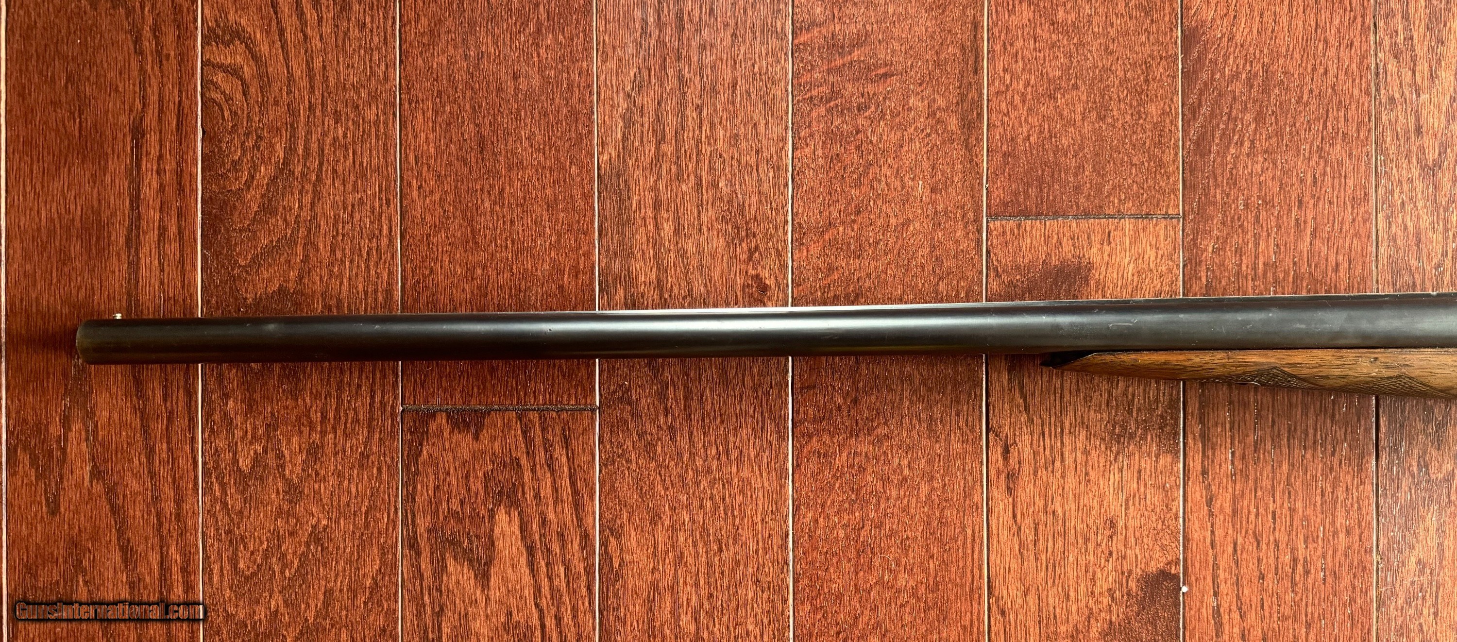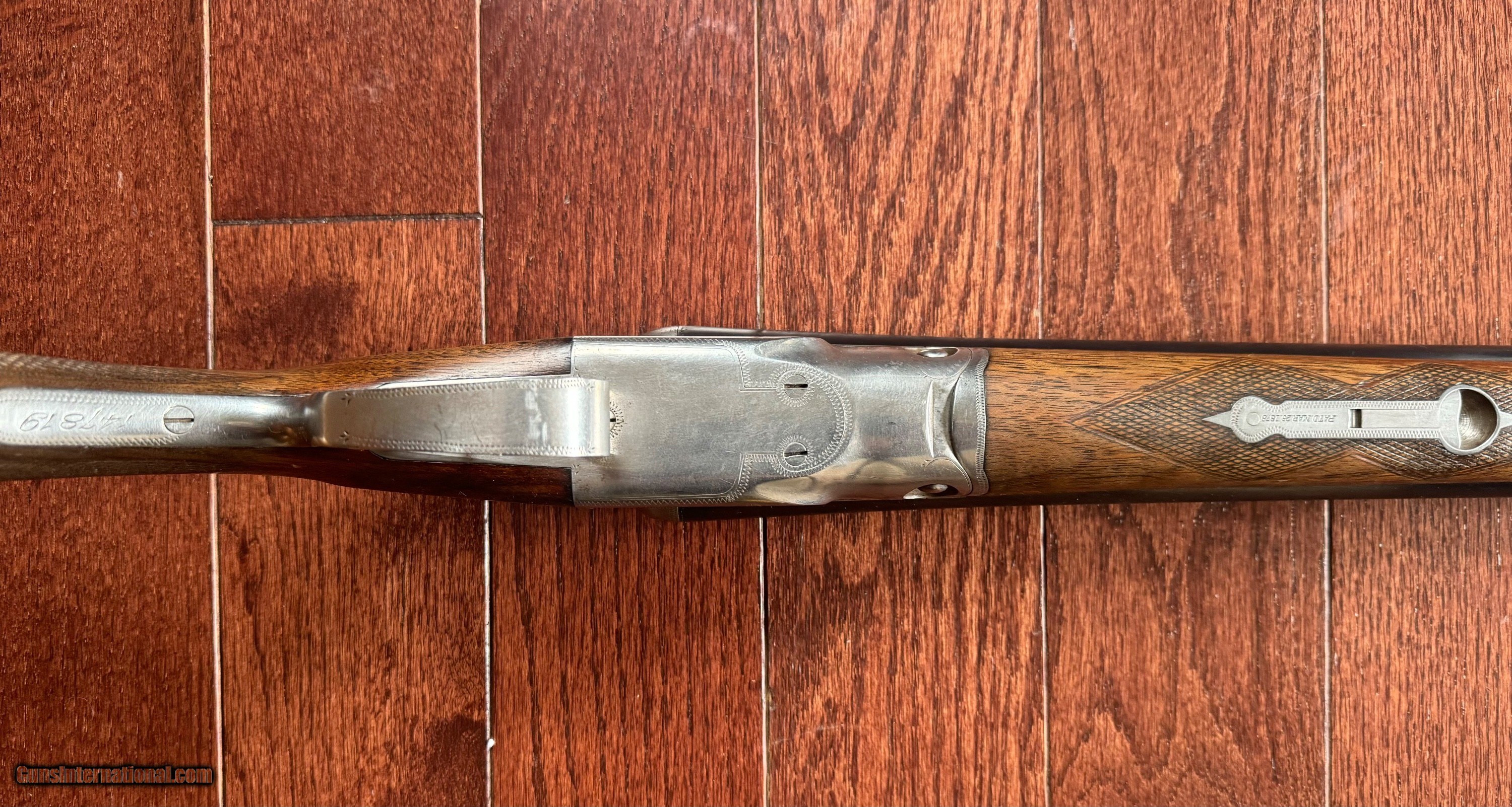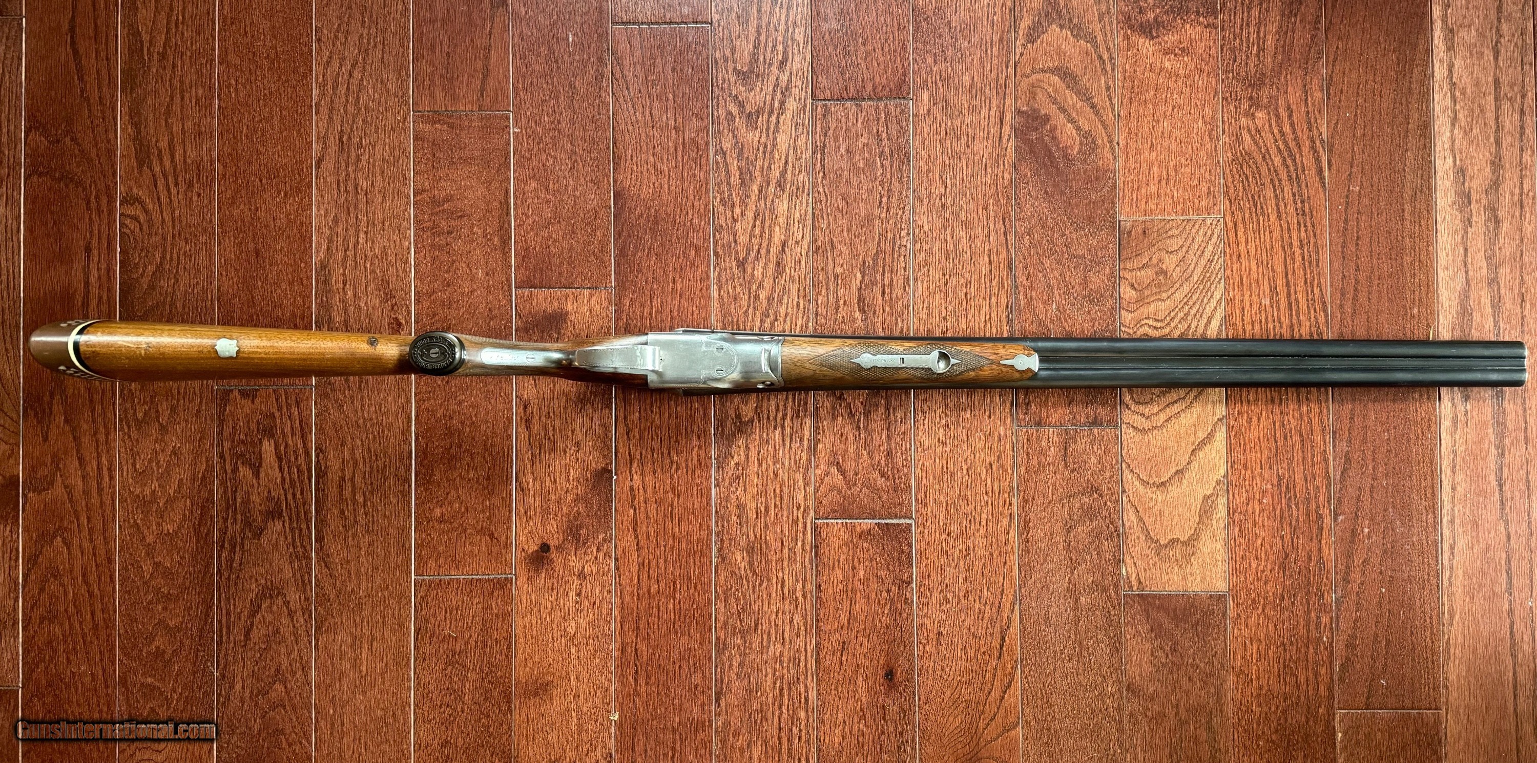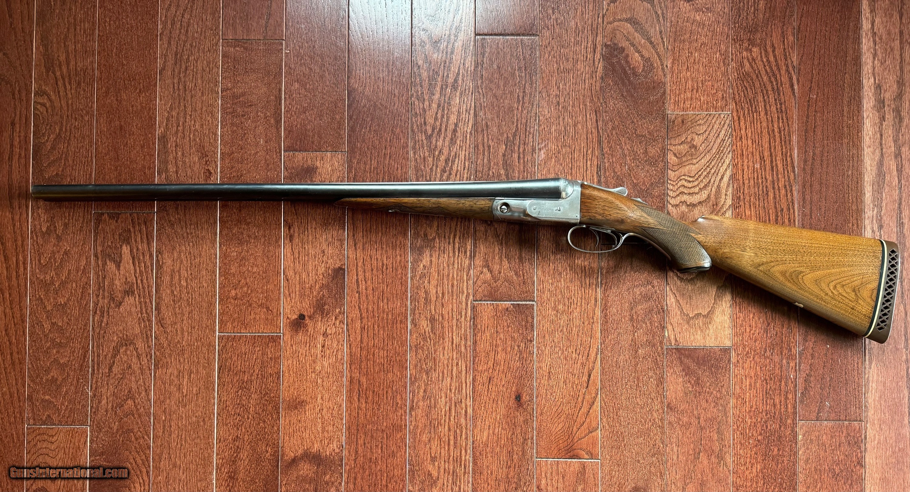 Description: FINAL PRICE REDUCTION!! Parker Brothers 16G V grade side by side shotgun. 2 trigger 26" bbl with silver receiver/action with fine sewing stitch engraving. Barrel address top of rib Parker Brothers, Makers, Meriden, Conn. Vulcan Steel. Extractors. Solid rib with single silver front bead. Case hardened color in protected areas only. Beautiful deep grain walnut wood checkered stock with silver inlaid medalion for initials. Pistol grip with Parker Bros Meriden Conn. cap. Stock length corresponds to factory length - 14.25". Tang safety and bbl release. Frame size 1. 1908 manufacture. Ser. #147xx9. All parts match serial number. Rubber recoil pad. Metal in good condition. Wood in very good condition with minor dings, scratches and one 1/2" long divet on right front of buttstock behind pistol grip. See photos. SOLD Curio/Relic: Yes Shotgun Gauge: 16 Gauge Manufacturer: Parker Brothers Model: V Grade Serial Number: 147xx9 Barrel Length: 26” Ejectors: Extractors Condition: Excellent Metal Condition: Very good Wood Condition: Very good Bore Condition: Shiny, clean Barrel Type: Side by Side Triggers: Two Manufacture Date: 1908 Item Location: Oregon |