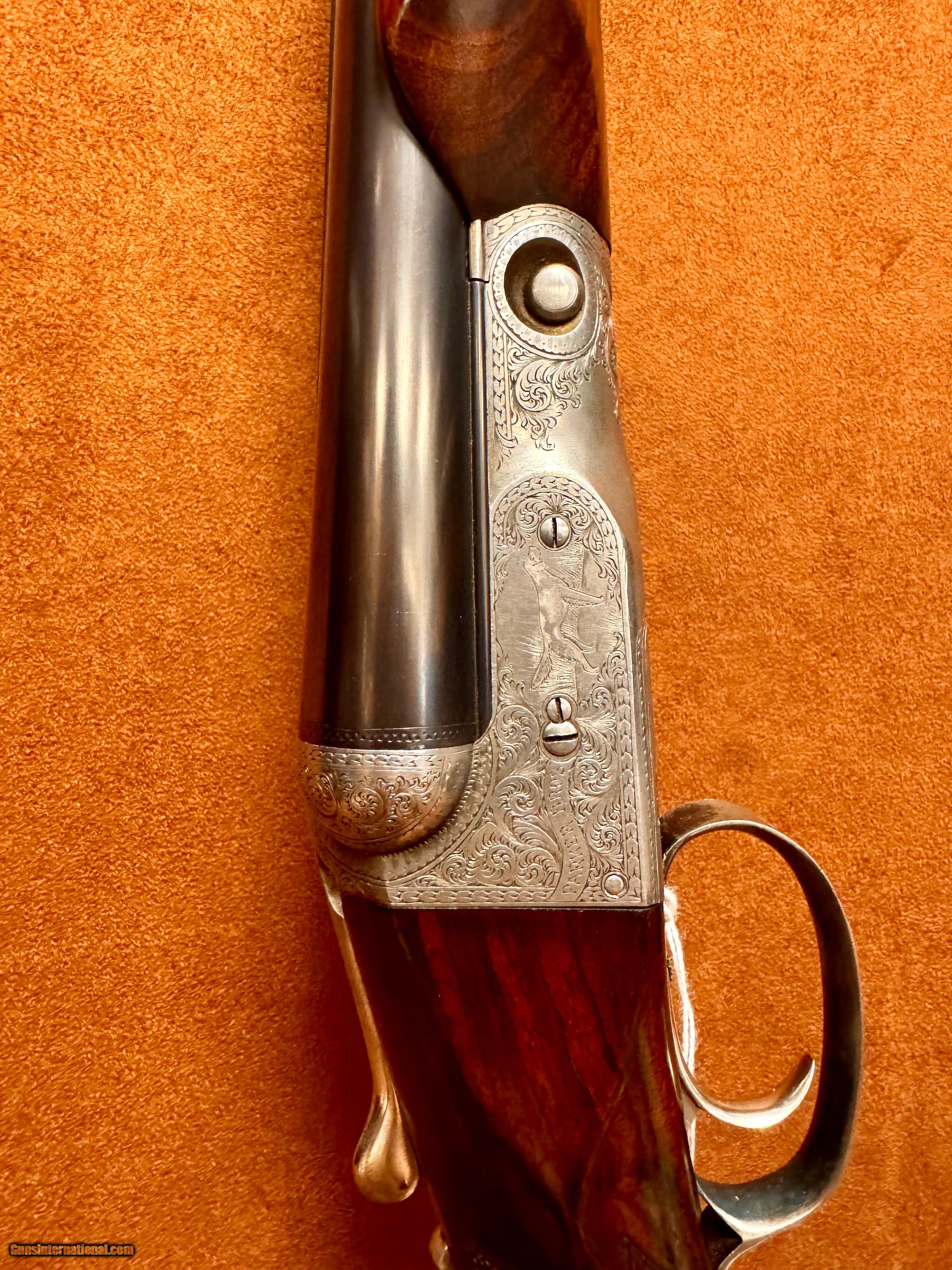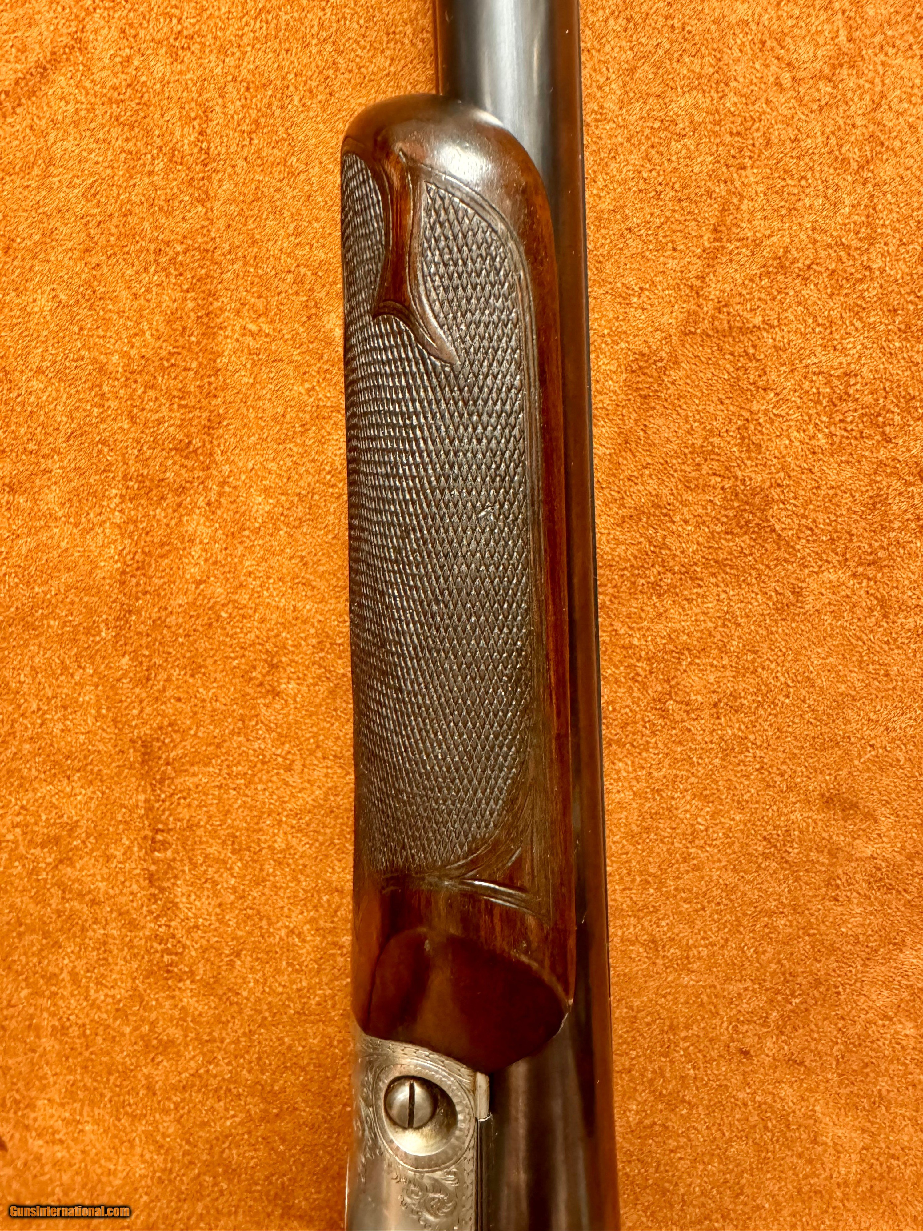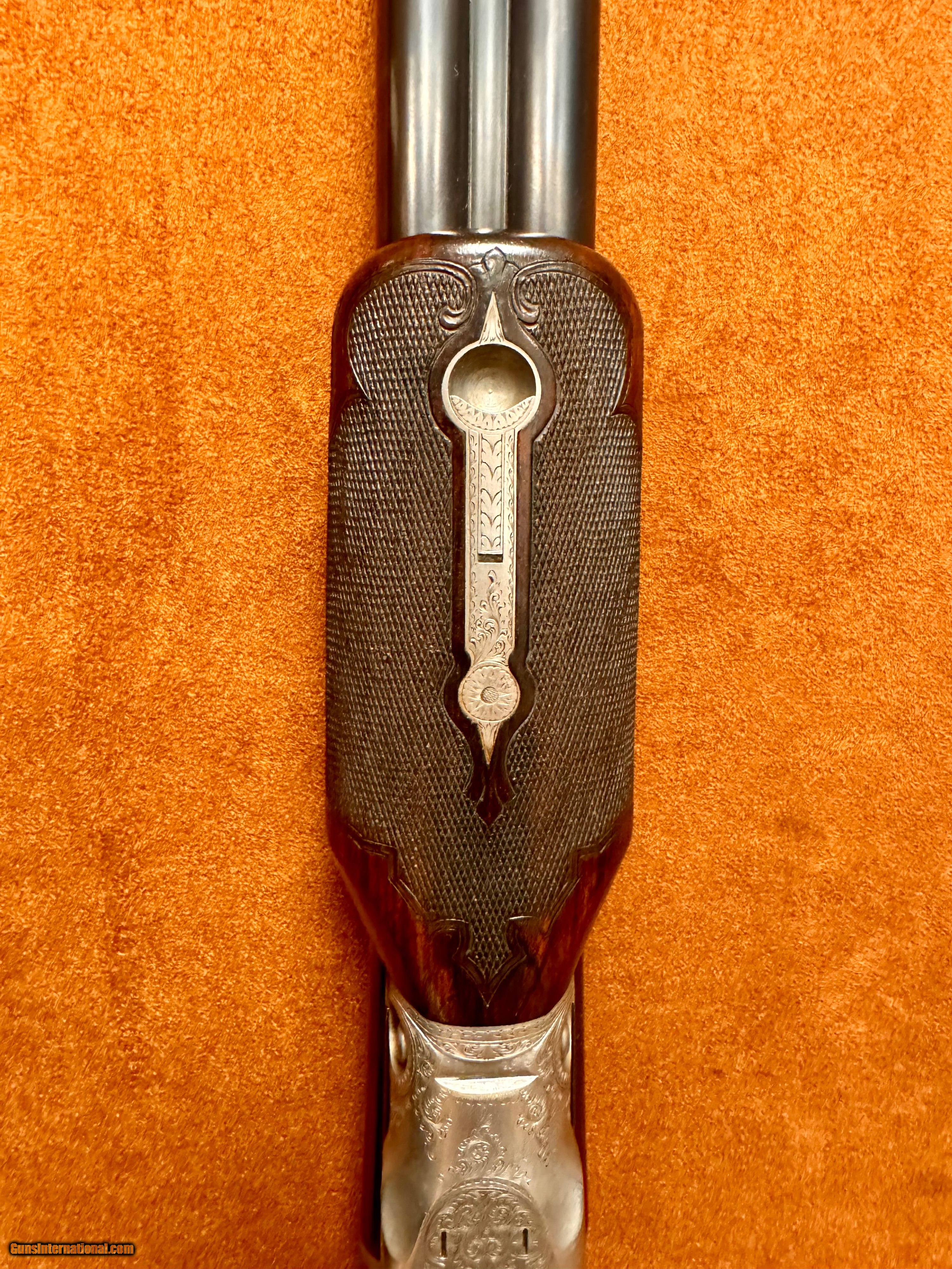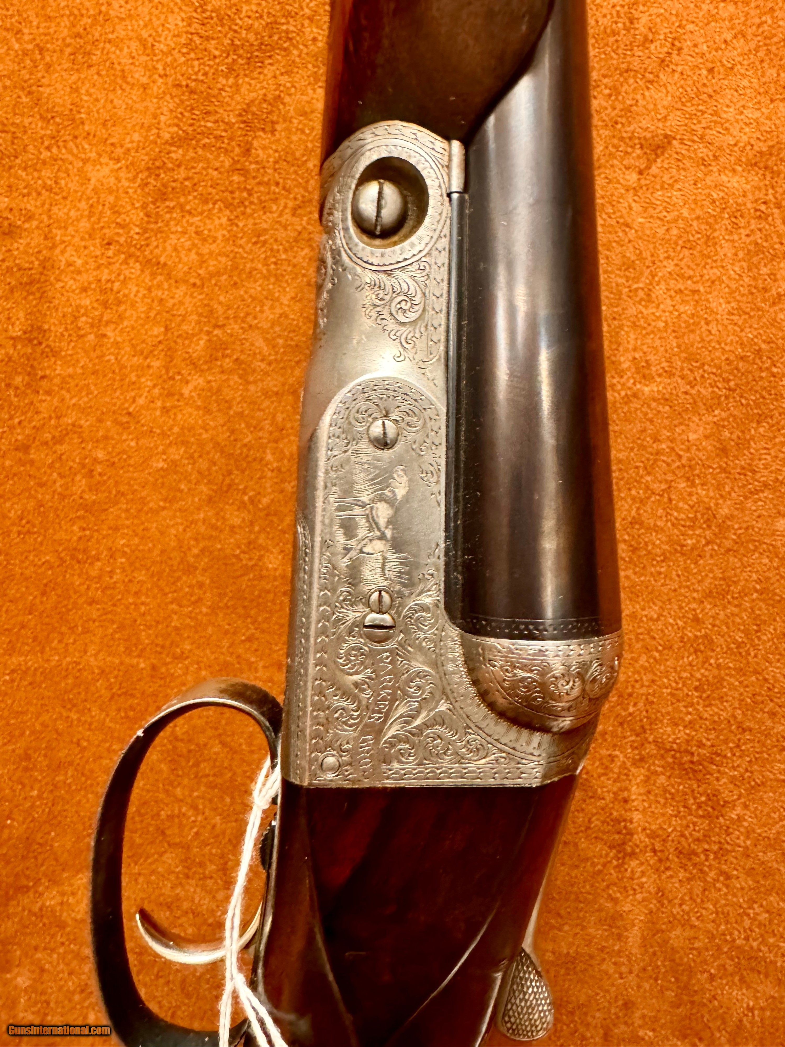 Description: JUST IN ROYAL SPORTING ARMS PARKER CHE 12GA-30'' SPECTACULAR ENGRAVING This gun is beautifully engraved in the C grade style engraving. It features a pointer on each side. The bottom of the frame has a mallard rising out of the slough. The engraving is crisp with about 25% original case color remaining. 30 inch barrels are choked Full and Full and retain about 95% blue. Barrels are marked with Parker Brothers overload proofing and made of Acme Steel. Pistol grip checkered deluxe wood. DAC is 1-5/8 inches. DAH is 2-1/2 inches. This sharp little shotgun should make a great shooter. This PARKER CHE mounts and points like Magic in the Field and is a true joy to carry and shoot! For immediate assistance please call/text 954-676-0714 TRADES ALWAYS WELCOME!! SOLD |