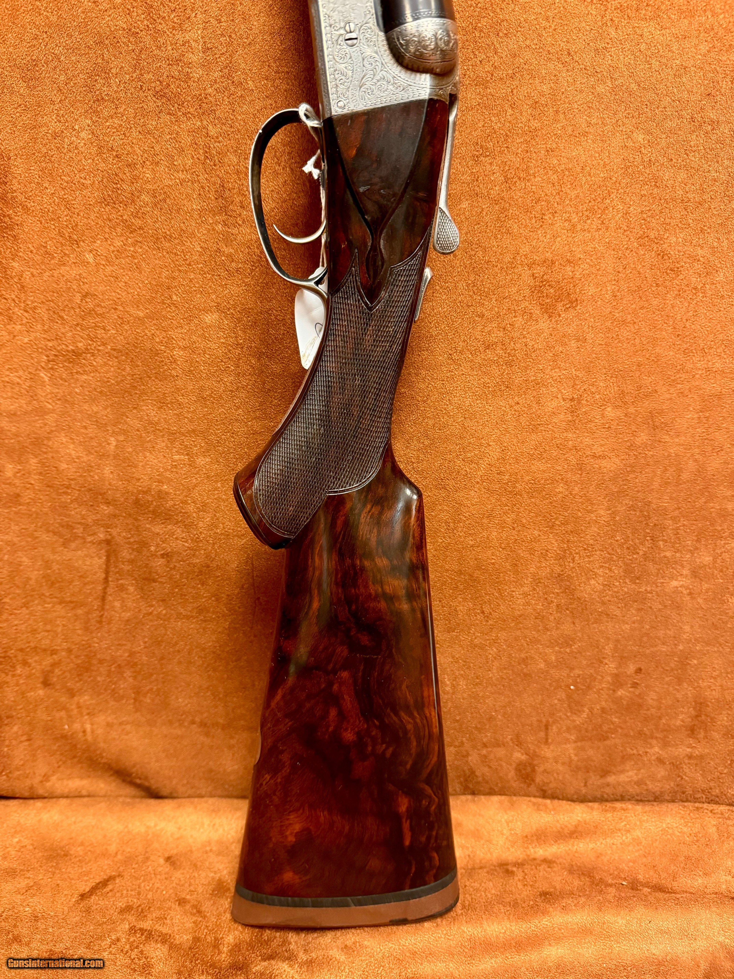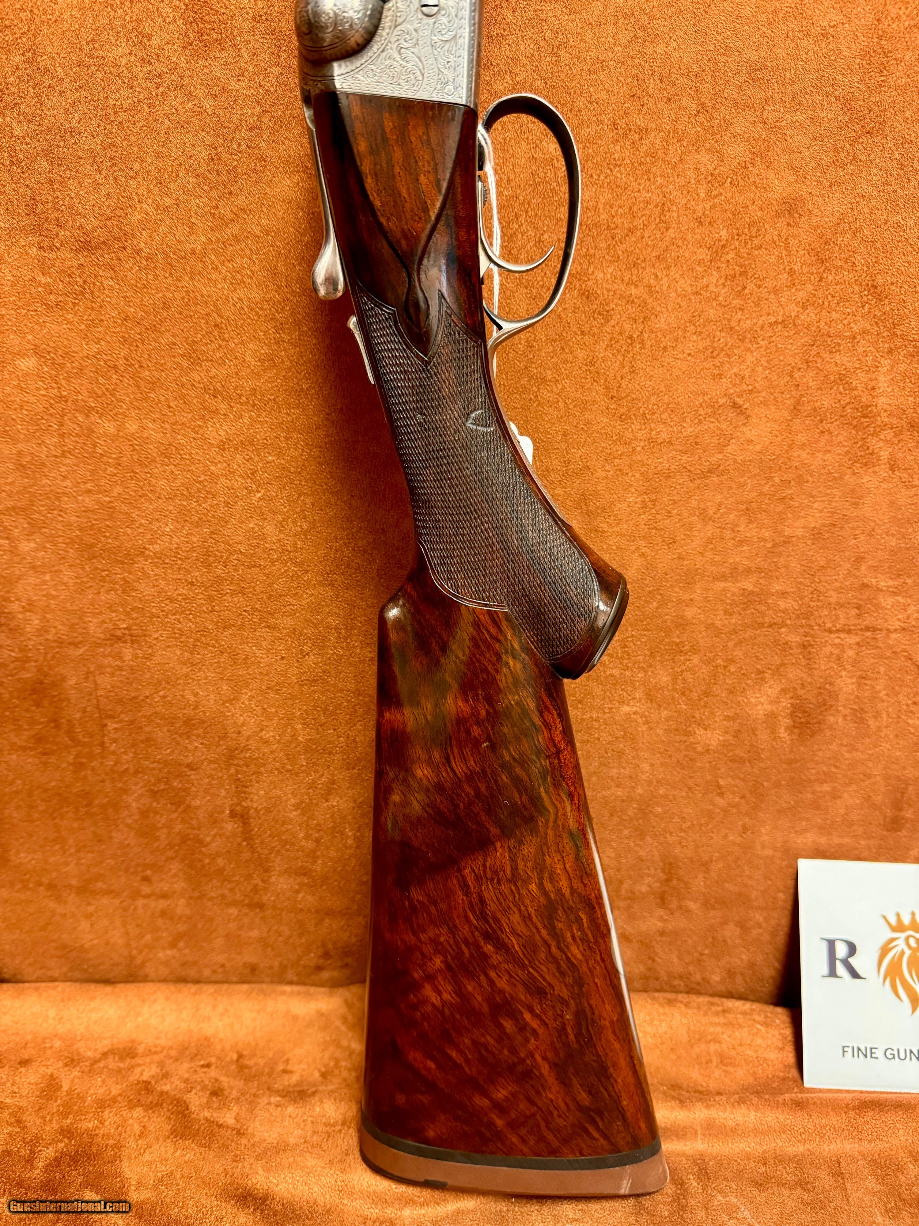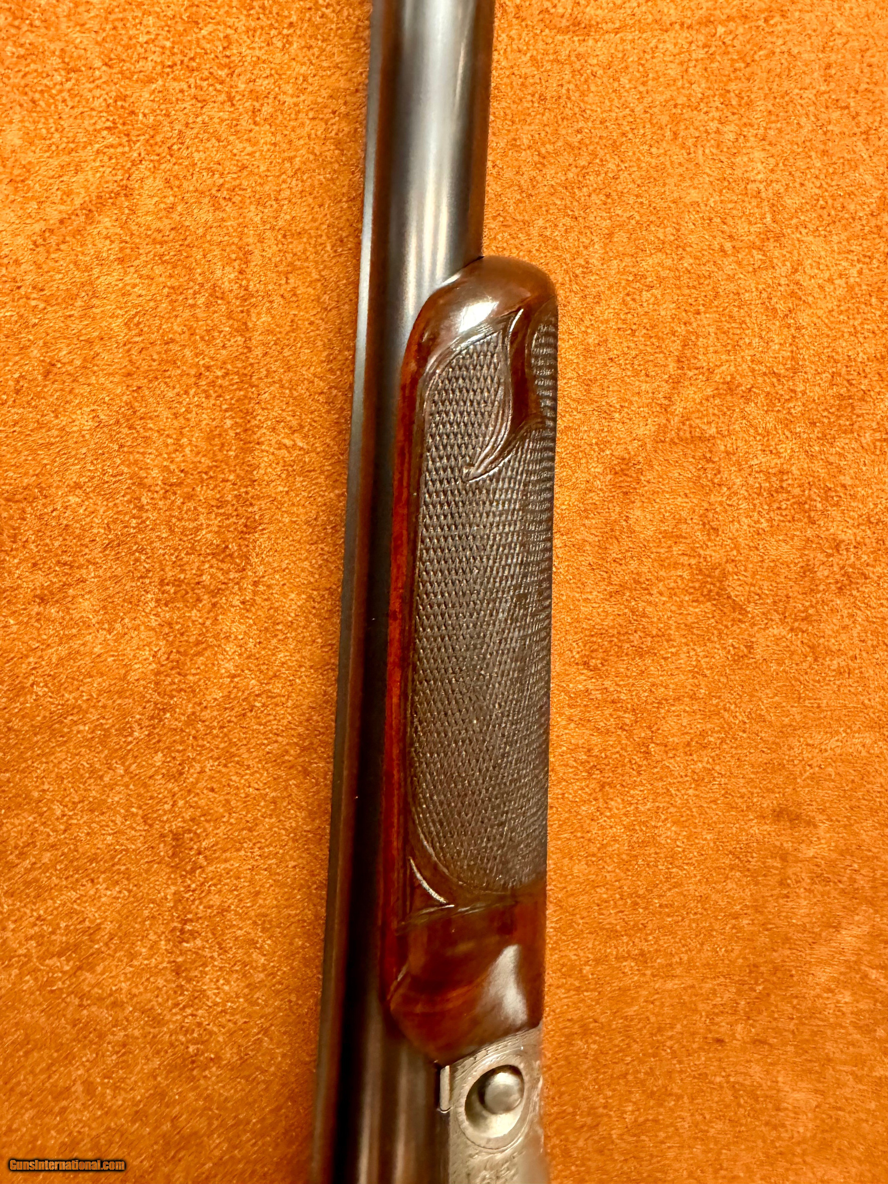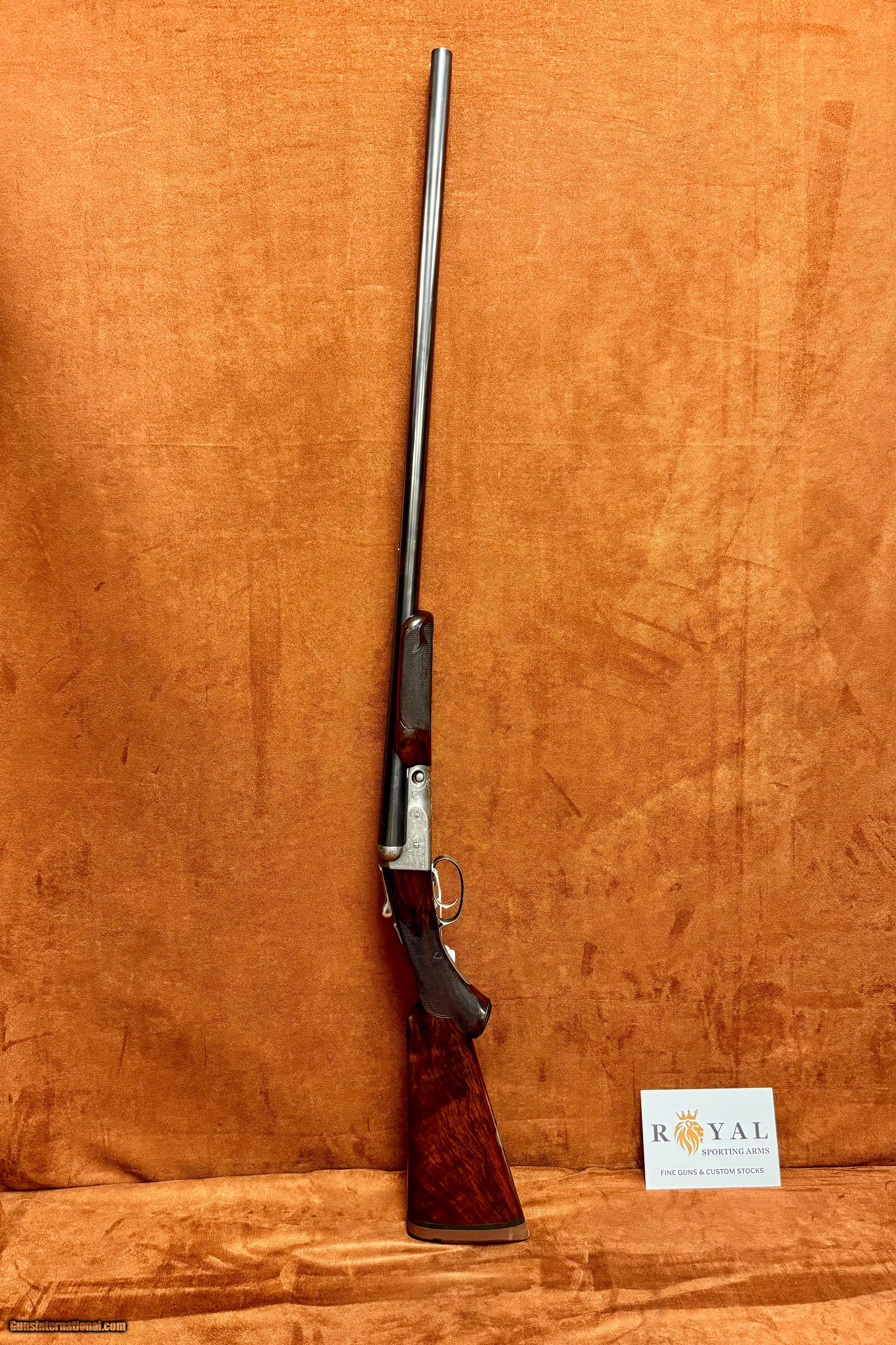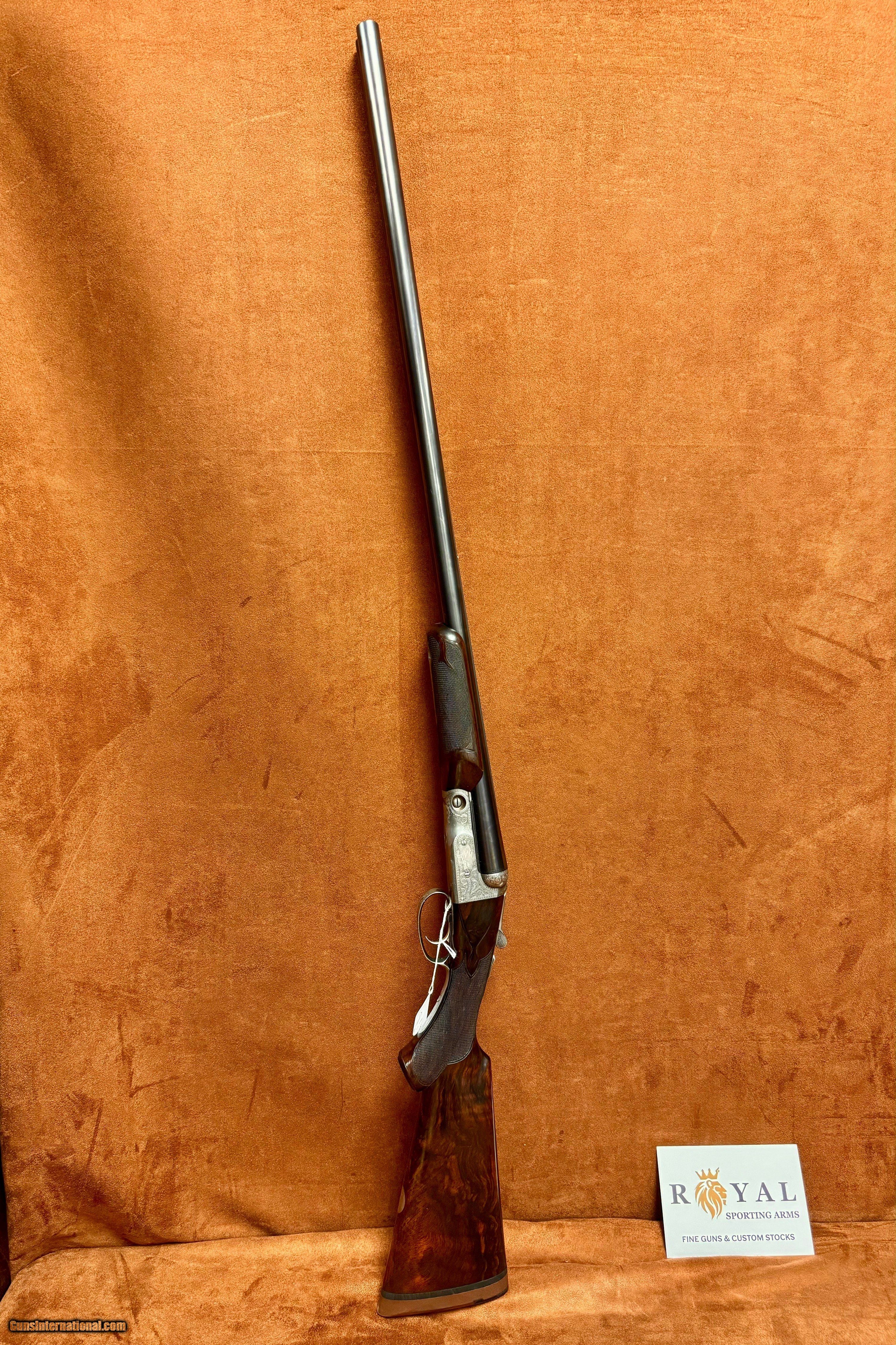 Description: JUST IN ROYAL SPORTING ARMS PARKER CHE 12GA-30'' SPECTACULAR ENGRAVING This gun is beautifully engraved in the C grade style engraving. It features a pointer on each side. The bottom of the frame has a mallard rising out of the slough. The engraving is crisp with about 25% original case color remaining. 30 inch barrels are choked Full and Full and retain about 95% blue. Barrels are marked with Parker Brothers overload proofing and made of Acme Steel. Pistol grip checkered deluxe wood. DAC is 1-5/8 inches. DAH is 2-1/2 inches. This sharp little shotgun should make a great shooter. This PARKER CHE mounts and points like Magic in the Field and is a true joy to carry and shoot! For immediate assistance please call/text 954-676-0714 TRADES ALWAYS WELCOME!! SOLD |