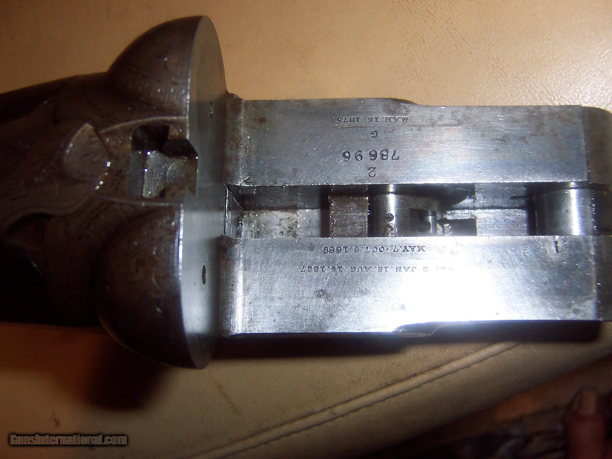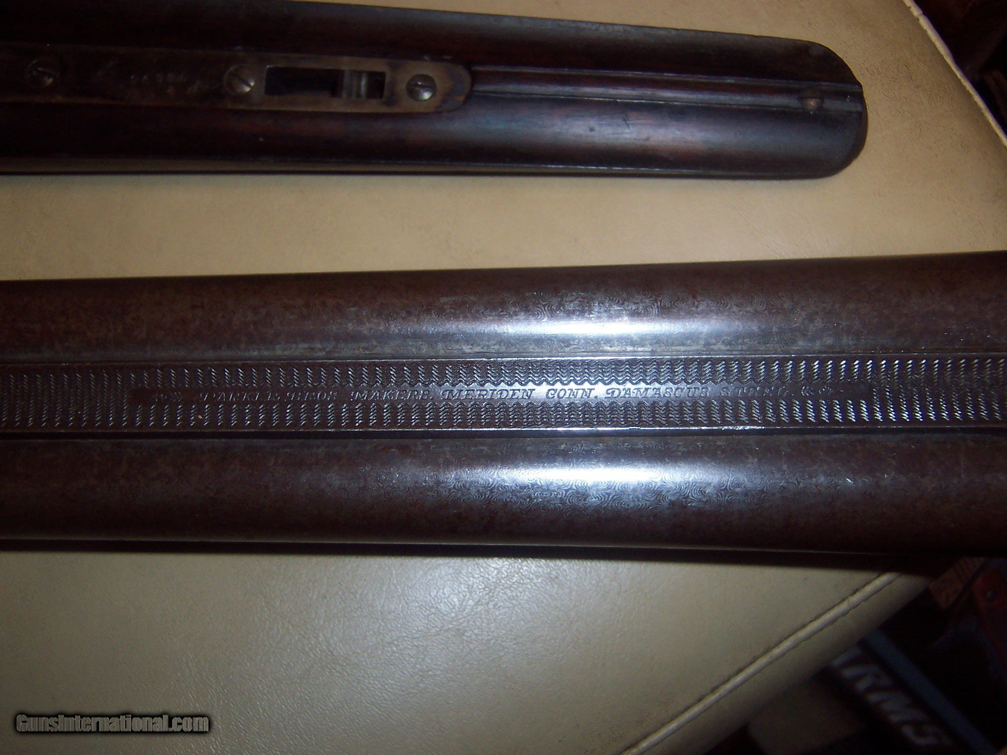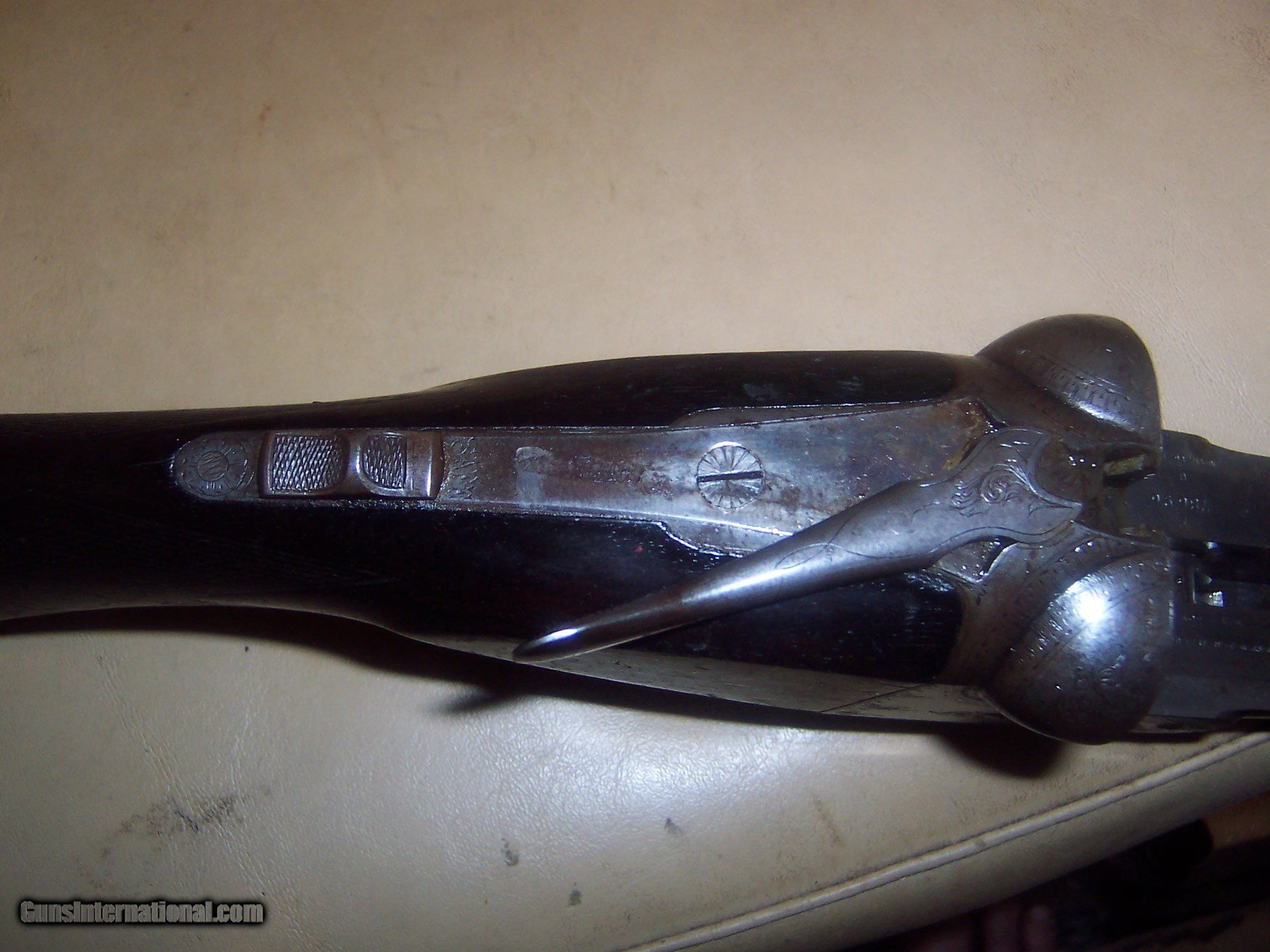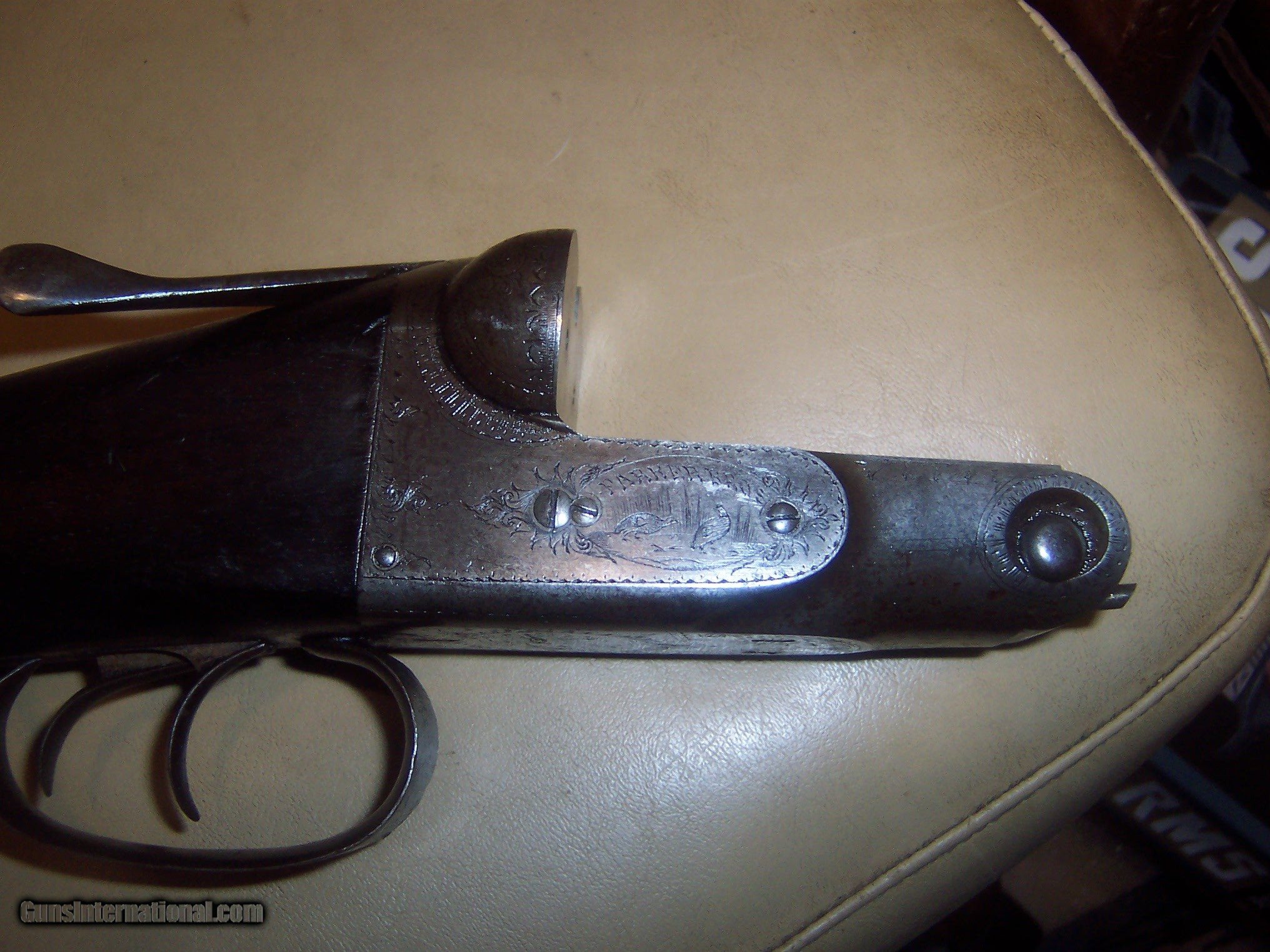 Description: all original / pistol grip cap a replacement // 26 inch barrels with almost mint bores / some microscopic pitting // locks up tight / checkering shows some wear but metal has no pitting / the engraving is crisp / // serial # 78696 matches made 1893// every thing works well// antique ship to your door // great gun for black powder shooting / buy any 2 items & get a 5% discount and free shipping/// see other parkers i have for sale // used but not abused good for another 130 years// extractors // damascus barrels with some damascus pattern visable// $59 sh// center ivory bead sight// solid stock looks un sanded// some case visableb inside of forearm but receiver has silvered out/ FREE CASE SOLD Antique: Yes Manufacturer: parker Model: g |