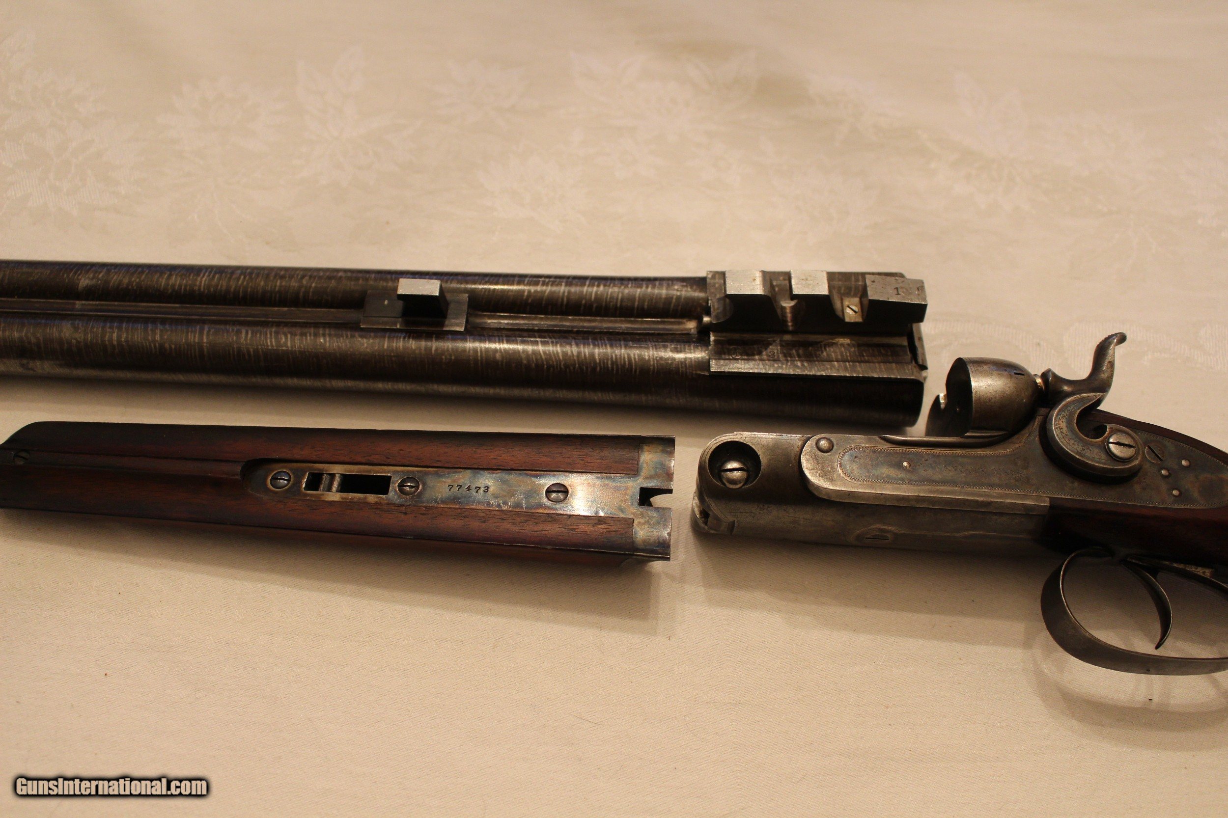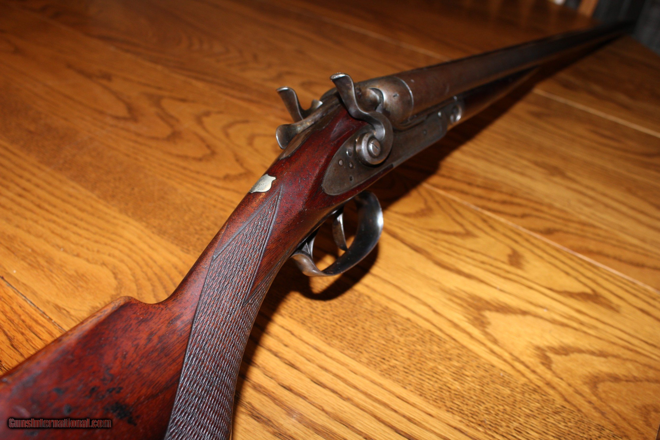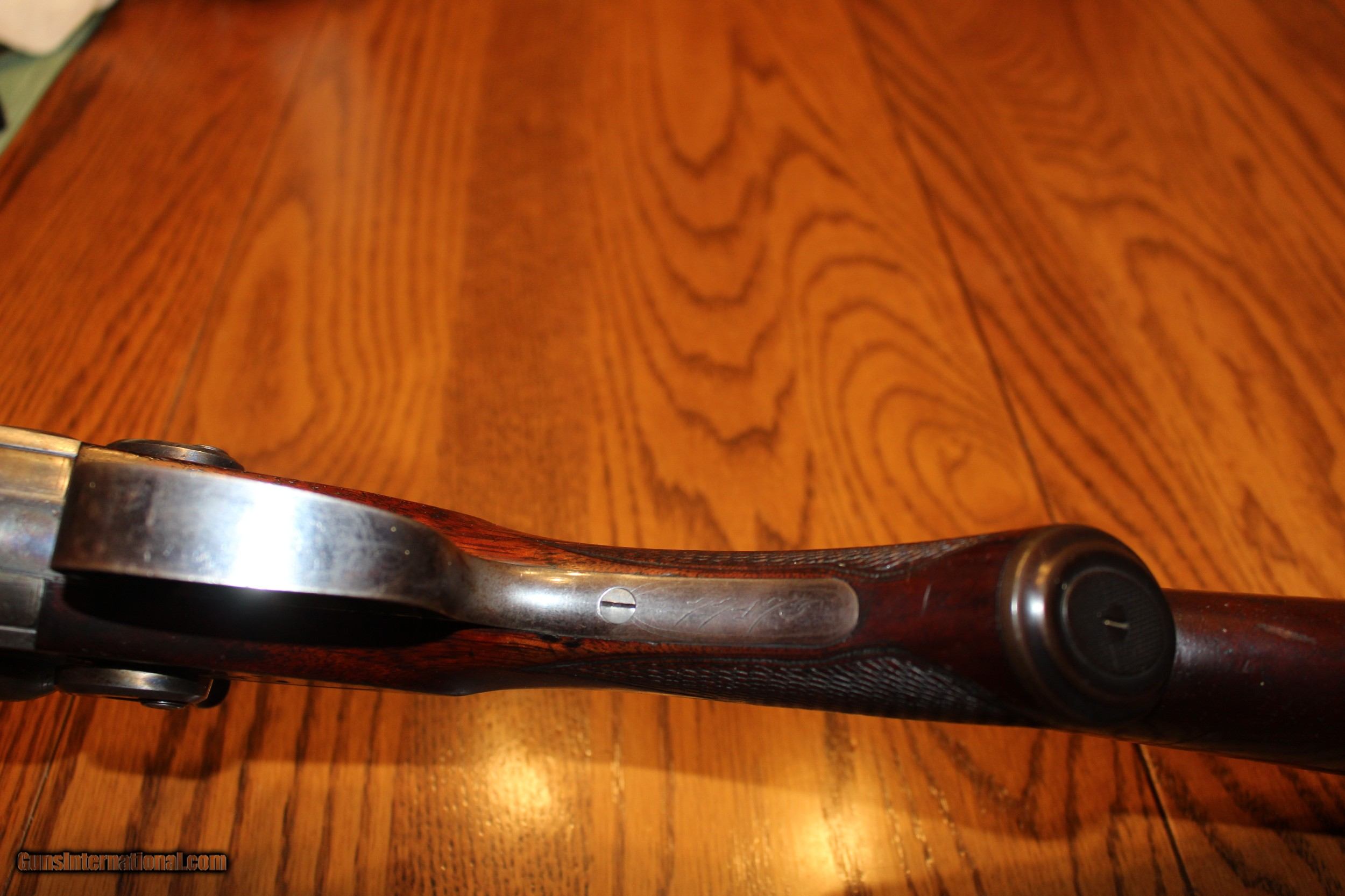 Description: Frame #1 Serial No.: 77473 1893 30" Twist Steel Barrels Pistol Grip Splinter Forearm 7 lbs. 1 oz. 3 1/8" DAH 2 1/8" DAC 13 1/2" LOP Very good condition. Locks up tight. Very solid gun. SOLD Antique: Yes |