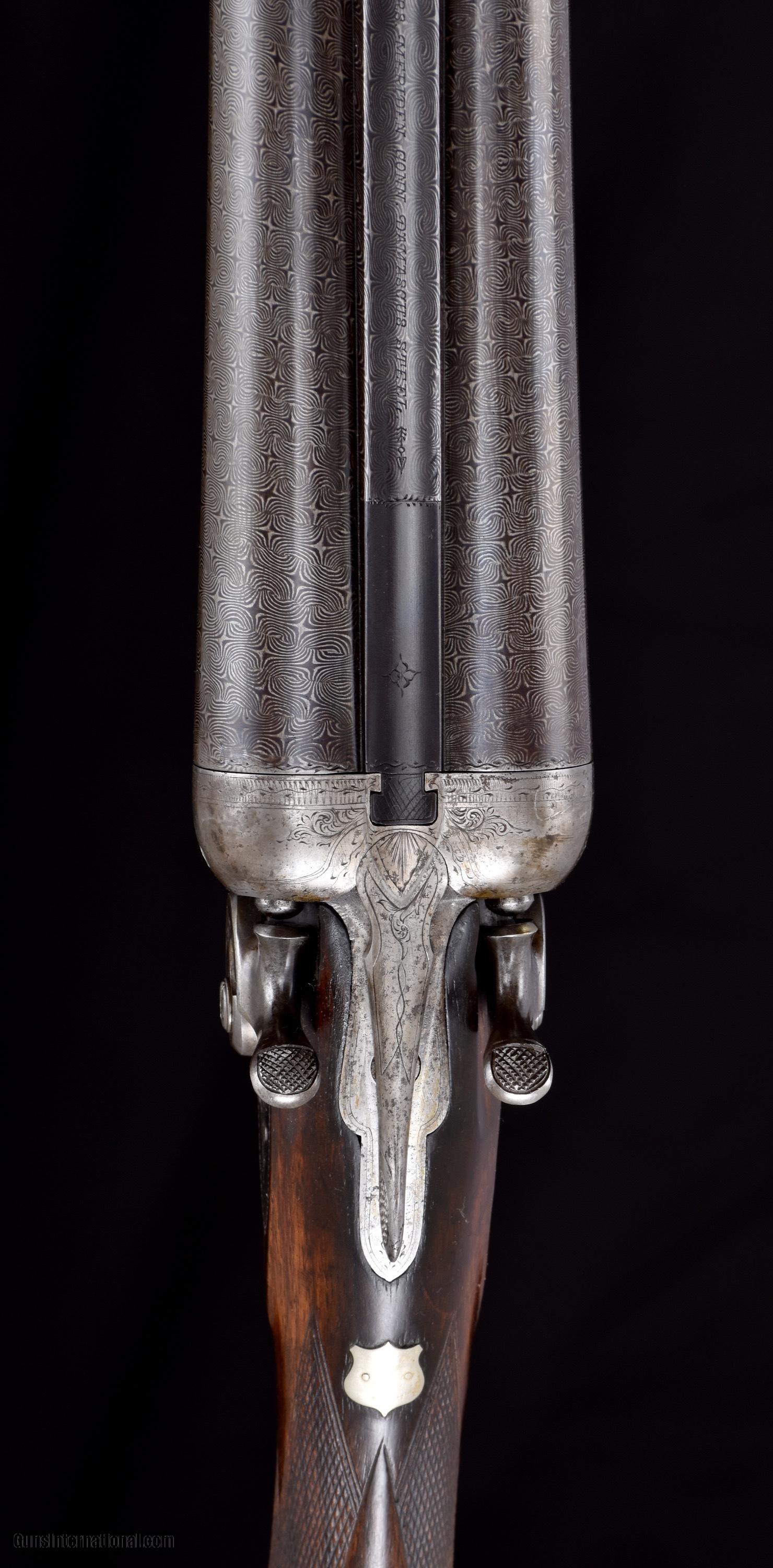 Description: Truly unique, being the only one made in this configuration. Grade 2 10ga made on a #4 frame with factory original 37-3/8" damascus barrels (per factory letter). The gun made with splinter forend, double triggers, capped pistol grip buttstock and factory original Dogs Head buttplate. Engraved in standard Grade 2 pattern with birds and scroll on sides and bottom as seen in the photos. This gun is the only Parker I have ever encounted with this barrel length and the overall condition is amazing for such a rare gun! Overall the gun remains in excellent original condition. Barrels retain about 97% of their bold damascus pattern. The action retains about 1/2 of its original case color being most bright on the locks, toned elsewhere with some color on top. Stocks are sound and excellent. Forend is an older restored finish, butt is original and excellent. Bores are bright and shiny. Mechanics are crisp. This unique Parker is priced at $22,500 plus shipping to your door as an antique. This gun represents a unique opportunity in the collecting of Parkers and this gun should be compared to the 40" Parkers that were recently sold at in the $50k+++ range one of the big s. Please dont hestiate to contact me 704-280-2382 or via PM on this site with any questions or reasonable offers. SOLD Antique: Yes Shotgun Gauge: 10 Gauge Manufacturer: Parker Bros. Model: Grade 2 Serial Number: 26908 Barrel Length: 37-3/8" (Original and guaranteed as such) Chambers: 3-1/4 Ejectors: Extractors Condition: Excellent Metal Condition: Excellent Wood Condition: Execllent Bore Condition: Bright Barrel Type: Damascus Triggers: Double Triggers Stock Comb: 1-3/4 Stock Heel: 2-5/8 Fore End: Splinter Butt Pad: Original DHBP LOP: 13-7/8 Weight: 11lbs 9oz Choke Left: .025 Choke Right: .025 Minimum Wall Thickness Left: Over .025 Minimum Wall Thickness Right: Over .025 |