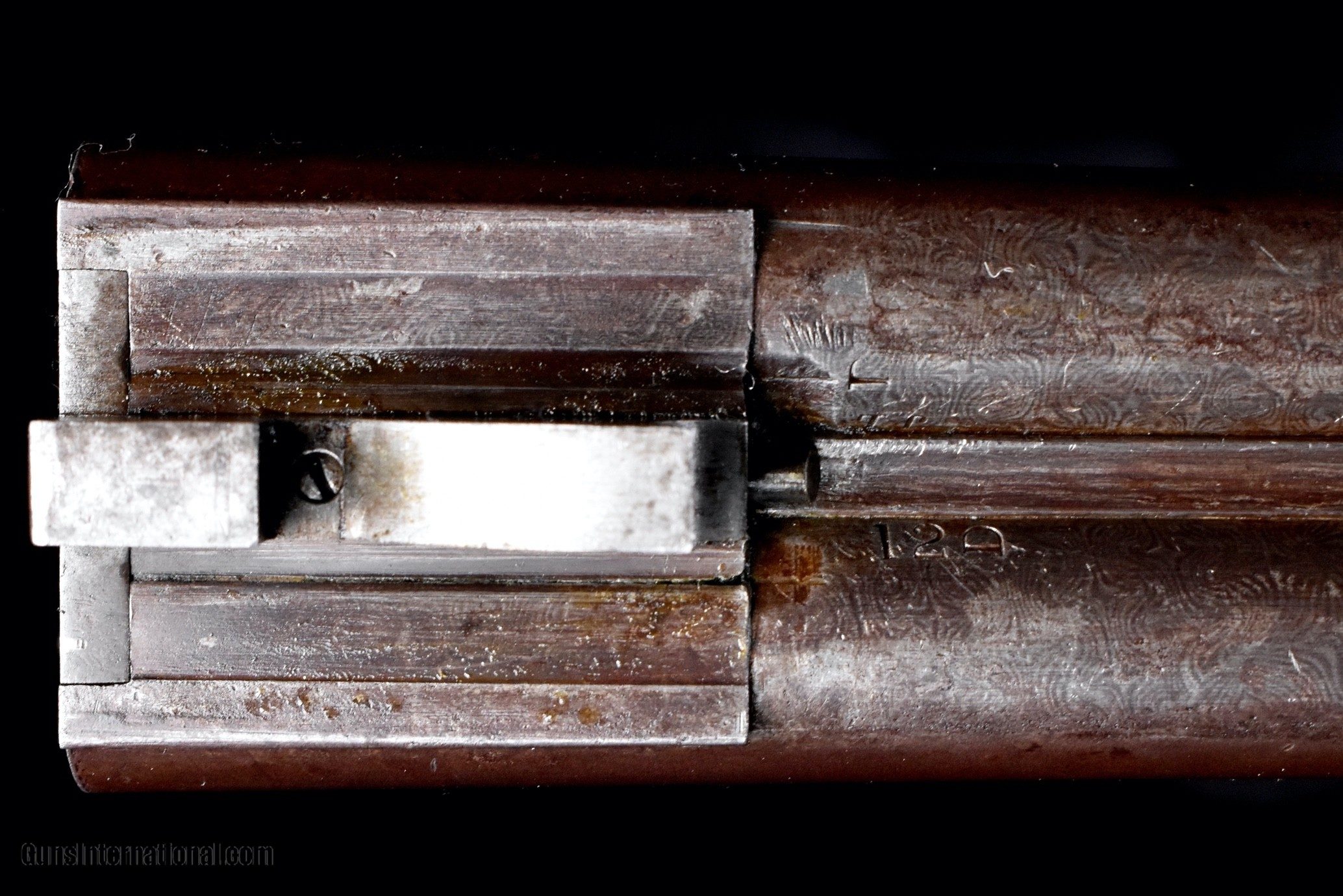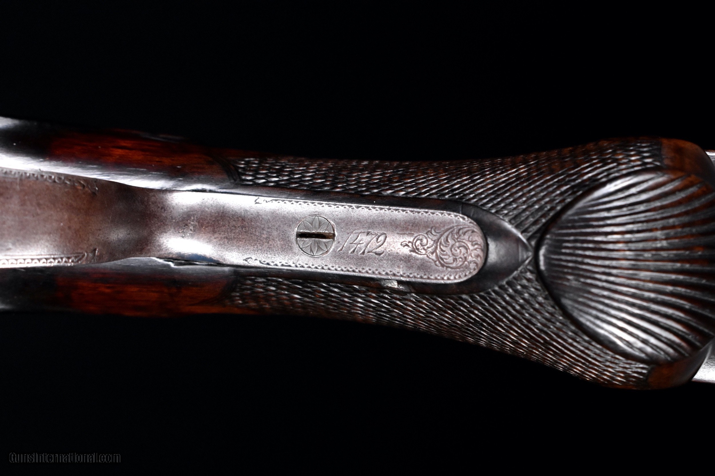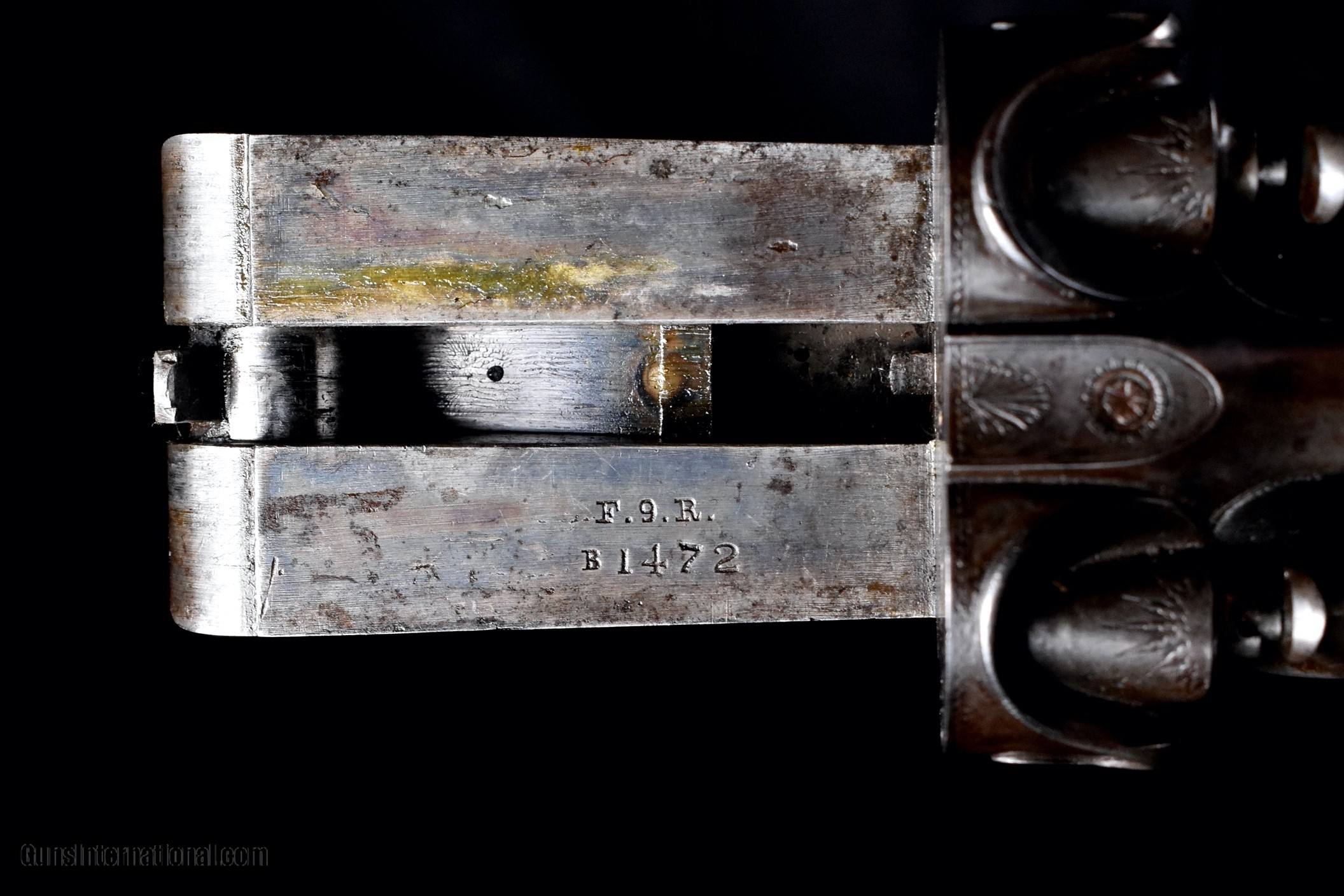 Description: Extremely rare gun made in the 1400 SN range, this $200 grade lifter made with wedge fastened splinter forend, double triggers, extractors. Buttstock with fantastic early shell carved rams head pistol grip and terminates with original skeleton buttplate. Stocked in fine European walnut. Gun is nicely engraved, most likely by Glahn as seen in the photos. Accompanying the gun us a set of 12ga chambermates, so the gun can be comfortably used with today's modern low pressure loads. Overall, the gun remains in pleasing original condition. Barrels retain about 1/2 of their original damascus pattern. Action retains about 30% light original case color. Stocks are sound and retain about 90% of their original finish with some finish added for preservation. Bores do show some minor pitting. Gun is tight and on face. This is an exceptionally rare early lifter and it is priced at $10,500 plus shipping to your home as an antique. Please dont hesitate to contact me at (704) 280-2382 with any questions or reasonable offers. SOLD Antique: Yes Shotgun Gauge: 12 Gauge Manufacturer: Parker Bros Model: $200 Grade Serial Number: 1472 Barrel Length: 30-7/8" (Original length) Chambers: 2-7/8 Ejectors: Extractors Condition: Excellent Metal Condition: Very good Wood Condition: Very good Bore Condition: Good Barrel Type: Damasc Triggers: Double Triggers Stock Comb: 1-3/8 Stock Heel: 1-5/8 Fore End: Wedge fastened splinter Butt Pad: Original Skeleton BP LOP: 14-1/2 Weight: 8lbs 3oz Choke Left: Made prior to choke boring Choke Right: Made prior to choke boring Minimum Wall Thickness Left: .029 Minimum Wall Thickness Right: .025 |