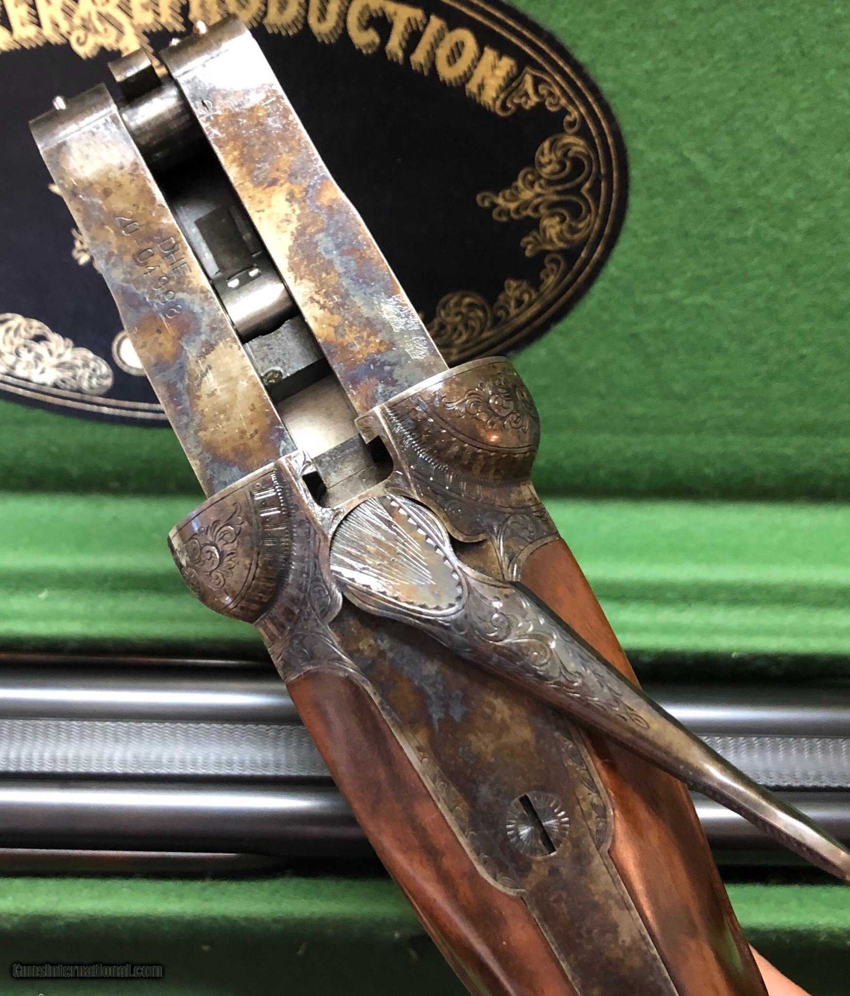 Description: Parker Reproduction DHE 20ga Shotgun. SN: 20-20-049xx, 26" bbls choked IC/MOD. Beuatiful case-colored Parker action with DHE pattern engraving. Ejectors. Single selective trigger. English stock and beavertail forend. Engraved skeleton buttplate over a checkered butt. Cased in leather trunk style case with canvas outer cover, two snap caps marked Parker Reproduction, keys and original instruction manual. LOP:14 1/4", DAC 1 3/8" DAH = 2 3/8", 1/8" Cast Off Condition: Dealer "New Old Stock". Case color vibrant and strong. No apologies here. Gentleman, this is a fine example of the Parker repro in as-new condition. Please call now! FFL required Flat rate $50 S/H/I. SOLD Manufacturer: Parker Winchester Model: DHE Gauge Info: 20ga Engraving: DHE pattern |