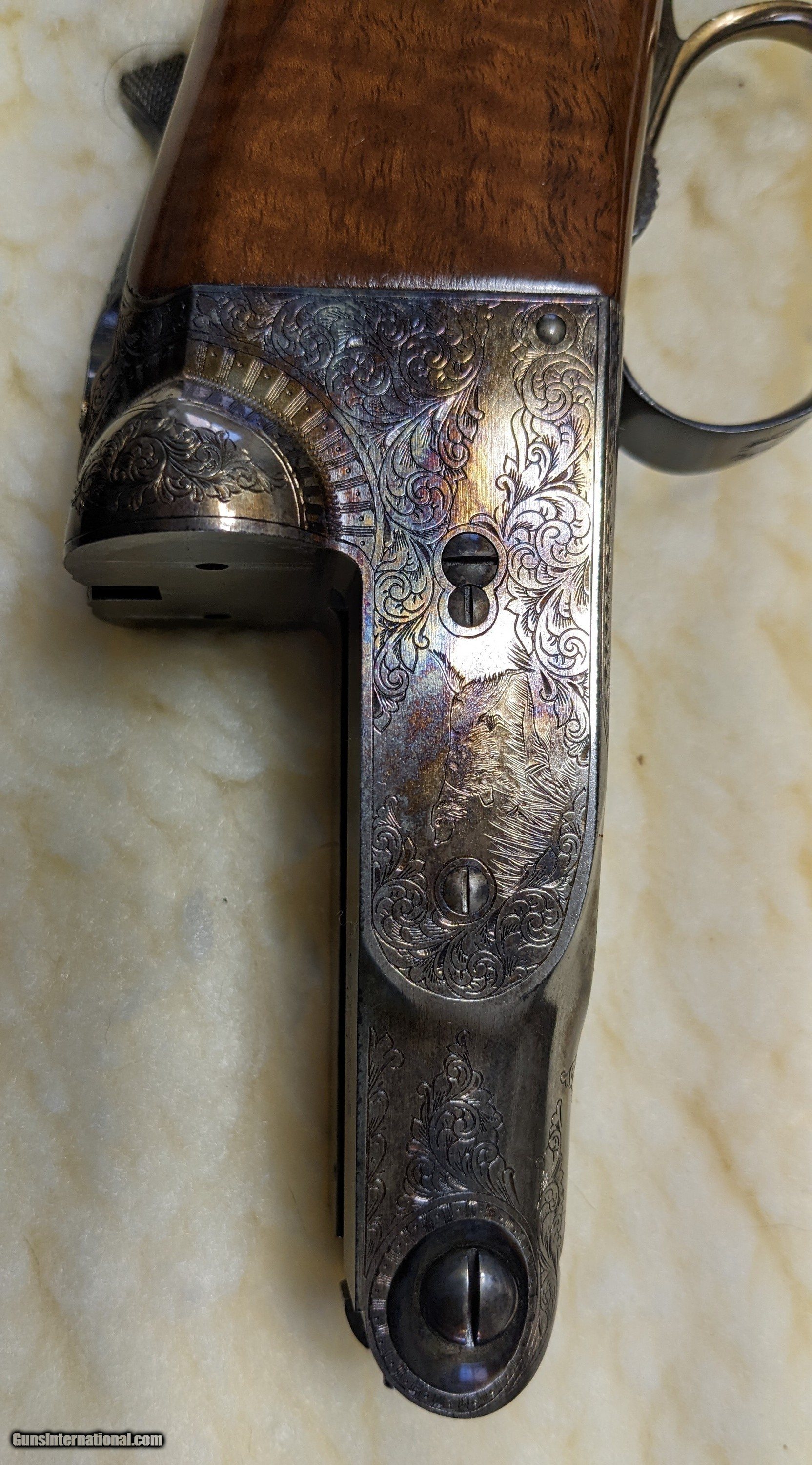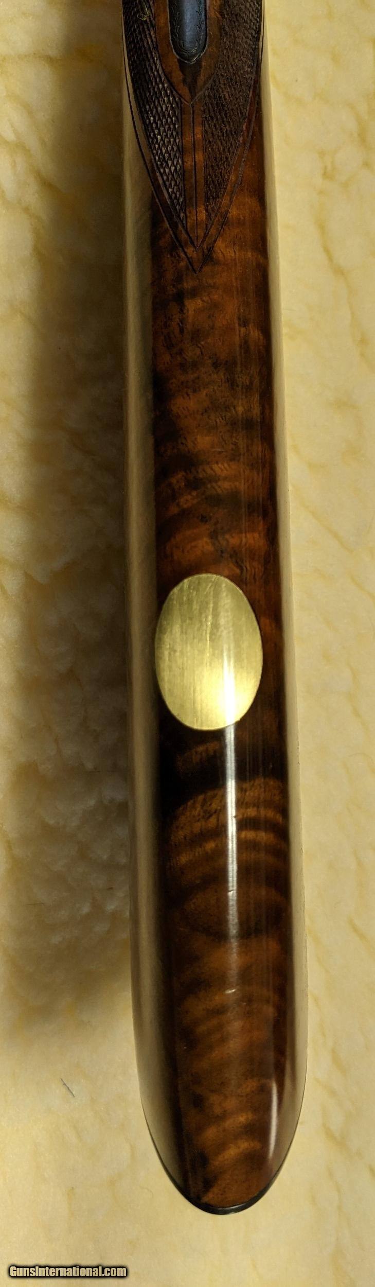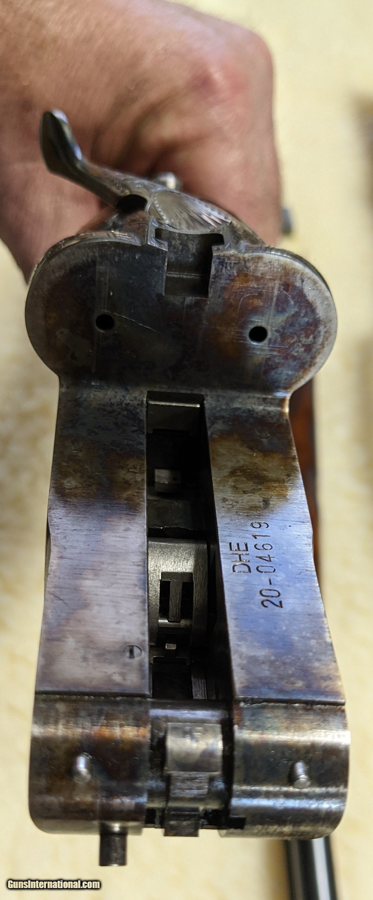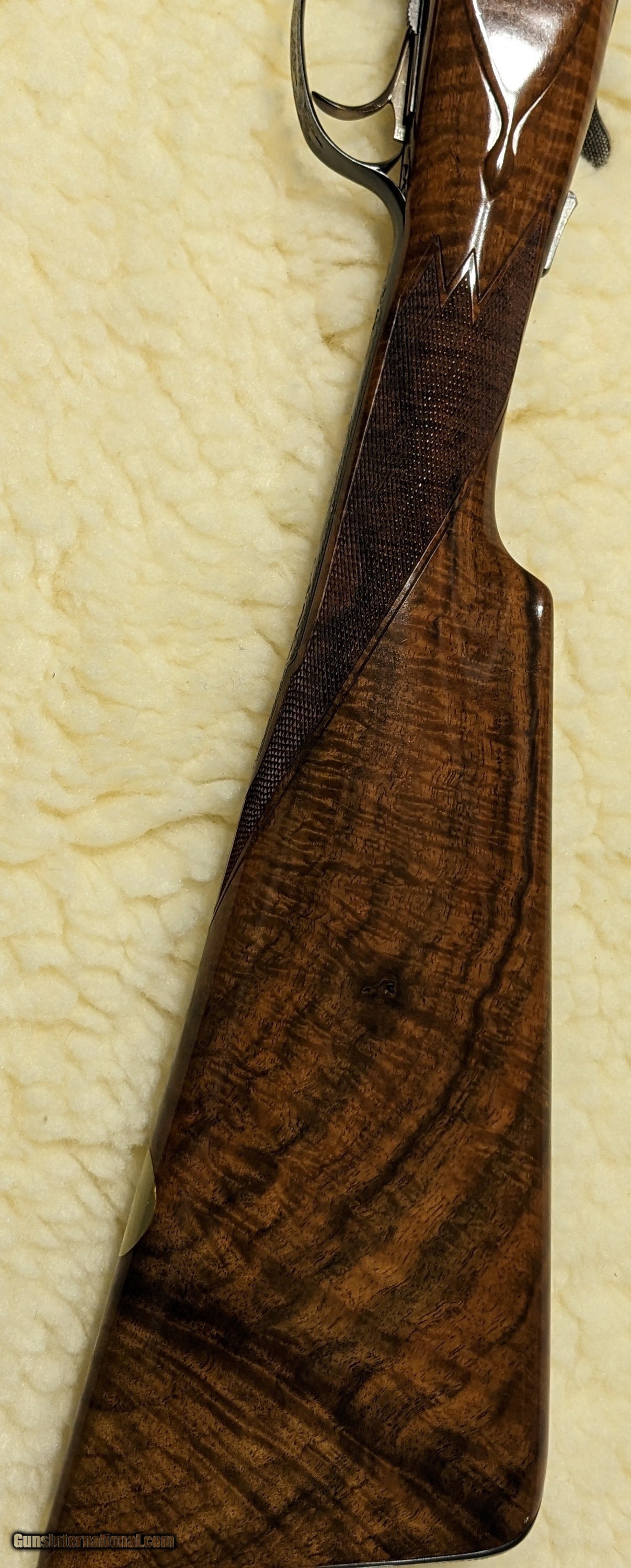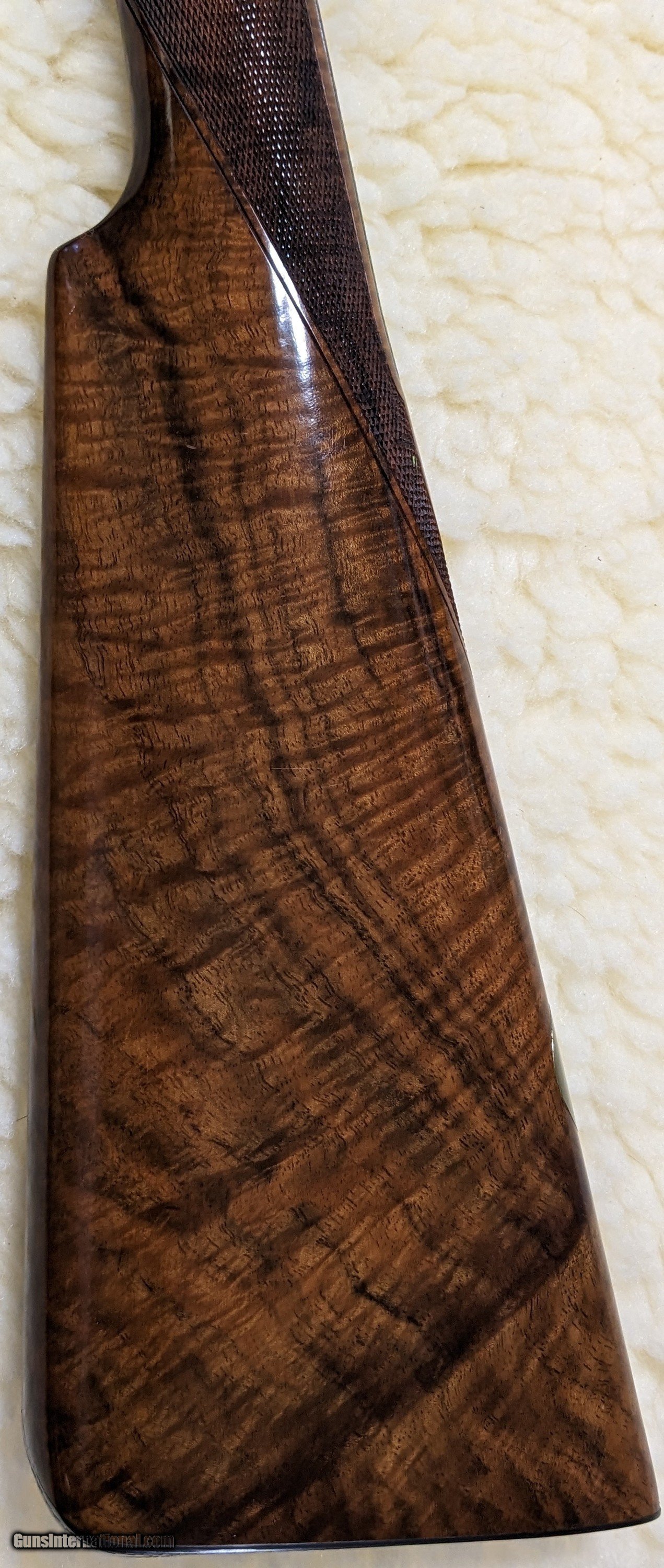Description: Parker Reproduction by Winchester DHE SxS 20 ga. with incredible wood. Straight stock has feather crotch extending into fiddleback at the tang. Splinter forepiece, 26" barrels, Imp.Cyl.& Mod., 2 3/4" chambers, auto ejectors and tang safety, single selective trigger, typical Parker teardrops on grip, checkered skeletonized butt plate, gold oval, original leather manufacturer's case and zippered fabric oversleeve. Firearm is in excellent condition with extremely minor handling marks and slight case hardened color fading. Fabric oversleeve has a worn corner. These are wonderful collectors and make for a fantastic quail and grouse gun. Buyer pays actual shipping costs. Thank you! SOLD Shotgun Gauge: 20 Gauge Manufacturer: Parker Reproduction by Winchester Model: DHE 20 gauge Barrel Length: 26 Chambers: 2 3/4 Ejectors: Auto Condition: Excellent Metal Condition: Very good-excellent Wood Condition: Excellent Bore Condition: Excellent Barrel Type: SxS Action: SxS Triggers: Single Selective Stock: English straight grip Stock Comb: 1 3/8" dropcomb Stock Heel: 2 1/4" heel Stock Cast: Approx. 1/4" RH Fore End: Splinter Butt Pad: Checkered skeletonized buttplate LOP: 14 1/8 Rib: Solid textured Finish: Low gloss wood, case hardened colored metal Weight: Approx. 6lbs. Sights: Silver front bead Choke Left: Modified Choke Right: Imp. Cyl. Engraving: Factory Extras: Zippered cloth over case for leather case-see notes Case: original Leather case Item Location: NV |