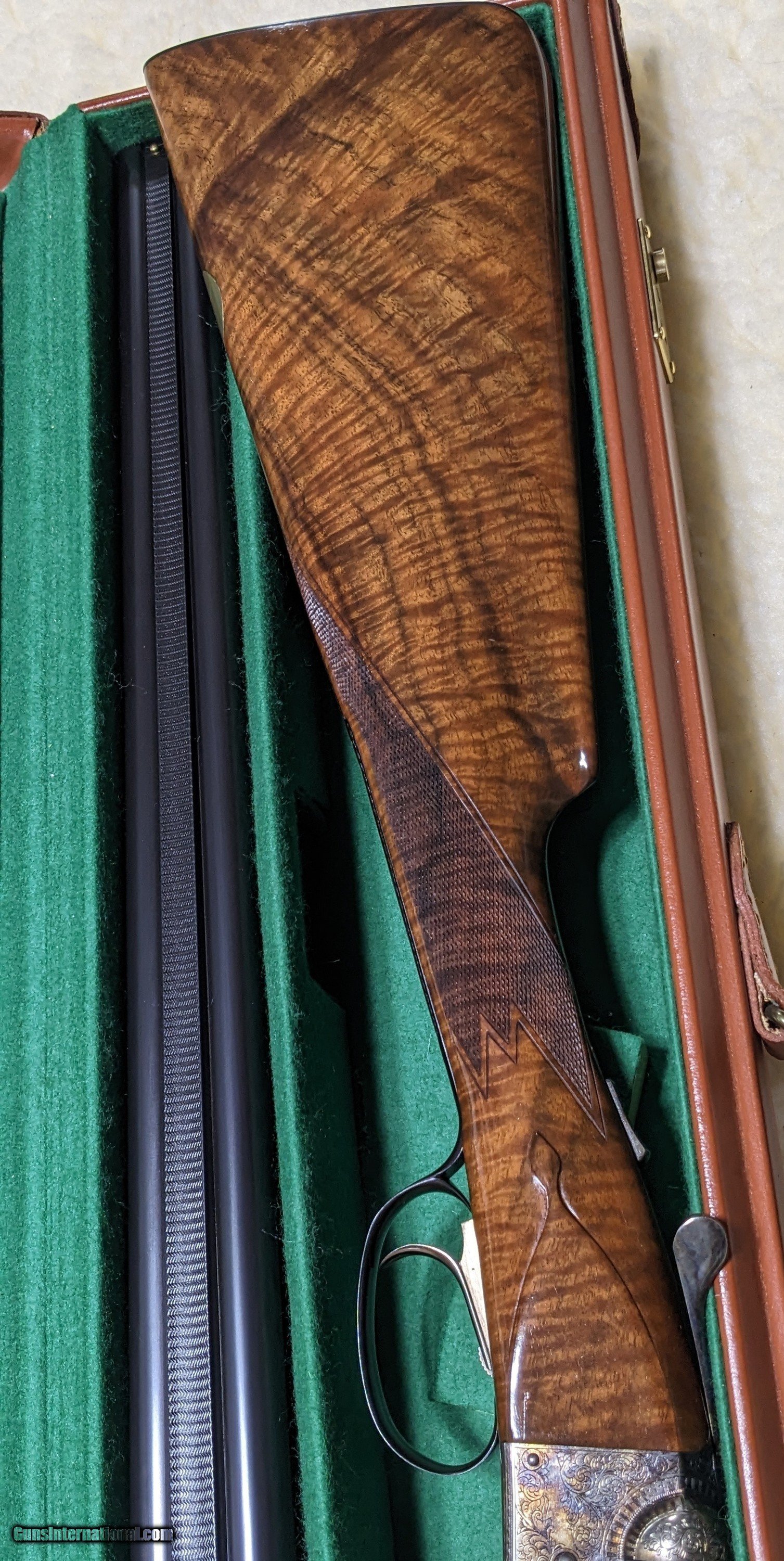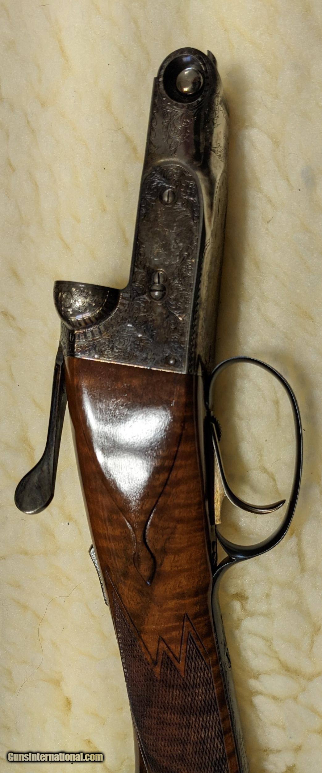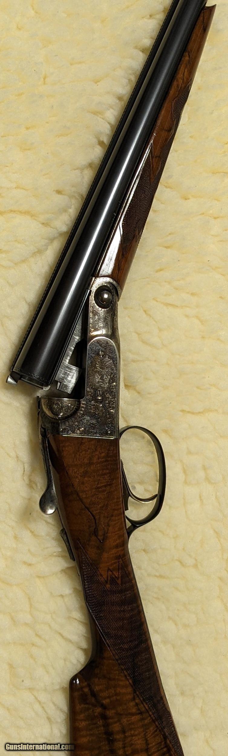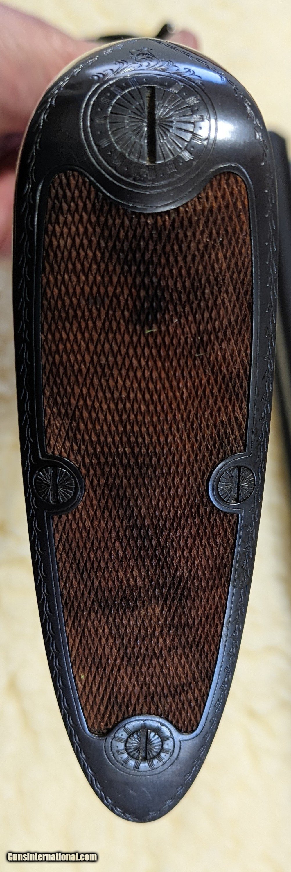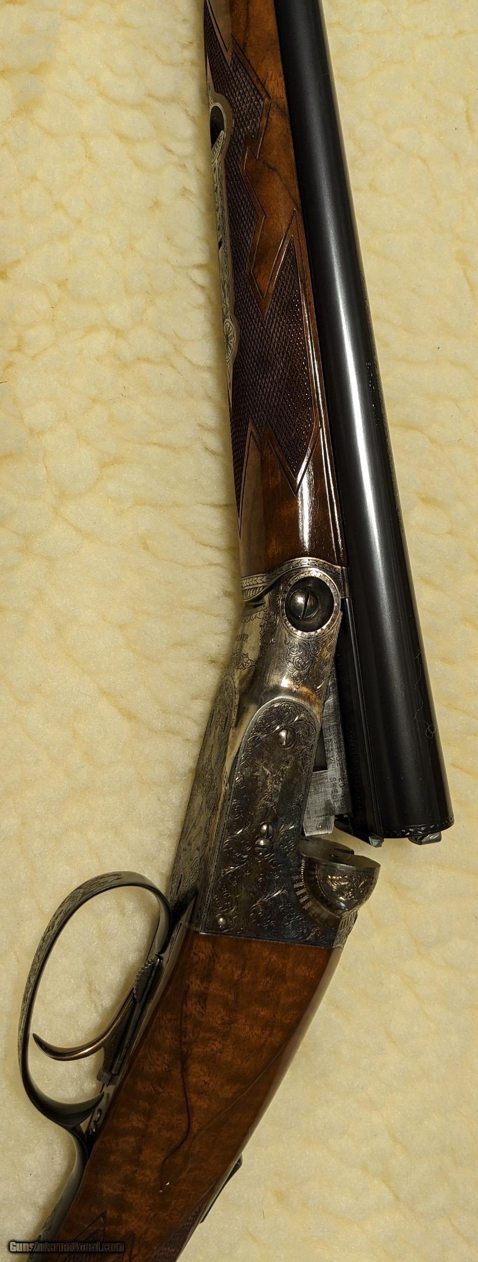Description: Parker Reproduction by Winchester DHE SxS 20 ga. with incredible wood. Straight stock has feather crotch extending into fiddleback at the tang. Splinter forepiece, 26" barrels, Imp.Cyl.& Mod., 2 3/4" chambers, auto ejectors and tang safety, single selective trigger, typical Parker teardrops on grip, checkered skeletonized butt plate, gold oval, original leather manufacturer's case and zippered fabric oversleeve. Firearm is in excellent condition with extremely minor handling marks and slight case hardened color fading. Fabric oversleeve has a worn corner. These are wonderful collectors and make for a fantastic quail and grouse gun. Buyer pays actual shipping costs. Thank you! SOLD Shotgun Gauge: 20 Gauge Manufacturer: Parker Reproduction by Winchester Model: DHE 20 gauge Barrel Length: 26 Chambers: 2 3/4 Ejectors: Auto Condition: Excellent Metal Condition: Very good-excellent Wood Condition: Excellent Bore Condition: Excellent Barrel Type: SxS Action: SxS Triggers: Single Selective Stock: English straight grip Stock Comb: 1 3/8" dropcomb Stock Heel: 2 1/4" heel Stock Cast: Approx. 1/4" RH Fore End: Splinter Butt Pad: Checkered skeletonized buttplate LOP: 14 1/8 Rib: Solid textured Finish: Low gloss wood, case hardened colored metal Weight: Approx. 6lbs. Sights: Silver front bead Choke Left: Modified Choke Right: Imp. Cyl. Engraving: Factory Extras: Zippered cloth over case for leather case-see notes Case: original Leather case Item Location: NV |