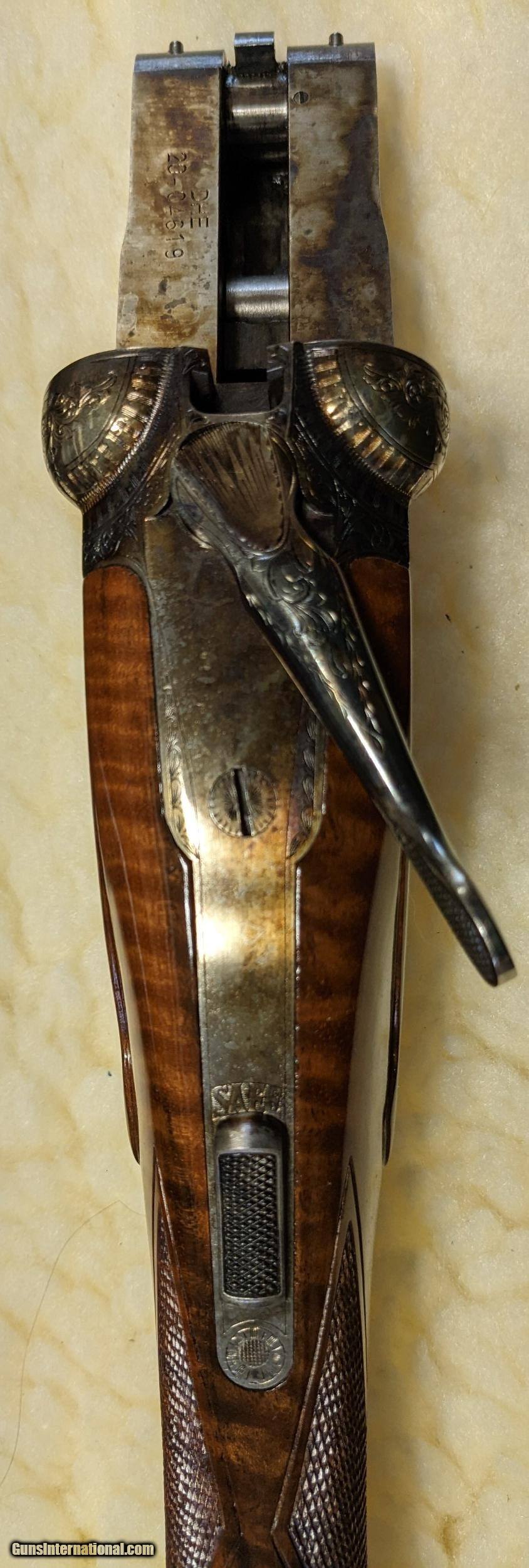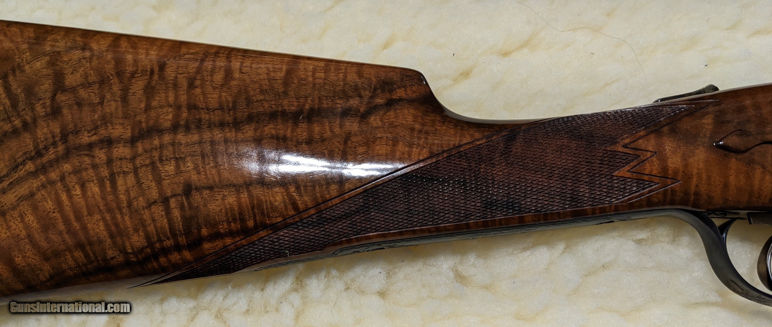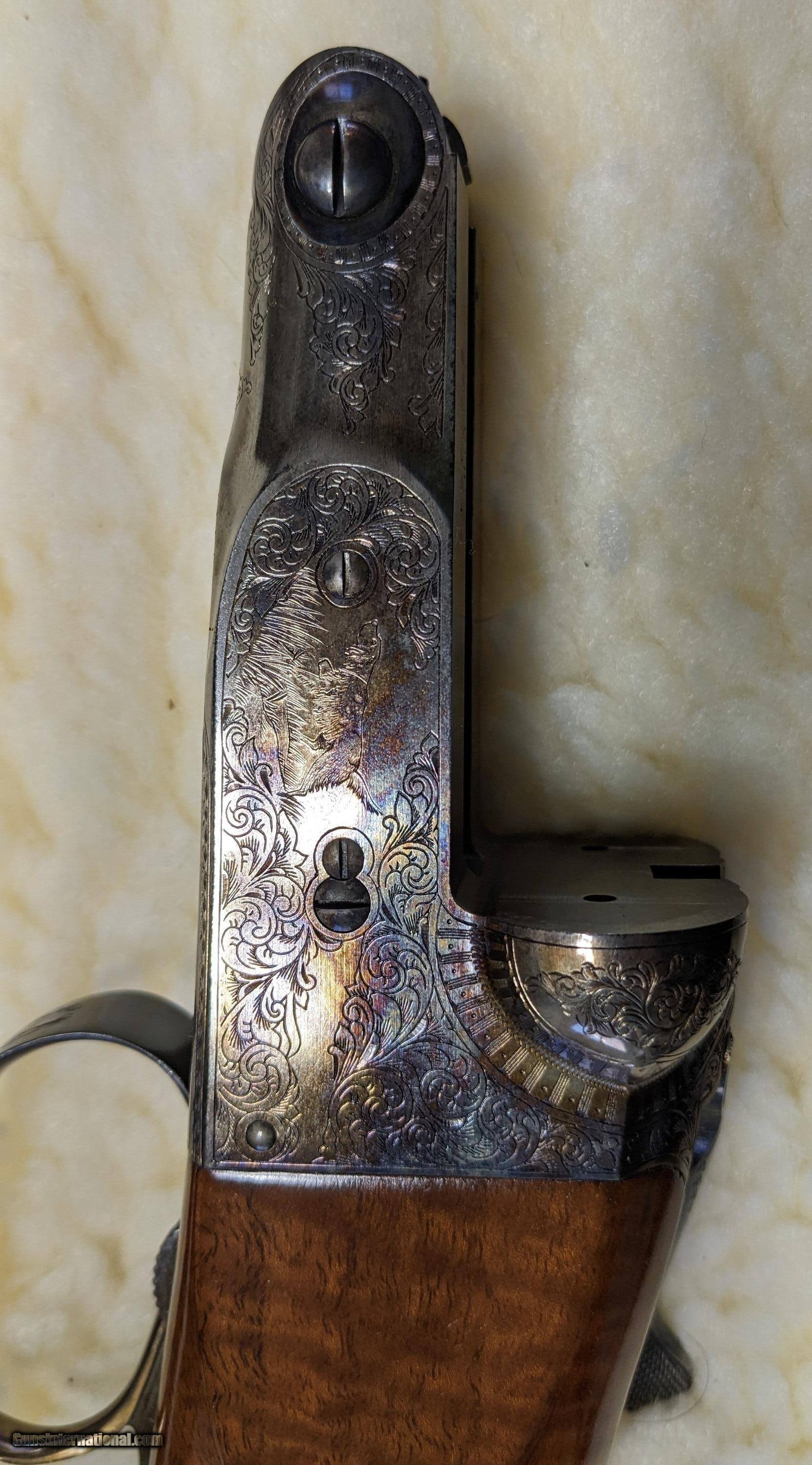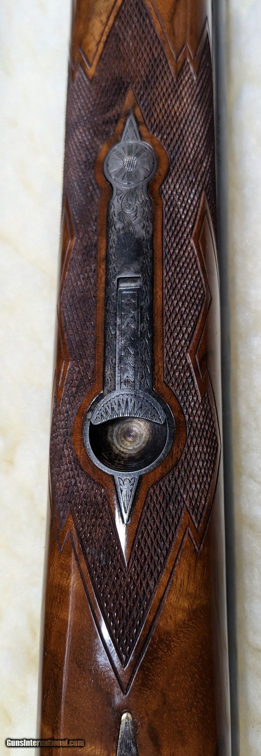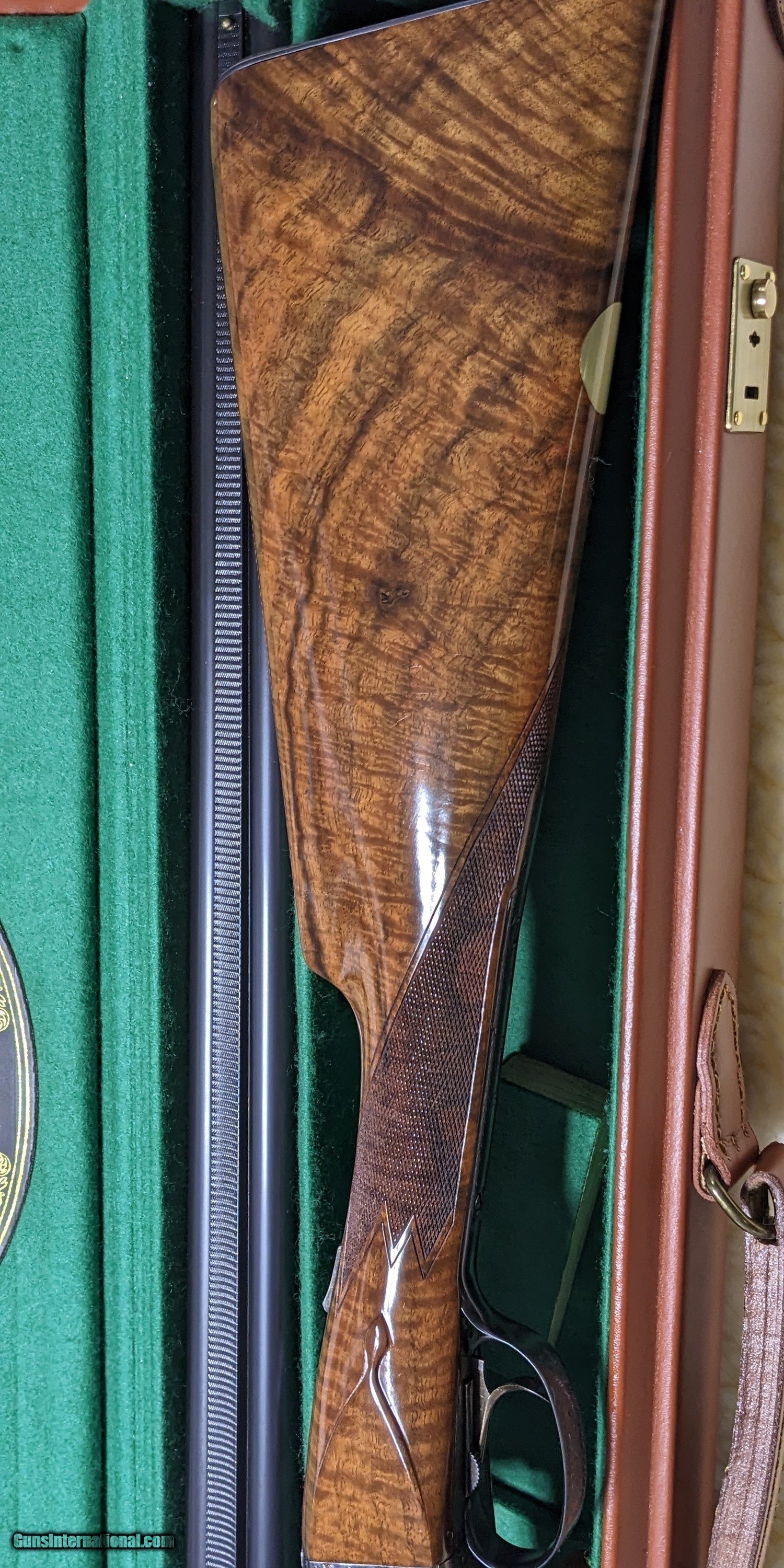 Description: Parker Reproduction by Winchester DHE SxS 20 ga. with incredible wood. Straight stock has feather crotch extending into fiddleback at the tang. Splinter forepiece, 26" barrels, Imp.Cyl.& Mod., 2 3/4" chambers, auto ejectors and tang safety, single selective trigger, typical Parker teardrops on grip, checkered skeletonized butt plate, gold oval, original leather manufacturer's case and zippered fabric oversleeve. Firearm is in excellent condition with extremely minor handling marks and slight case hardened color fading. Fabric oversleeve has a worn corner. These are wonderful collectors and make for a fantastic quail and grouse gun. Buyer pays actual shipping costs. Thank you! SOLD Shotgun Gauge: 20 Gauge Manufacturer: Parker Reproduction by Winchester Model: DHE 20 gauge Barrel Length: 26 Chambers: 2 3/4 Ejectors: Auto Condition: Excellent Metal Condition: Very good-excellent Wood Condition: Excellent Bore Condition: Excellent Barrel Type: SxS Action: SxS Triggers: Single Selective Stock: English straight grip Stock Comb: 1 3/8" dropcomb Stock Heel: 2 1/4" heel Stock Cast: Approx. 1/4" RH Fore End: Splinter Butt Pad: Checkered skeletonized buttplate LOP: 14 1/8 Rib: Solid textured Finish: Low gloss wood, case hardened colored metal Weight: Approx. 6lbs. Sights: Silver front bead Choke Left: Modified Choke Right: Imp. Cyl. Engraving: Factory Extras: Zippered cloth over case for leather case-see notes Case: original Leather case Item Location: NV |