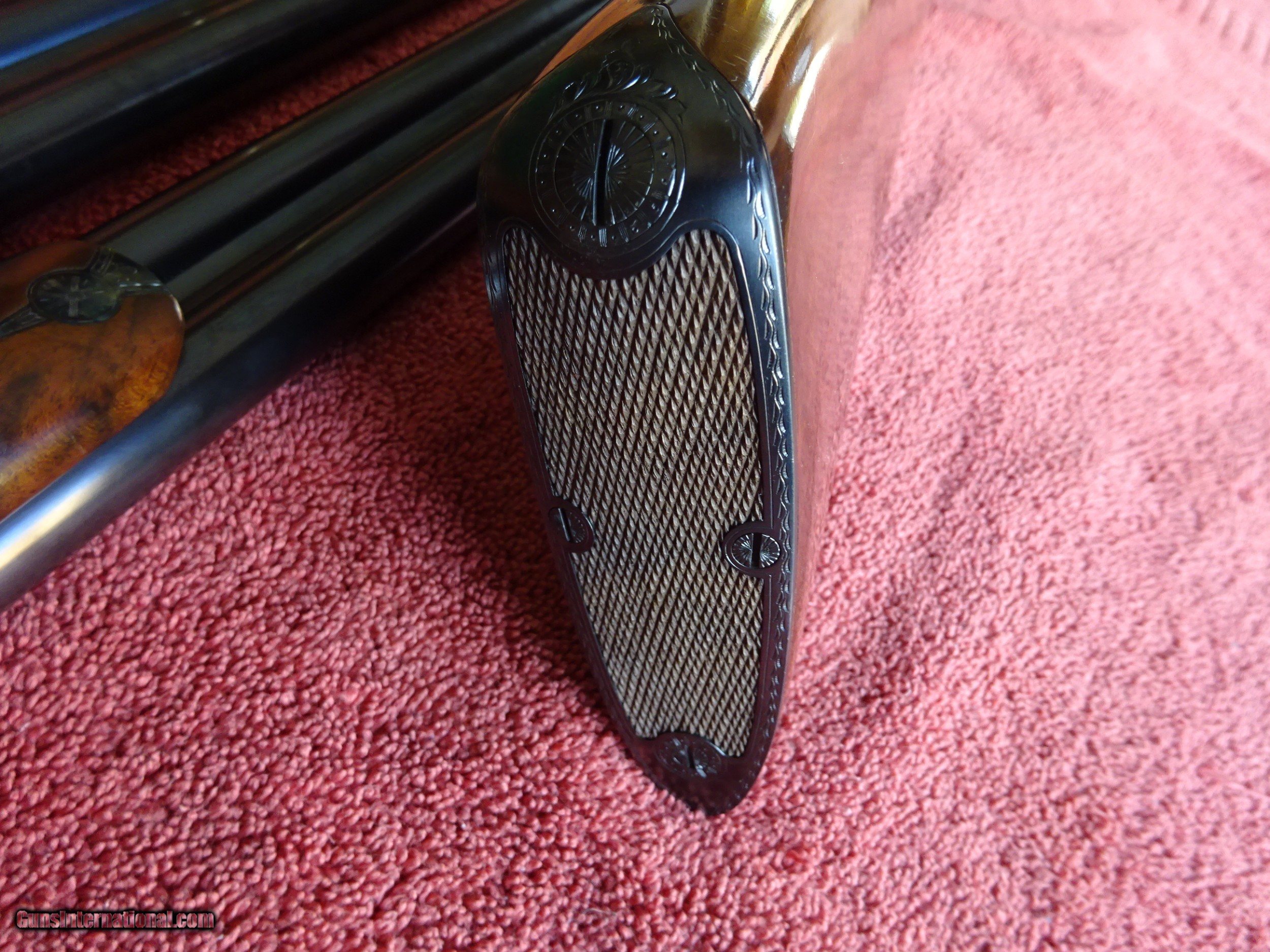 Description: PARKER WINCHESTER REPRODUCTION, DHE 12 GAUGE, TWO BARREL CASED SET. 26" IMCYL. AND MODIFIED, 28" MODIFIED AND FULL, 99% BLUE, MIRROR PERFECT BORES, SINGLE SIGHTS, AUTOMATIC EJECTORS, 2 3/4" CHAMBERS. CASE COLORED FRAME WITH TYPICAL ENGRAVING PATTERN, DOGS ON BOTH SIDES, 3 PHEASANTS ON THE BOTTOM, PLUS ACANTHUS SCROLL AND FINE BORDERS, NO. 1 1/2 FRAME. STRAIGHT GRIP STOCK, SPLINTER FOREARM, SINGLE SELECTIVE TRIGGER. ATTRACTIVE WOOD FIGURE AND COLOR, PERFECT CHECKERING, VERY MINOR HANDLING MARKS IN THE VARNISH, OVAL BRASS STOCK INSERT (NOT ENGRAVED), SKELETON BUTTPLATE. PARKER FELT LINED LEATHER TRUNK CASE, OIL BOTTLE, SNAP CAPS, KEYS, CANVAS AND LEATHER ZIPPERED COVER. THE CASE, CONTENTS, AND COVER ARE ALL EXCELLENT. 12 GAUGE GUNS MADE UP LESS THAN 20% OF THE TOTAL PRODUCTION, MADE FROM 1986 TO 1989, 100% ORIGINAL CONDITION, SCARCE GUN. $5500.00 + $50.00 Insured shipping to an FFL address. See all Pats gun listings on this site! We also have hundreds of pieces of ORIGINAL gun company advertising & memorabilia available for sale on our site SPORTINGCOLLECTIBLES. We have no reprints or reproductions. Email for more information. SOLD |