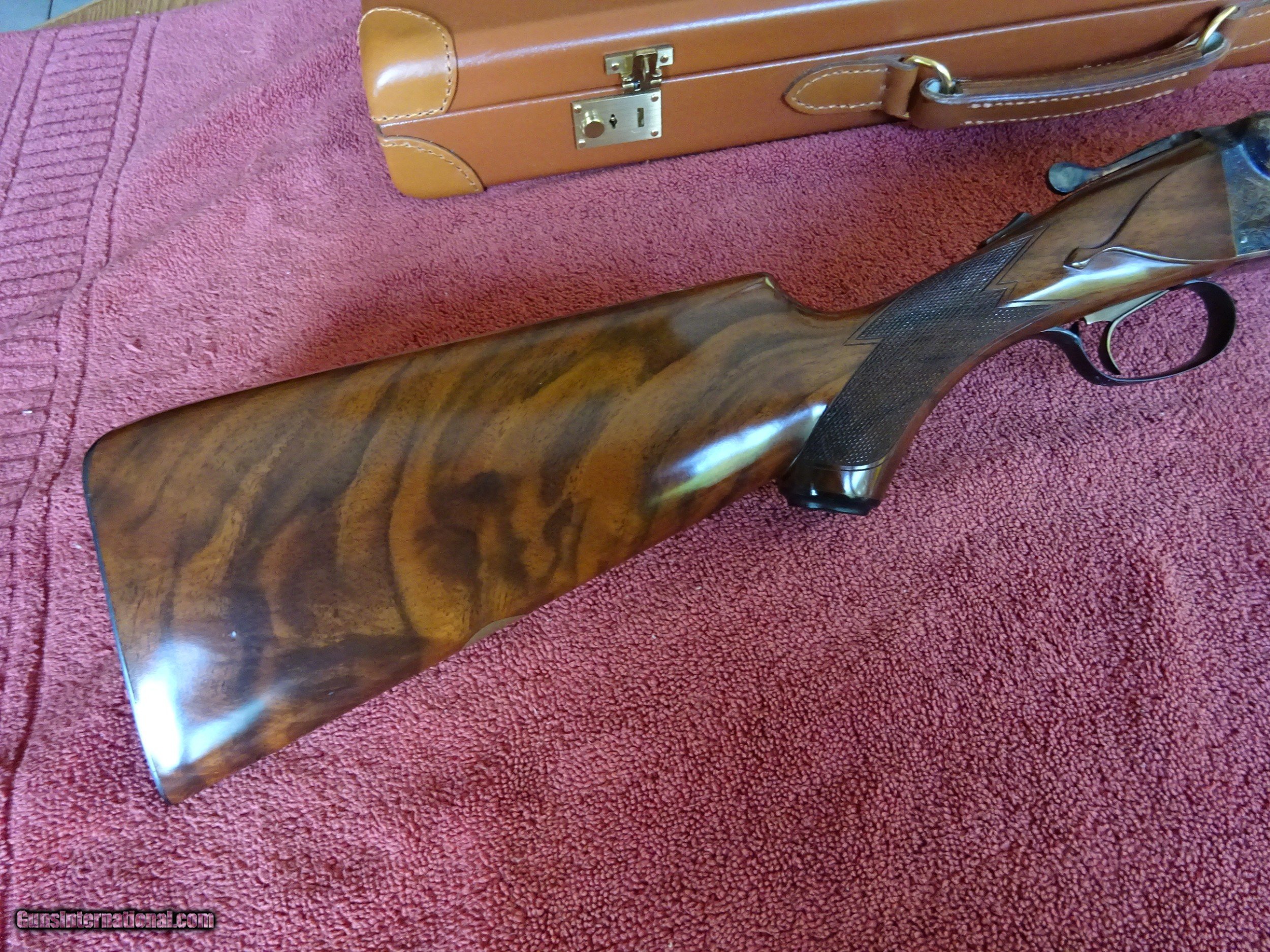 Description: PARKER REPRODUCTION DHE 12 GAUGE. 26" BARRELS, IMCYL. AND MODIFIED, SINGLE SIGHT, AUTOMATIC EJECTORS. TYPICAL ENGRAVING PATTERN WITH POINTING DOGS ON EACH SIDE, 3 PHEASANTS ON THE FLOOR PLATE, PLUS ACANTHUS SCROLL AND FINE BORDERS. ENGRAVED SCREWS, "PARKER" ON THE BOTTOM, SINGLE SELECTIVE TRIGGER. PISTOL GRIP STOCK, SPLINTER FOREARM, NICELY FIGURED EUROPEAN WALNUT, STEEL SKELETON BUTTPLATE. LIKE NEW OVERALL CONDITION, NO WEAR ANYWHERE. STILL STIFF TO OPEN AND CLOSE, POSSIBLY UNFIRED, CERTAINLY NEVER HUNTED WITH. LENGTH OF PULL 14 1/8 ". ORIGINAL LEATHER FELT-LINED TRUNK CASE WITH SNAP CAPS AND KEYS. ALSO ORIGINAL CANVAS CASE COVER. 12 GAUGE MODELS ARE QUITE SCARCE, ONLY ABOUT 2100 PRODUCED. CIRCA 1986-1989. $5500.00 + $50.00 Insured shipping to an FFL address. See all Pats gun listings on this site! We also have hundreds of pieces of ORIGINAL gun company advertising & memorabilia available for sale on our site SPORTINGCOLLECTIBLES. We have no reprints or reproductions. Email for more information. SOLD |