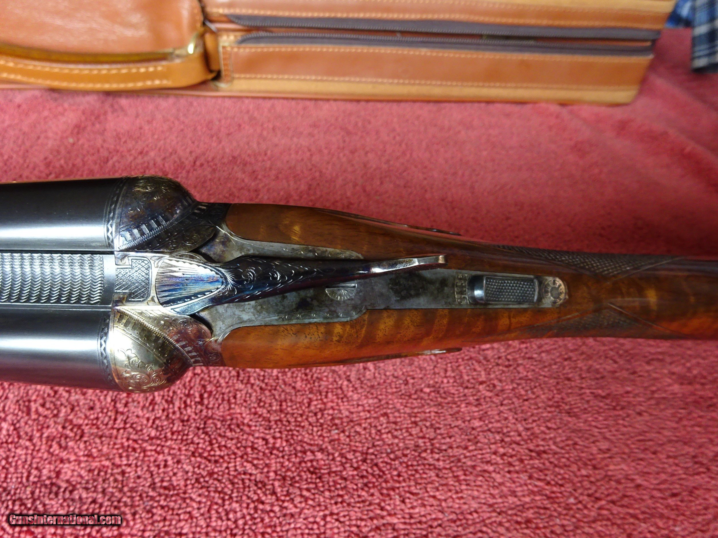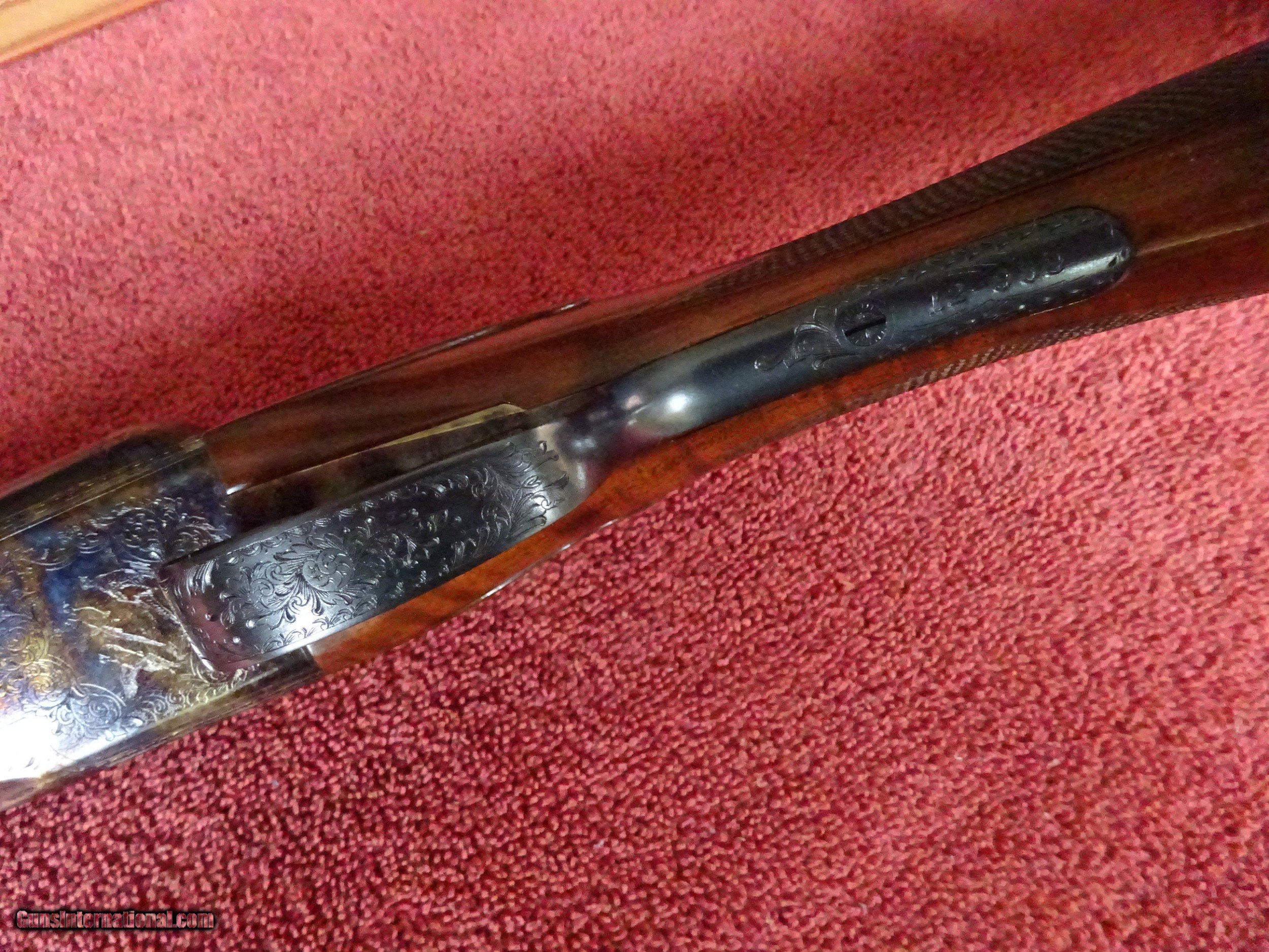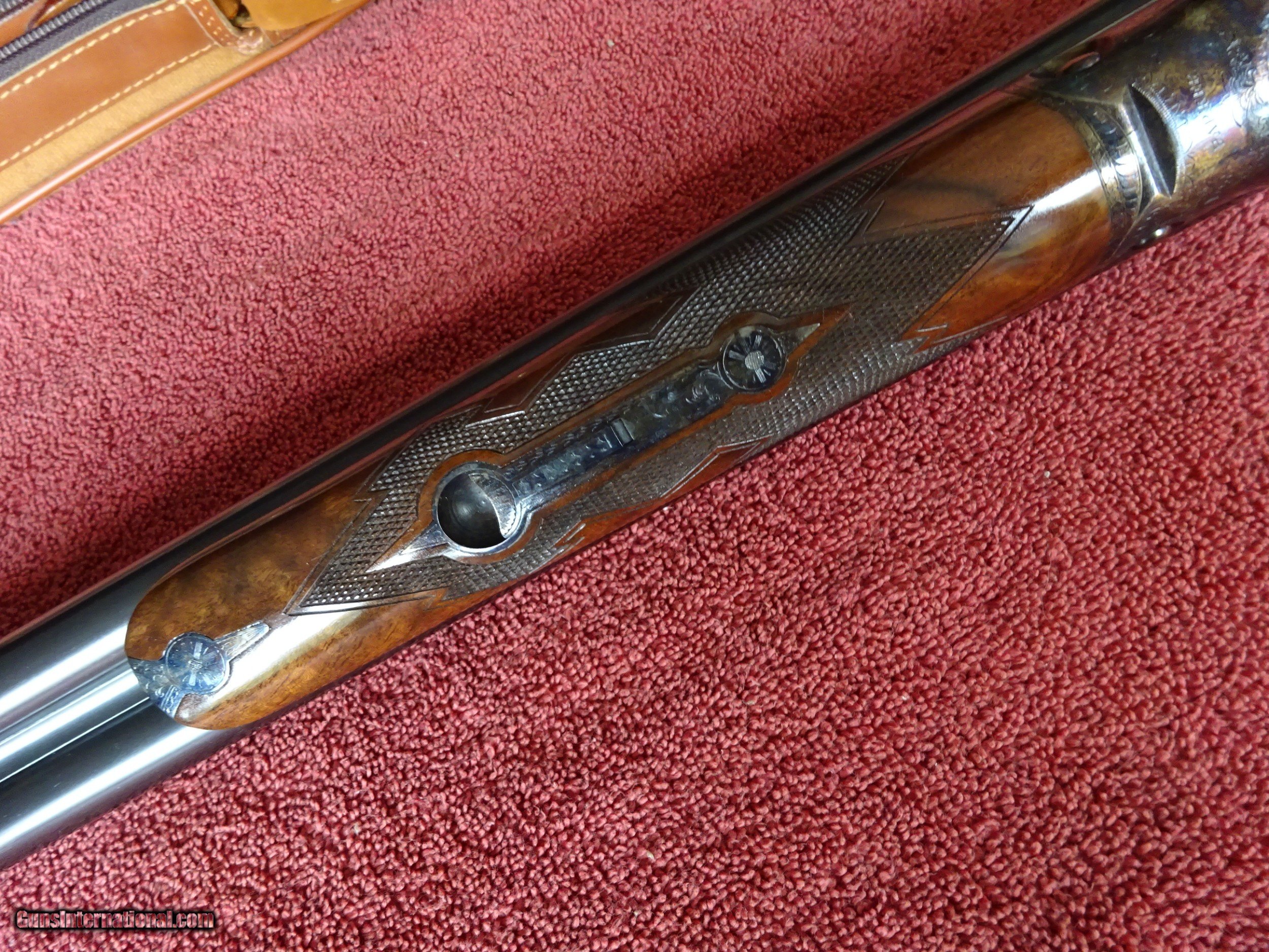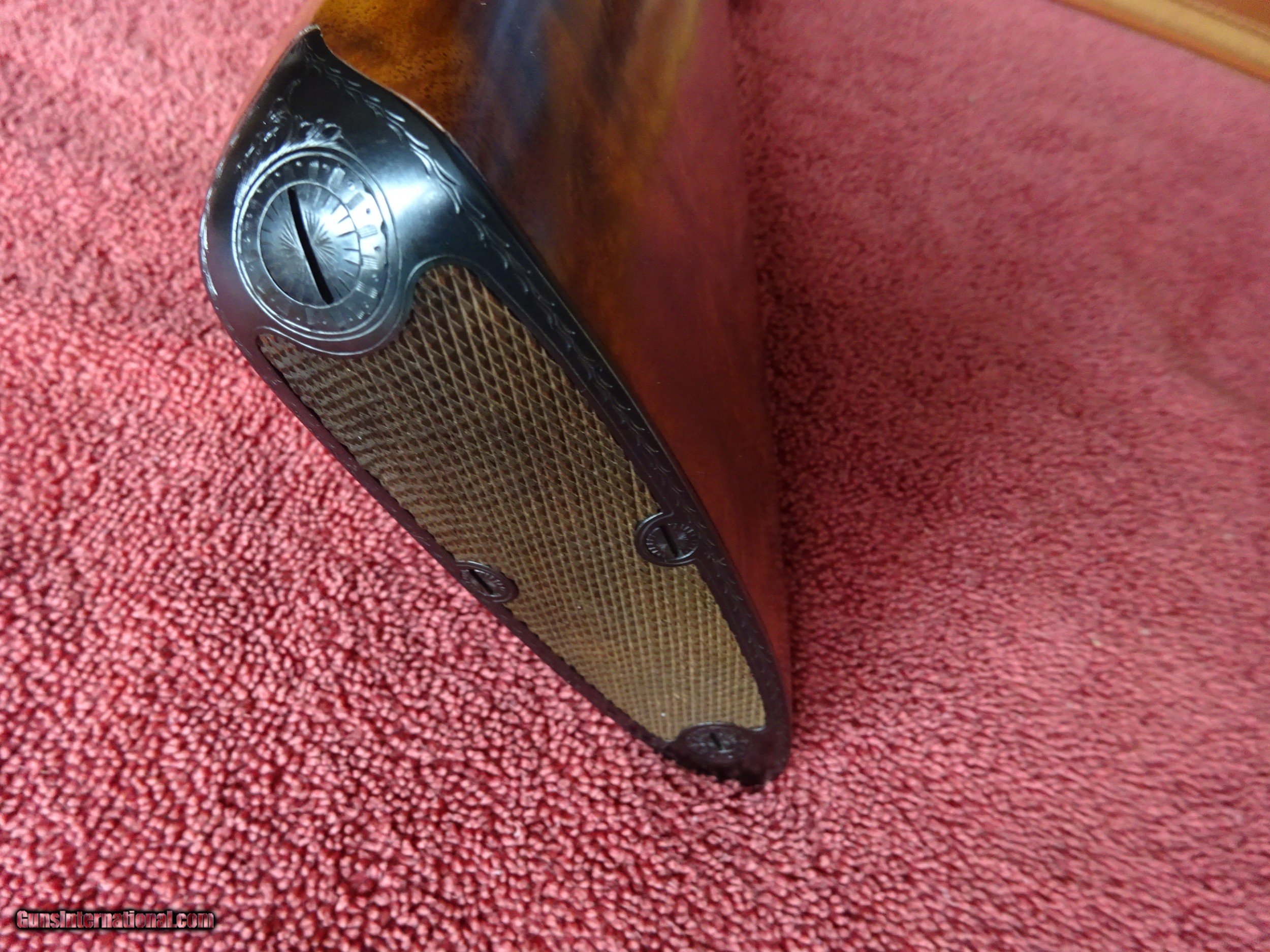 Description: WINCHESTER PARKER REPRODUCTION DHE GRADE 12 GAUGE. 26" BARRELS, 2 3/4" CHAMBERS, IMCYL. AND MODIFIED, 100% BLUE, MIRROR PERFECT BORES, SINGLE SIGHT. TYPICAL ENGRAVING PATTERN WITH HUNTING DOGS ON BOTH SIDES, 3 PHEASANTS IN FLIGHT ON THE FLOOR PLATE, PLUS ACANTHUS SCROLL WORK AND FINE BORDERS, TOP LEVER FOREARM IRON, TRIGGERGUARD, SKELETON BUTTPLATE AND SCREWS ALSO ENGRAVED, 100% BOLD VIVID CASE COLOR. PISTOL GRIP STOCK, SPLINTER FOREARM, OUTSTANDING TRULY EXCEPTIONAL HIGHLY FIGURED WOOD, PERFECT CHECKERING. 1 13/16" X 2 1/4" X 14", 6 1/2 POUNDS INCLUDES ORIGINAL PARKER FELT LINED LEATHER TRUNK CASE, SNAP CAPS AND CANVAS AND LEATHER CASE COVER, ALL IN LIKE NEW CONDITION. MOST PARKER REPROS WERE 20 AND 28 GAUGE, 12 GAUGE GUNS MAKE UP LESS THAN 20% OF THE TOTAL PRODUCTION. 100% ORIGINAL CONDITION, CIRCA MID-1980S. $4500.00 + $50.00 Insured shipping to an FFL address. See all Pats gun listings on this site! We also have hundreds of pieces of ORIGINAL gun company advertising & memorabilia available for sale on our site SPORTINGCOLLECTIBLES. We have no reprints or reproductions. Email for more information. SOLD |