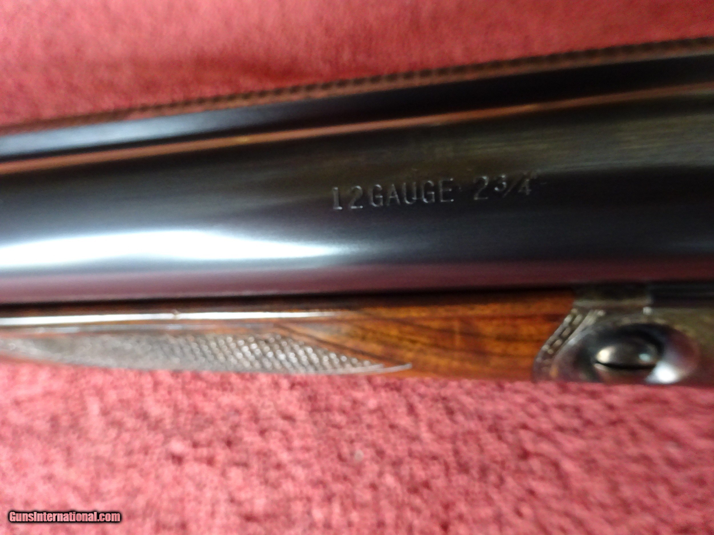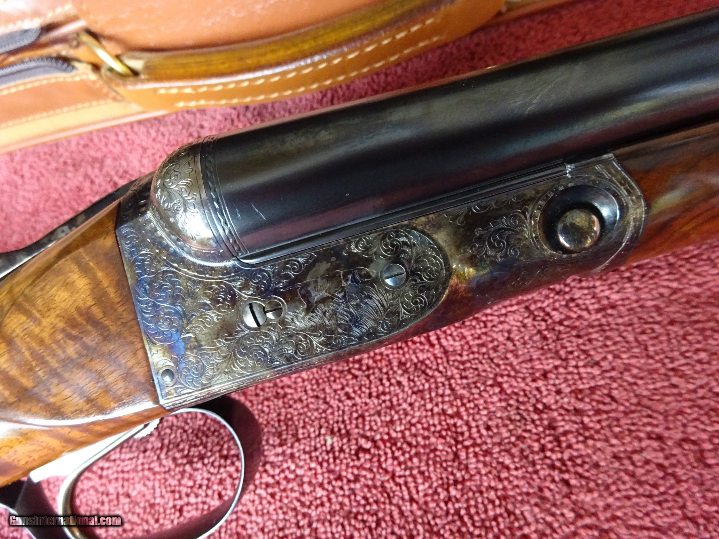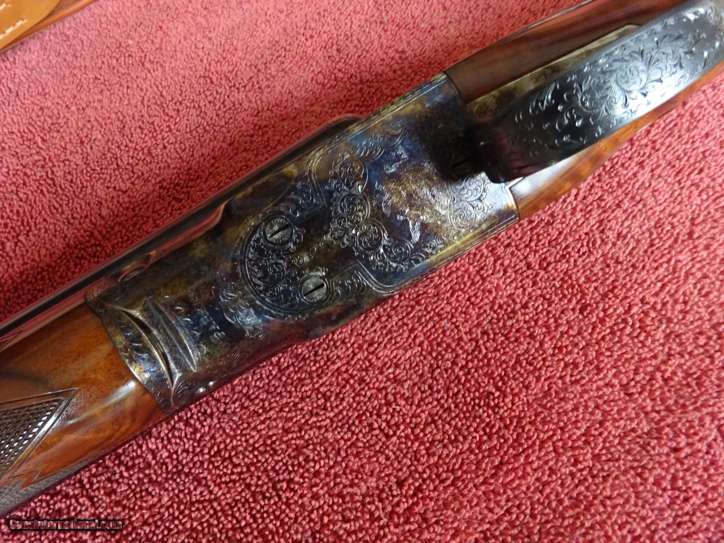 Description: WINCHESTER PARKER REPRODUCTION DHE GRADE 12 GAUGE. 26" BARRELS, 2 3/4" CHAMBERS, IMCYL. AND MODIFIED, 100% BLUE, MIRROR PERFECT BORES, SINGLE SIGHT. TYPICAL ENGRAVING PATTERN WITH HUNTING DOGS ON BOTH SIDES, 3 PHEASANTS IN FLIGHT ON THE FLOOR PLATE, PLUS ACANTHUS SCROLL WORK AND FINE BORDERS, TOP LEVER FOREARM IRON, TRIGGERGUARD, SKELETON BUTTPLATE AND SCREWS ALSO ENGRAVED, 100% BOLD VIVID CASE COLOR. PISTOL GRIP STOCK, SPLINTER FOREARM, OUTSTANDING TRULY EXCEPTIONAL HIGHLY FIGURED WOOD, PERFECT CHECKERING. 1 13/16" X 2 1/4" X 14", 6 1/2 POUNDS INCLUDES ORIGINAL PARKER FELT LINED LEATHER TRUNK CASE, SNAP CAPS AND CANVAS AND LEATHER CASE COVER, ALL IN LIKE NEW CONDITION. MOST PARKER REPROS WERE 20 AND 28 GAUGE, 12 GAUGE GUNS MAKE UP LESS THAN 20% OF THE TOTAL PRODUCTION. 100% ORIGINAL CONDITION, CIRCA MID-1980S. $4500.00 + $50.00 Insured shipping to an FFL address. See all Pats gun listings on this site! We also have hundreds of pieces of ORIGINAL gun company advertising & memorabilia available for sale on our site SPORTINGCOLLECTIBLES. We have no reprints or reproductions. Email for more information. SOLD |