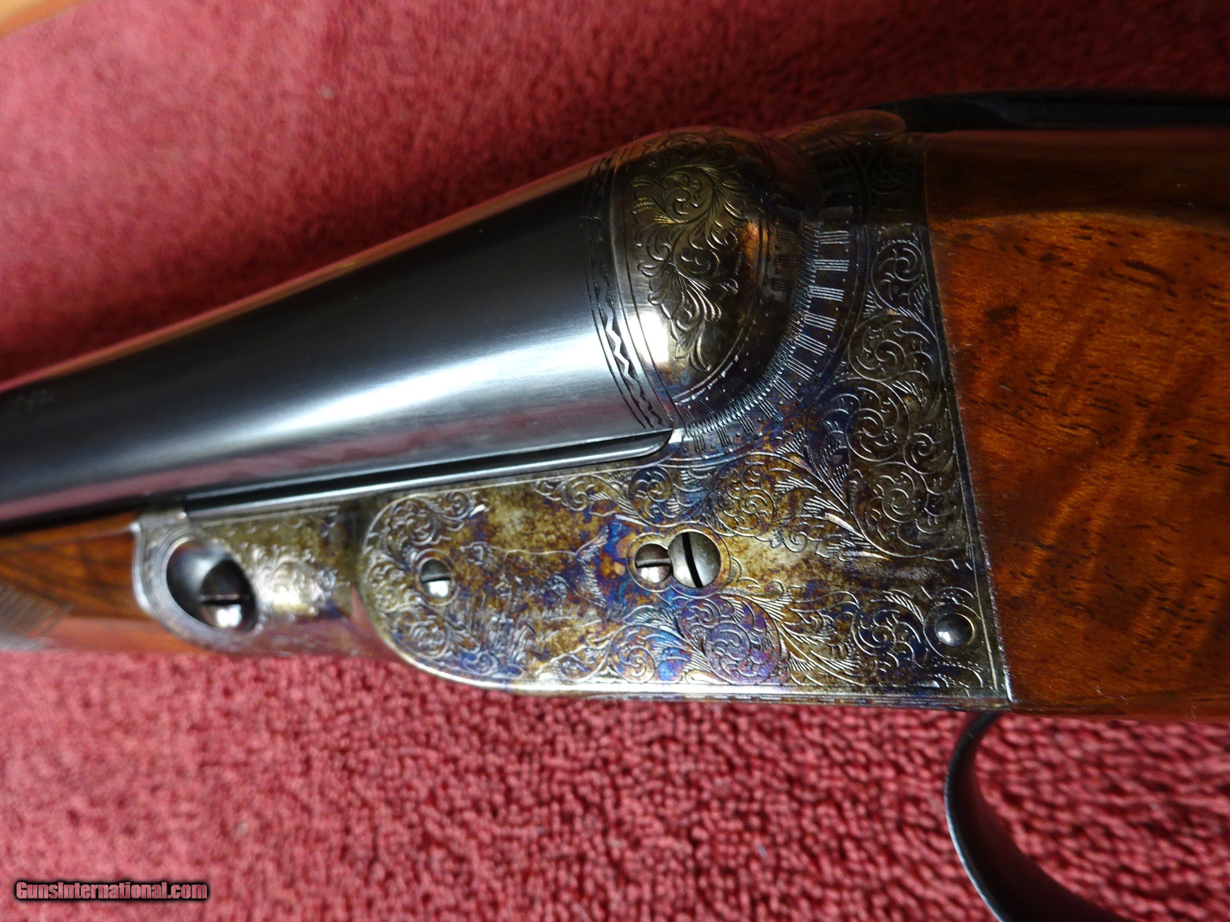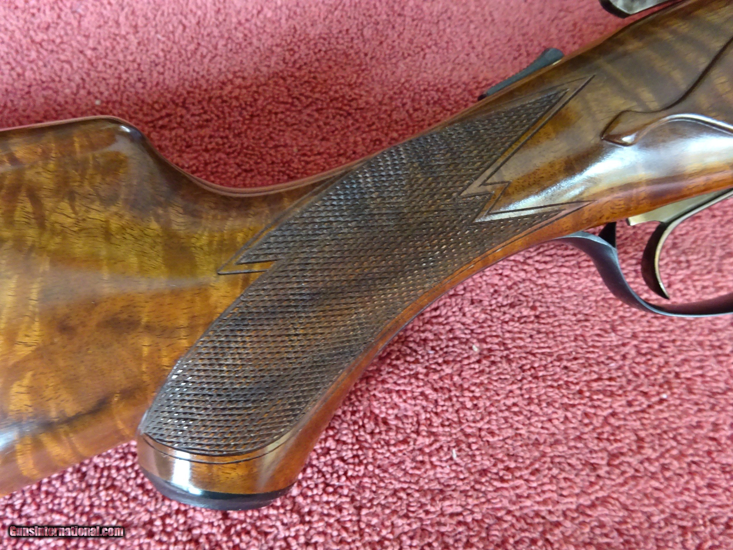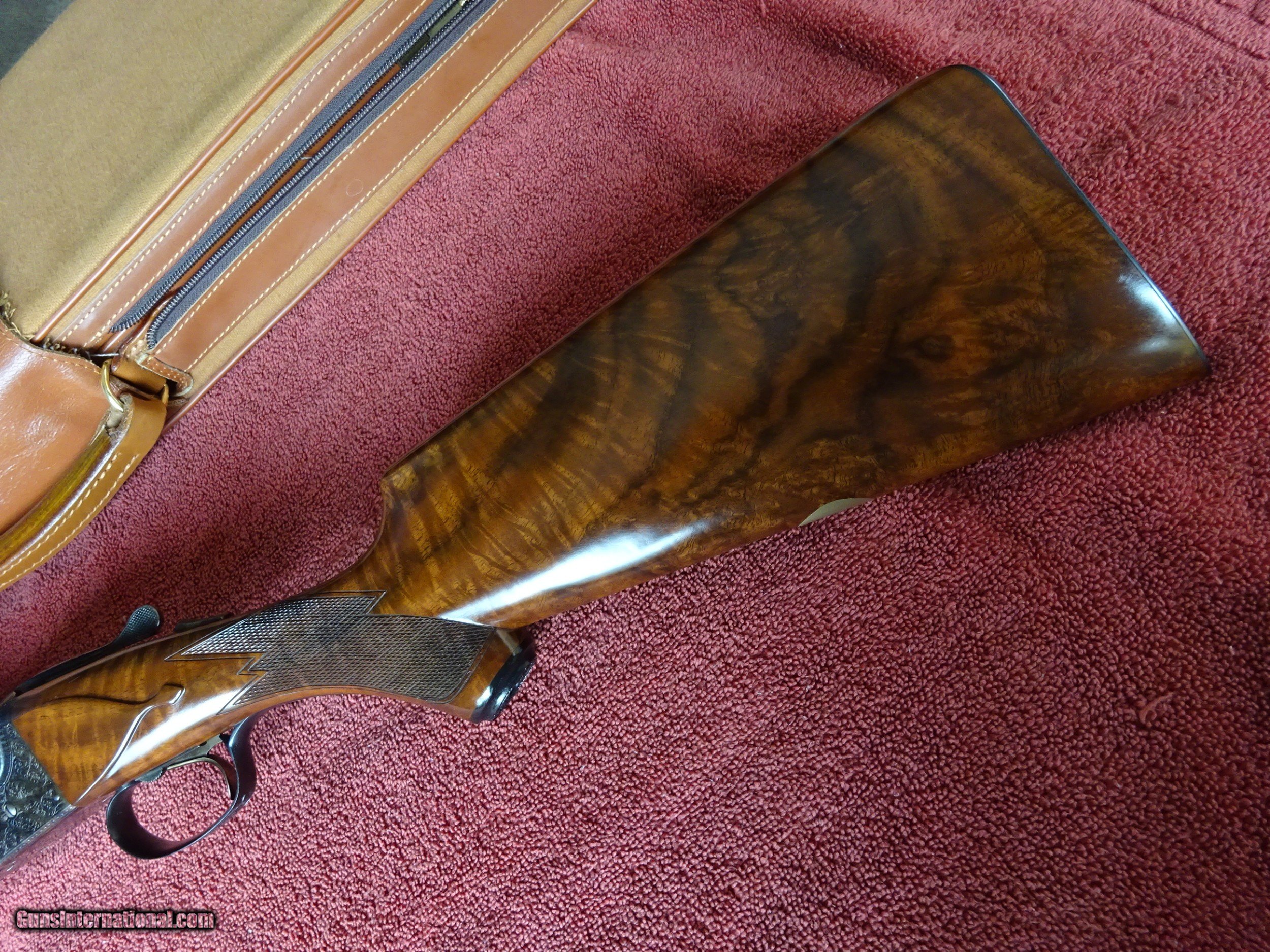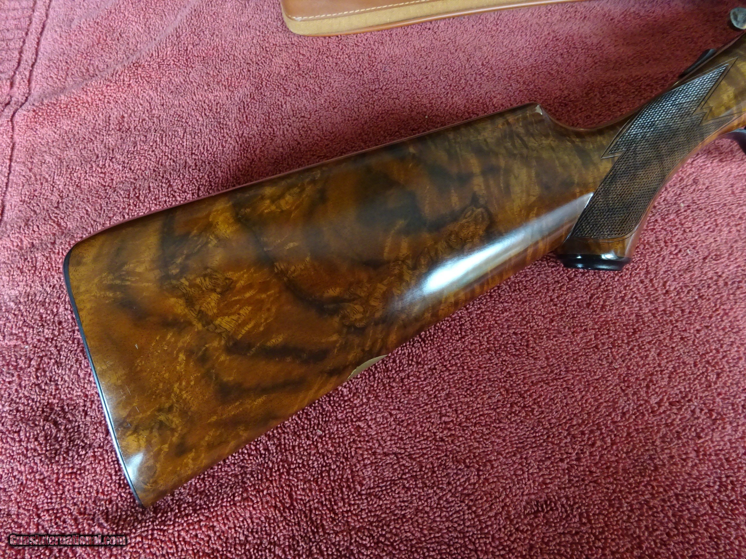 Description: WINCHESTER PARKER REPRODUCTION DHE GRADE 12 GAUGE. 26" BARRELS, 2 3/4" CHAMBERS, IMCYL. AND MODIFIED, 100% BLUE, MIRROR PERFECT BORES, SINGLE SIGHT. TYPICAL ENGRAVING PATTERN WITH HUNTING DOGS ON BOTH SIDES, 3 PHEASANTS IN FLIGHT ON THE FLOOR PLATE, PLUS ACANTHUS SCROLL WORK AND FINE BORDERS, TOP LEVER FOREARM IRON, TRIGGERGUARD, SKELETON BUTTPLATE AND SCREWS ALSO ENGRAVED, 100% BOLD VIVID CASE COLOR. PISTOL GRIP STOCK, SPLINTER FOREARM, OUTSTANDING TRULY EXCEPTIONAL HIGHLY FIGURED WOOD, PERFECT CHECKERING. 1 13/16" X 2 1/4" X 14", 6 1/2 POUNDS INCLUDES ORIGINAL PARKER FELT LINED LEATHER TRUNK CASE, SNAP CAPS AND CANVAS AND LEATHER CASE COVER, ALL IN LIKE NEW CONDITION. MOST PARKER REPROS WERE 20 AND 28 GAUGE, 12 GAUGE GUNS MAKE UP LESS THAN 20% OF THE TOTAL PRODUCTION. 100% ORIGINAL CONDITION, CIRCA MID-1980S. $4500.00 + $50.00 Insured shipping to an FFL address. See all Pats gun listings on this site! We also have hundreds of pieces of ORIGINAL gun company advertising & memorabilia available for sale on our site SPORTINGCOLLECTIBLES. We have no reprints or reproductions. Email for more information. SOLD |