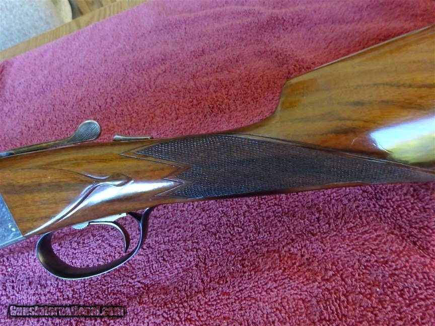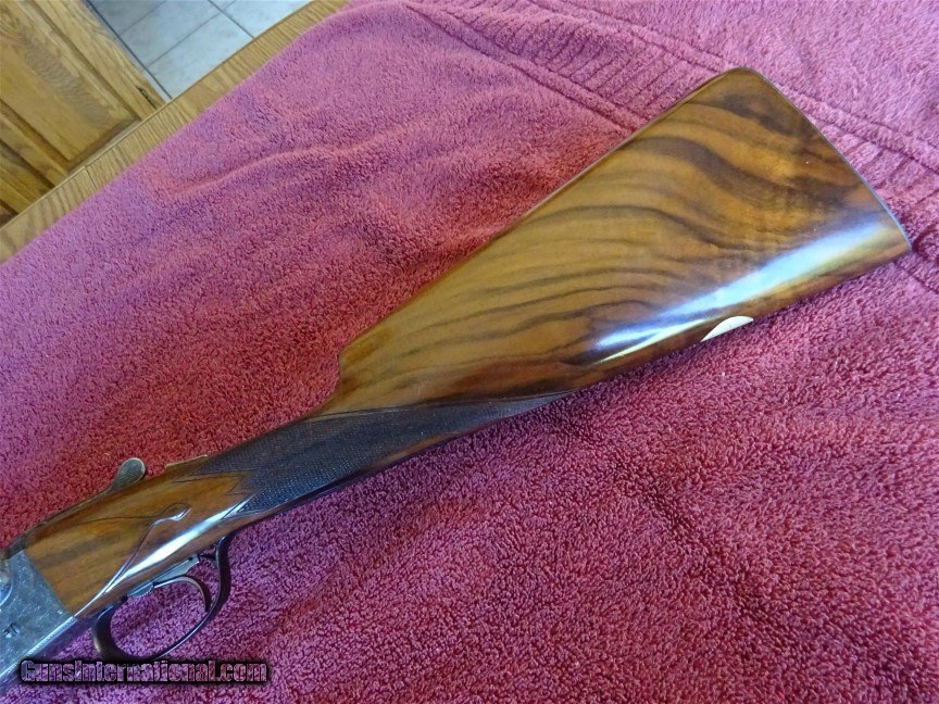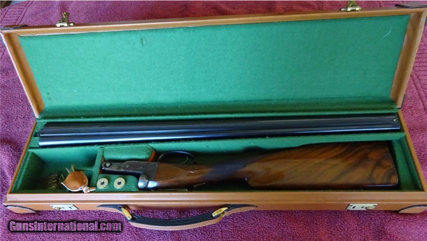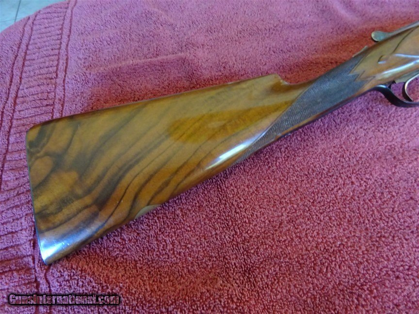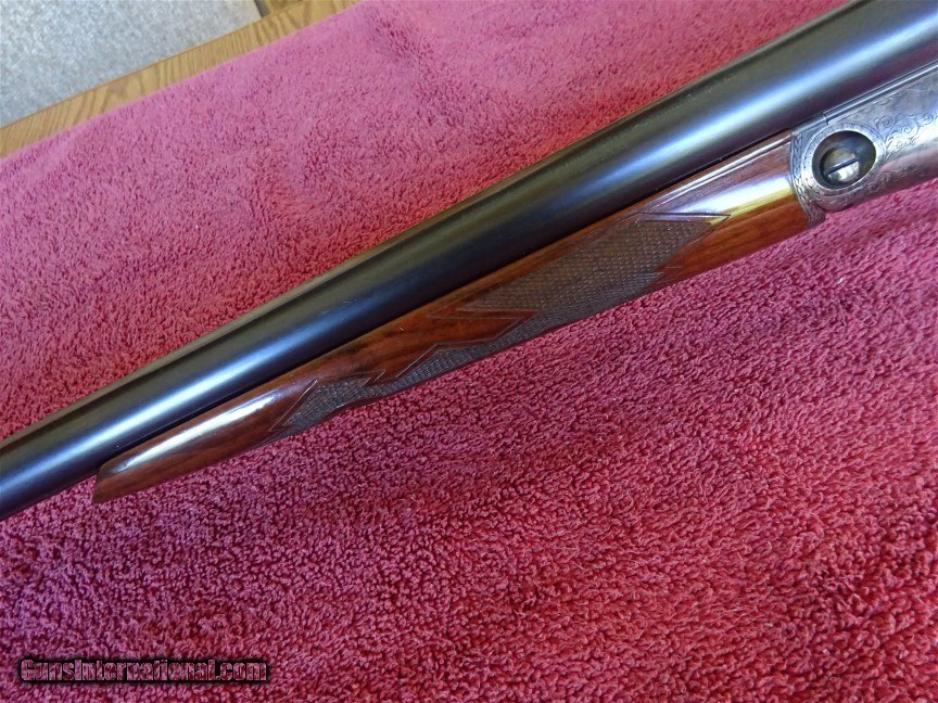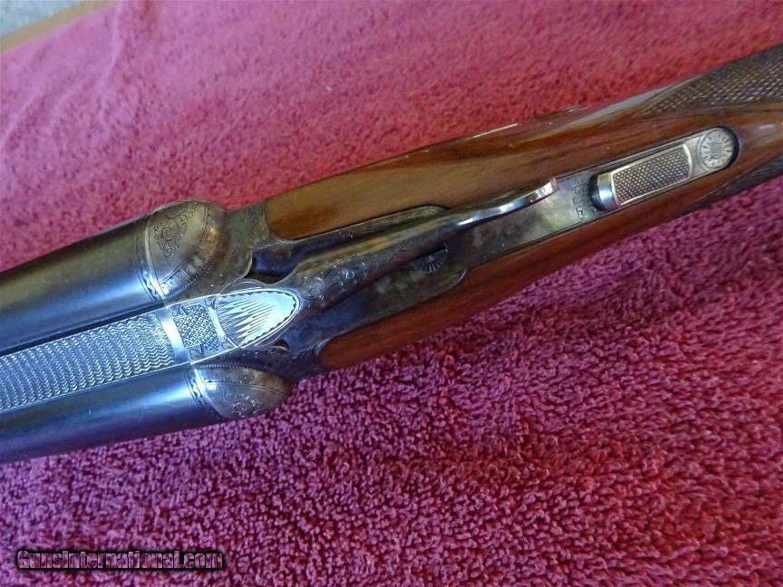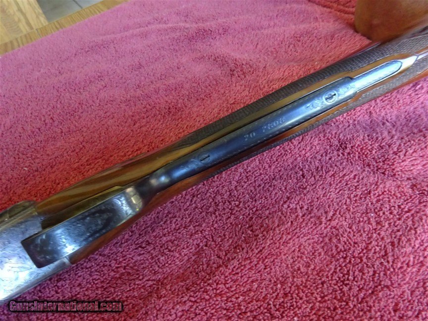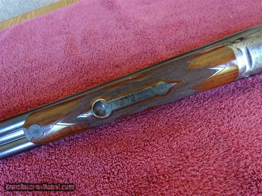 Description: PARKER DHE 20 GAUGE REPRODUCTION, 26" BARRELS, IC & MODIFIED, 100% BLUE INCLUDING TRIGGERGUARD, PERFECT MIRROR BORES. MARKED "PARKER REPRODUCTION BY WINCHESTER 20GA. 2 3/4". TYPICAL GAME SCENE AND SCROLL ENGRAVING, EXCELLENT CASE COLOR COVERAGE BUT SOMEWHAT FADED, UNTOUCHED SCREWS, SINGLE SELECTIVE TRIGGER. STRAIGHT GRIP STOCK, SPLINTER FOREARM, EXCEPTIONAL FIGURE AND COLOR, EXCELLENT CHECKERING AND VARNISH, SKELETON BUTTPLATE, 1 1/4" X 2" X 14 1/4", 6 1/2 POUNDS. ORIGINAL LEATHER TRUNK CASE IN EXCELLENT CONDITION, INCLUDES SNAP CAPS AND KEYS. VERY NICE GUN IN TOTALLY ORIGINAL CONDITION. $3850.00 + $50.00 Insured shipping to an FFL address. See all Pats listings We also have hundreds of pieces of ORIGINAL gun company advertising & memorabilia available for sale. We have no reprints or reproductions. Email for more information. SOLD |