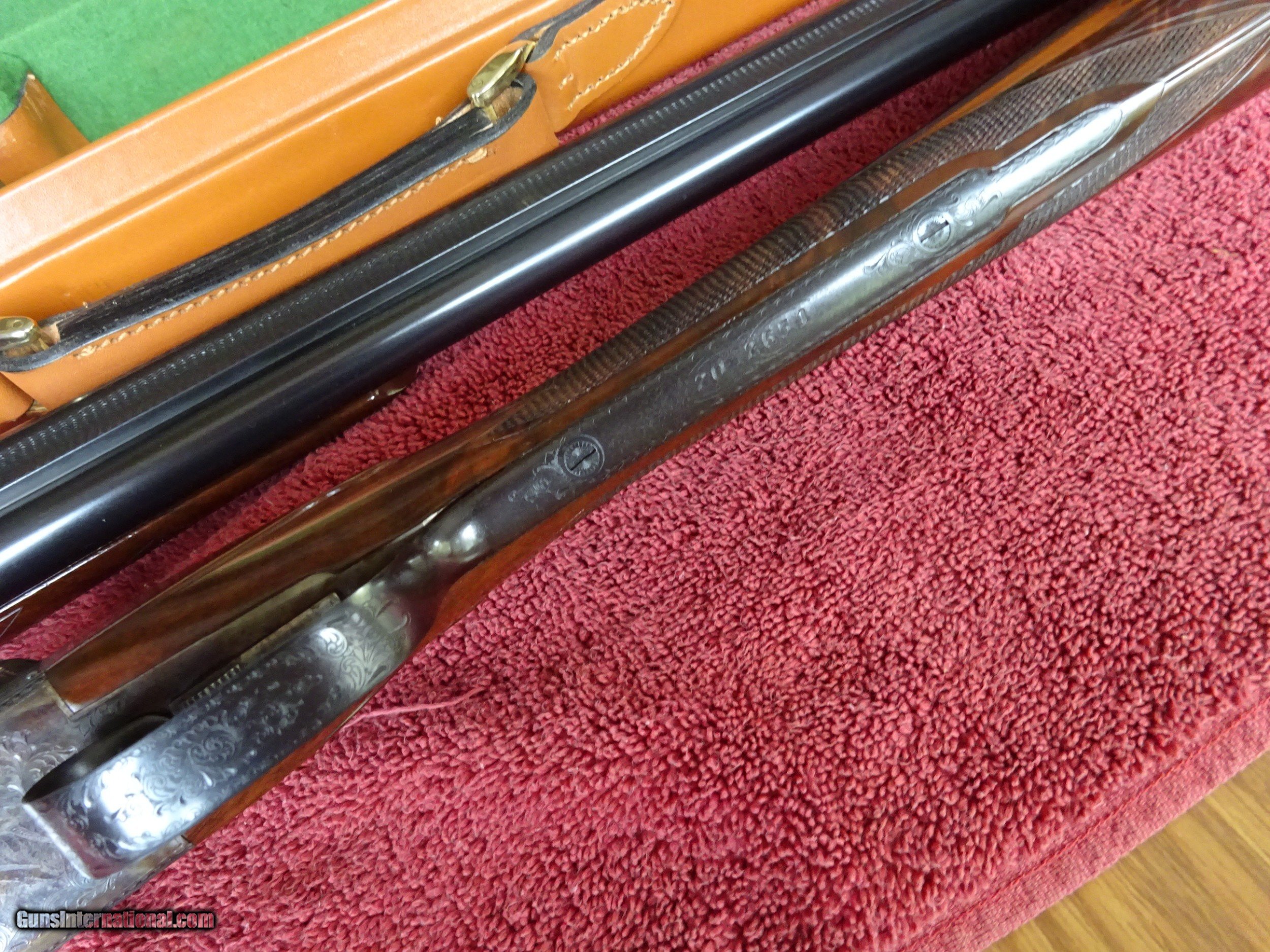 Description: PARKER REPRO, DHE GRADE 20 GAUGE. 26" BARRELS, IMCYL. AND MODIFIED, 100% BRIGHT BLUE, MIRROR PERFECT BORES, AUTOMATIC EJECTORS. SINGLE SELECTIVE TRIGGER, 100% BOLD VIVID CASE COLOR. STRAIGHT GRIP STOCK, SPLINTER FOREARM, PERFECT CHECKERING, ABSOLUTELY GORGEOUS HIGHLY FIGURED WOOD, BY FAR THE BEST I'VE SEEN ON ANY PARKER REPRO., SKELETON BUTTPLATE. ORIGINAL LEATHER TRUNK CASE WITH PARKER-WINCHESTER LABEL, ALSO CANVAS AND LEATHER ZIPPERED COVER, SNAP CAPS AND KEYS. OUTSTANDING ORIGINAL CONDITION WITH ONLY MINOR HANDLING MARKS IN THE VARNISH. 1 1/2" x 2 1/4" x 14 1/4" 6 and a half pounds. $4250.00 + $50.00 Insured shipping to an FFL address. See all Pats listings We also have hundreds of pieces of ORIGINAL gun company advertising & memorabilia available for sale. We have no reprints or reproductions. Email for more information. SOLD Serial Number: 02,xxx |