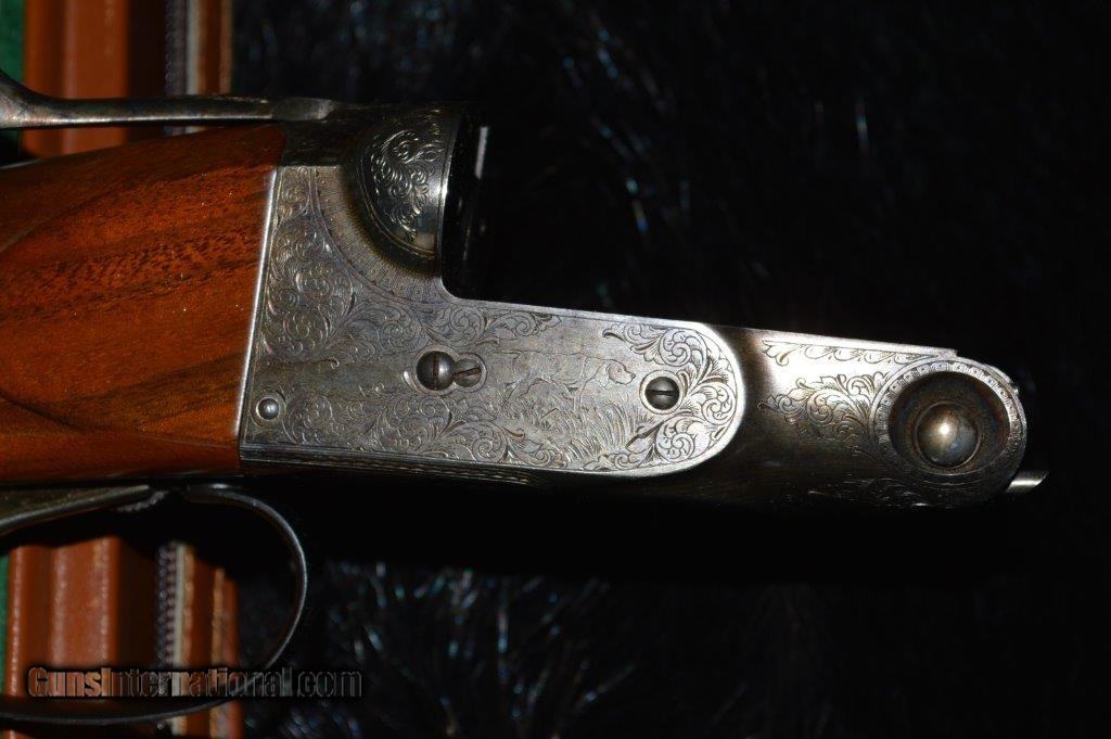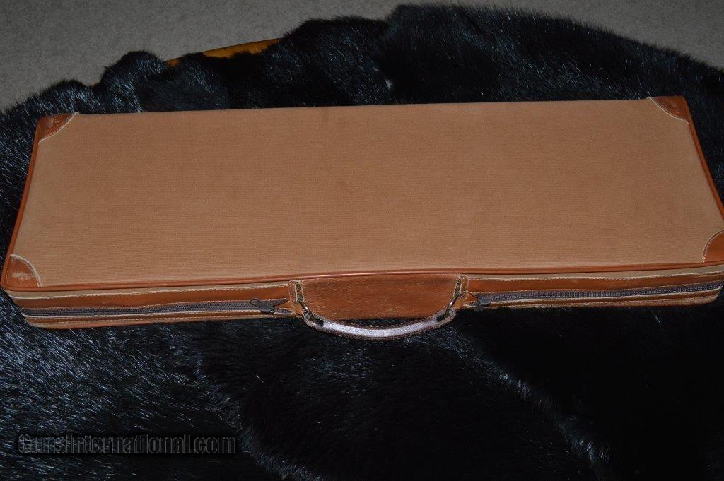 Description: Parker Reproduction 16/20 Combo made by Winchester. Beautiful 2 gauge set with 28 inch 16 gauge barrels choked IC/Mod and 28" 20 gauge barrels choked Full/Mod. The bores are bright and shiny with no pits and the chambers are 3" on the 20 gauge as listed on the back of the sales catalog. The 16 gauge barrels are factory made by Krieghoff in Ulm. The length of pull is 14-3/8" and the drop at the comb is 1-3/8" with the drop at the heal being 2-3/16". The gun only weighs 6-1/2 pounds. The case color on the receiver is in high condition and the bluing on the barrels is 100% finish. The receiver has the typical D grade pattern of a setter on the right side and a pointer on the left side with three pheasants on the bottom. The forearm iron is nicely engraved as well is the forend tip iron. The butt treatment is a typical skeleton steel with the wood in between being checkered. The stock is a capped pistol grip with beautifully figured walnut and exhibits the typical D grade checkering along with the same style of checkering on the forend. And the trigger is a Parker single selective trigger. There are a set of factory 20 gauge snap caps included in the case that has a fabric over case to protect the beautiful leather case and it is lined with green fabric. The sale includes the original sales brochure. SOLD Serial Number: 20-04283 |