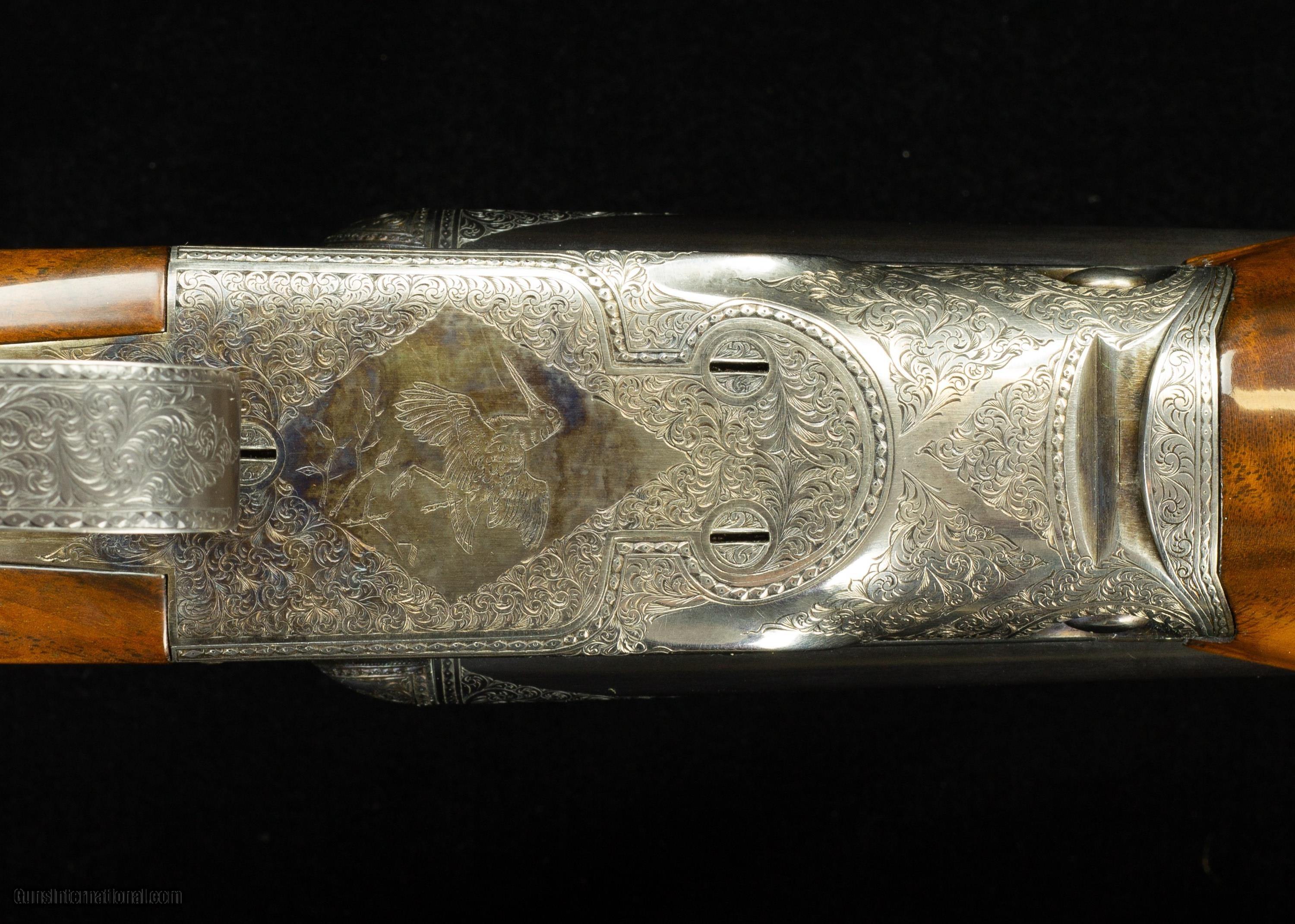 Description: Parker Reproduction BHE 20 gauge 2bbl set with manufacturer’s case. 28” & 26” bbls with a raised solid rib, chambered 2-3/4” & 3”, and choked at FULL/MOD. Single selective trigger, ejectors, beavertail forearm, and capped semi pistol grip stock with a skeleton butt plate. SOLD Stock Comb: 1-1/4 Stock Heel: 2 LOP: 14-1/4 |