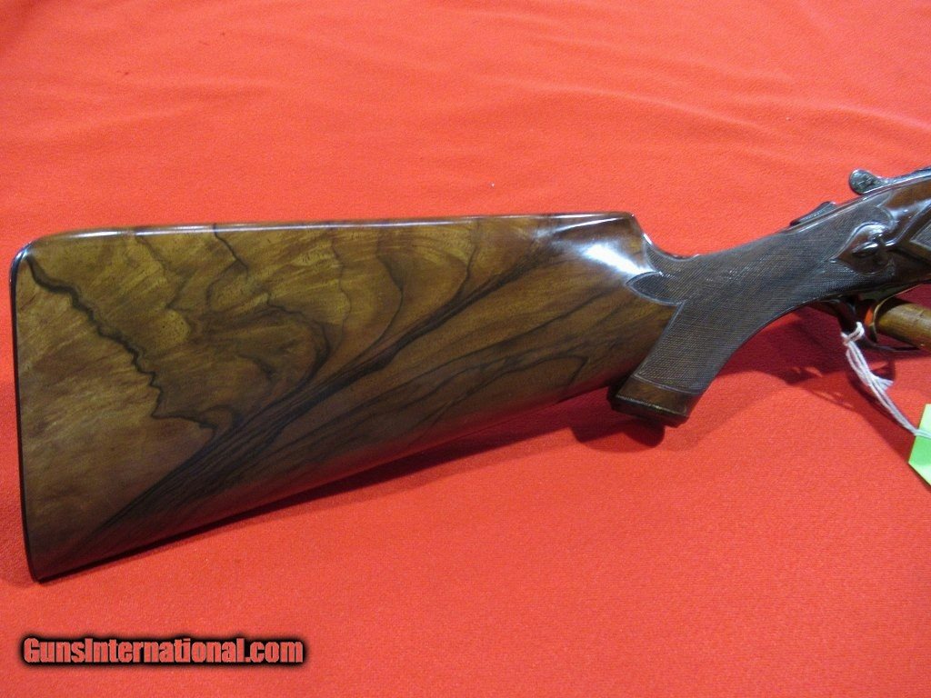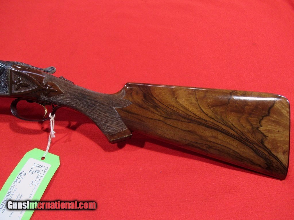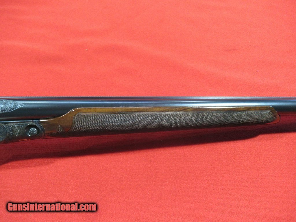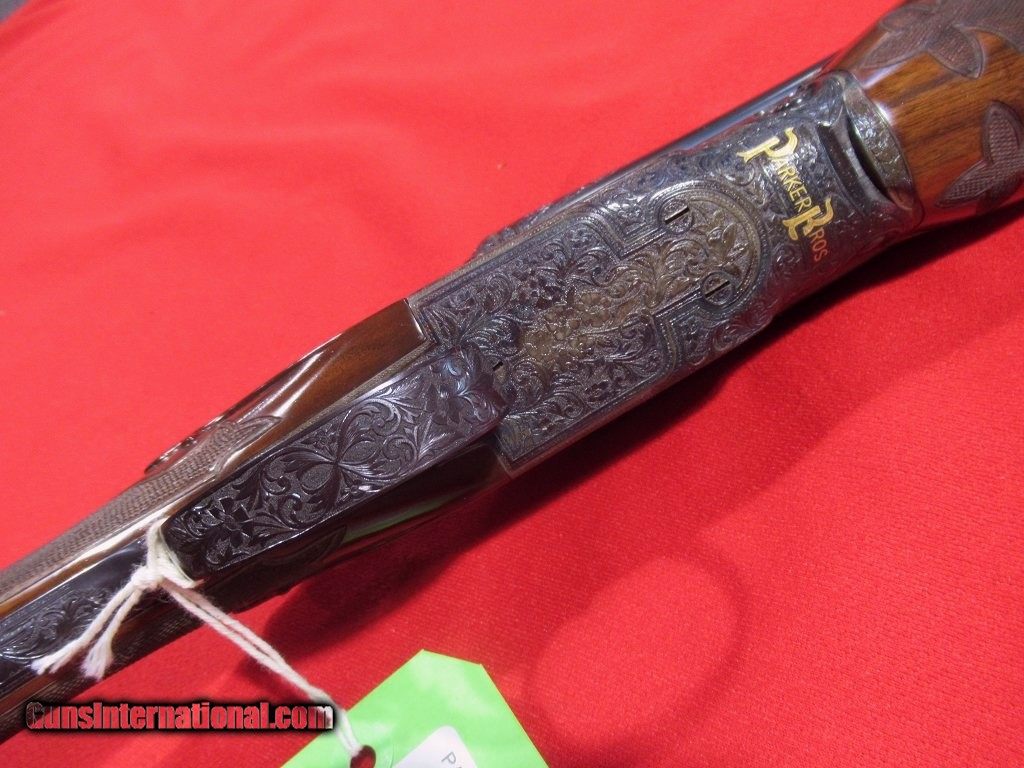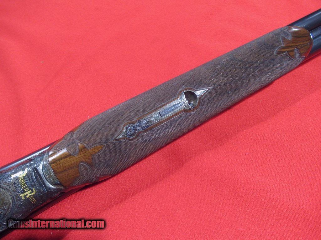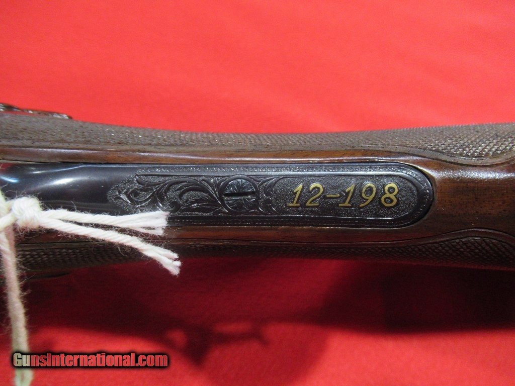 Description: Parker Reproduction A-1 Special that was purchased in-the-white and finished by the original owner. Deep relief floral and scroll pattern with gold accents by Sam Kinemuchi, engraved barrel wedges, and engraved skeleton butt plate. This two barrel set has 26" Q1/Q2 barrels and 28" Mod/Full barrels. Highly figured pistol grip stock with beavertail forend, single selective trigger, and grip cap. Comes with a two-barrel Parker Repro. case with dust cover. Excellent condition showing limited sign of use. SOLD |