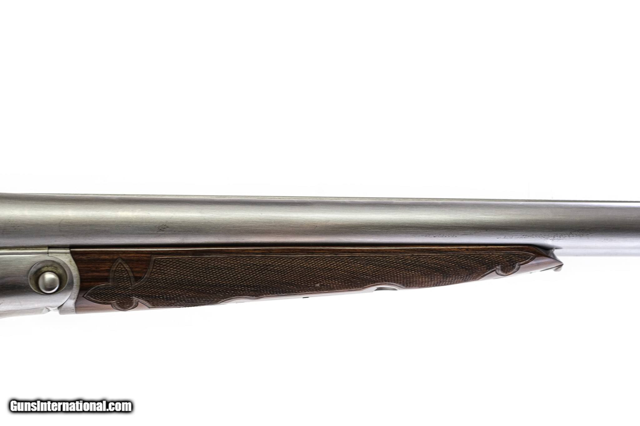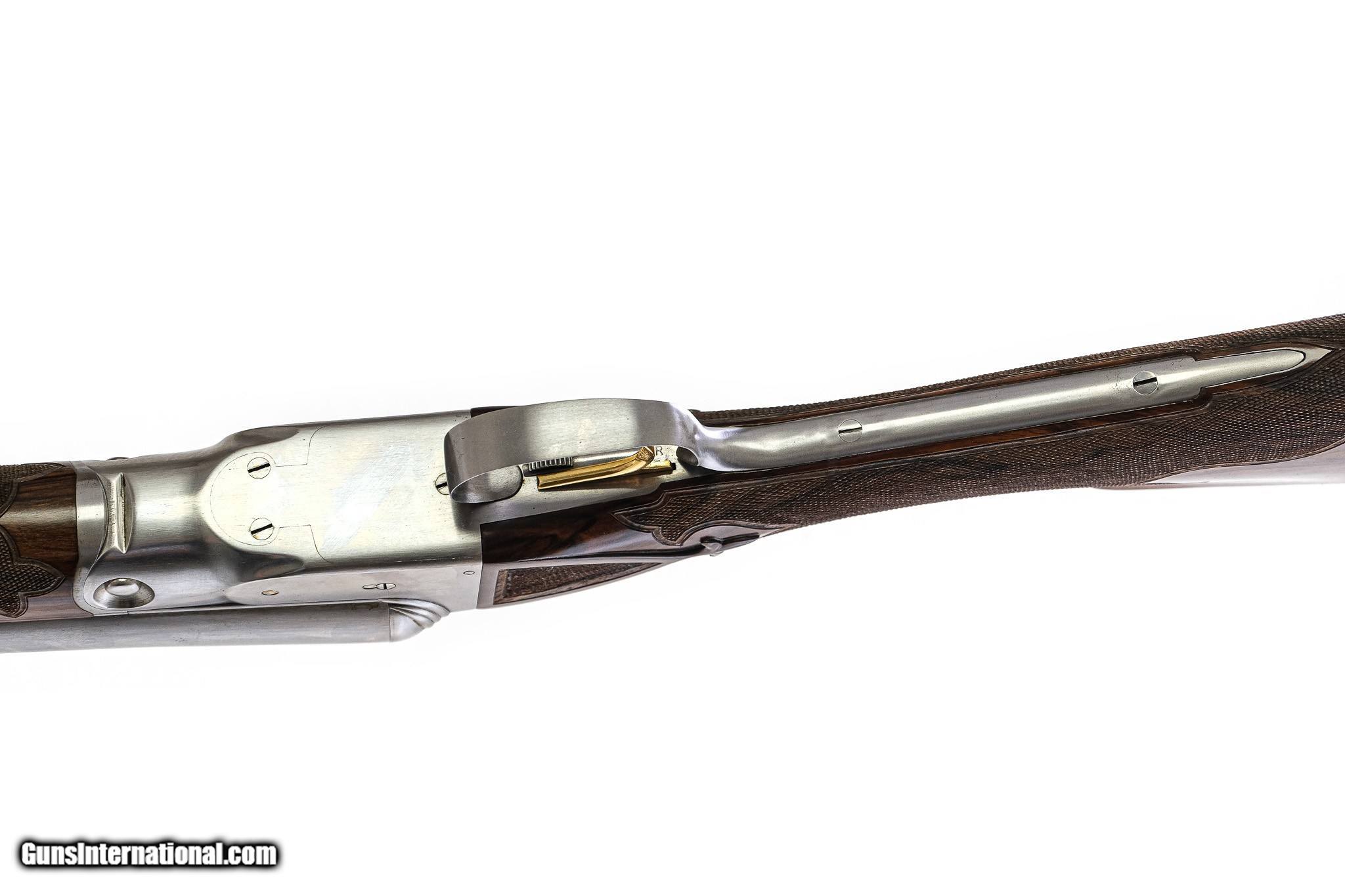 Description: Parker Reproduction - A1 Special, SxS, 12ga. 26" Barrels Choked IC/IM. Splinter forend, single selective trigger, straight grip, auto ejector, marble cake highly figured buttstock, complete finish with Fleur-De-Lis checkering, skeleton butt. The gun is brand new and should be shot the way it is, has custom engraving as well. Inv: 76678 6 lbs. 13 oz. 14 ¼" x 1 3/8" x 2 1/8" $8,900.00 SOLD |
