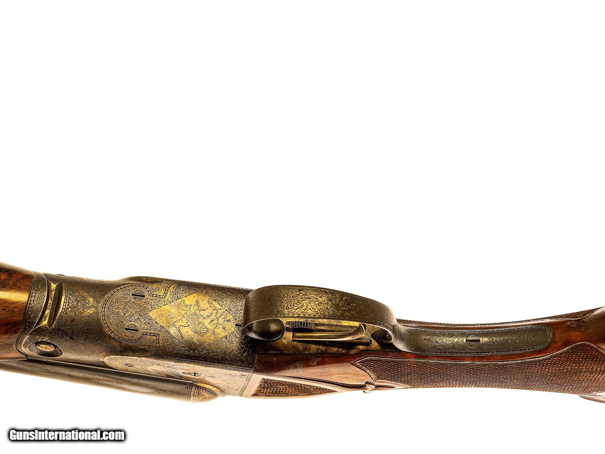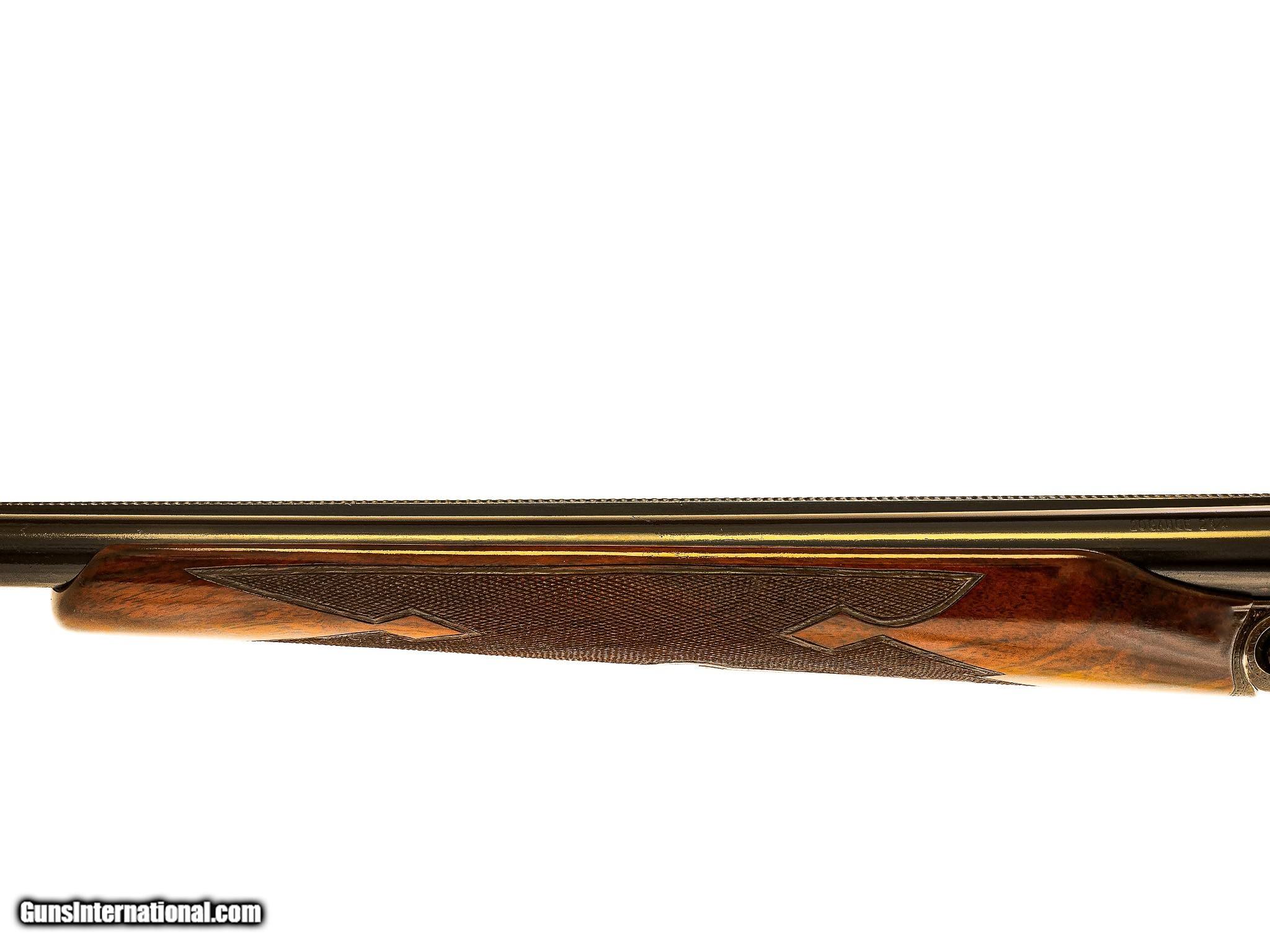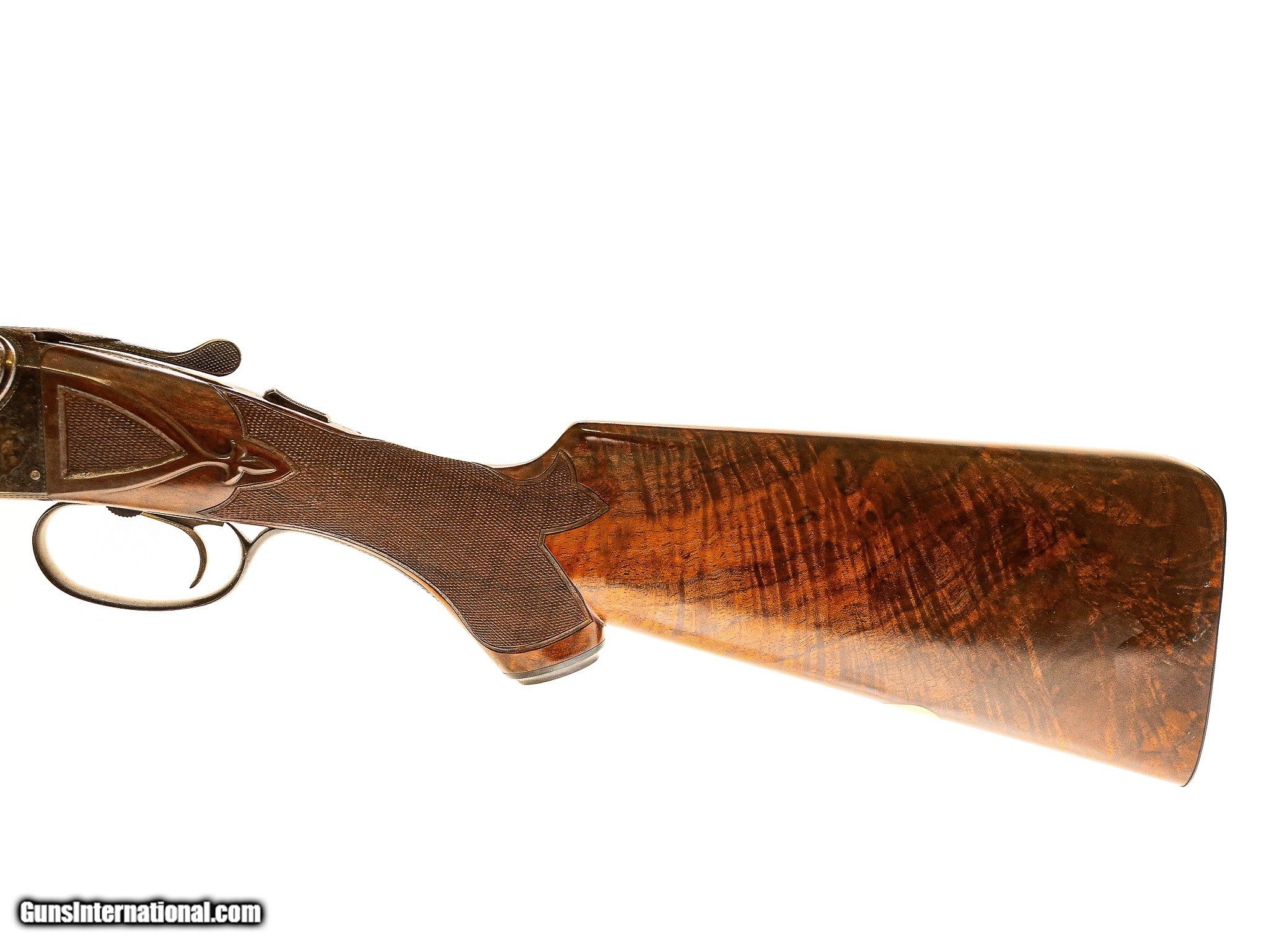 Description: Parker Reproduction - BHE Grade, SxS, RARE Two Barrel Set, 20ga. 30" F/F & 26" Q1/Q2. This gun is new, never shot, and only assembled by us. Factory single selective trigger, factory beavertail forend, drop point, elaborate checkering, capped pistol grip, gold oval, jeweled forend. Two sets of barrels: 20ga 30" Barrels Choked F/F, 3" Magnum, and 20ga 26" Barrels Choked Q1/Q2, 2 3/4" Chambers. Barrels have original grease on them. Ultra rare configuration, with the highest quality of feather crotch wood available, 100% case color, 100% wood finish, 100% Fleur De Lis checkering, and 100% blue. Brand new without a mark on it. This is one of the rarest configurations of Parkers we have had. Inv: 64083 14 1/4" x 1 1/2" x 2 1/4" $13,995.00 CALL 860-225-6581 FOR FURTHER INFORMATION ABOUT THIS GUN & THE INSPECTION PERIOD. SOLD |