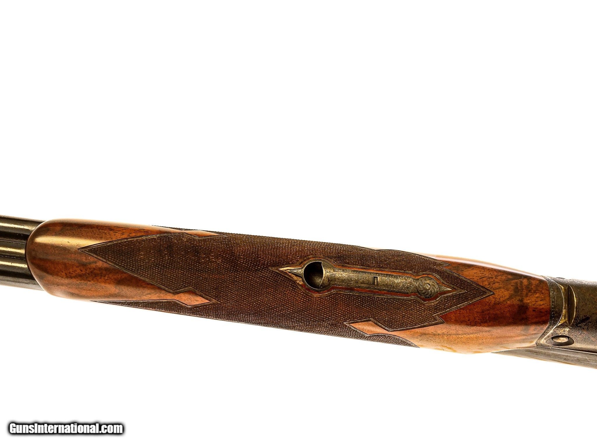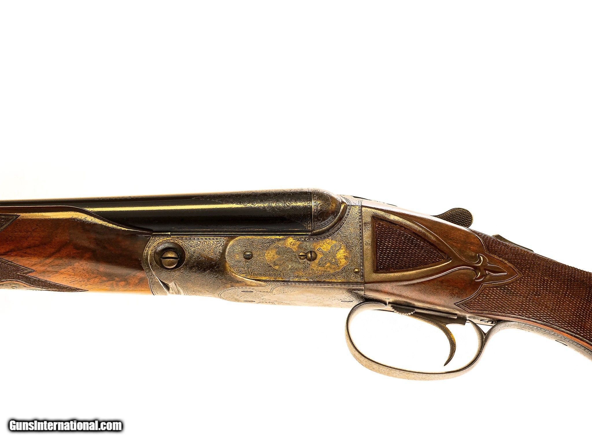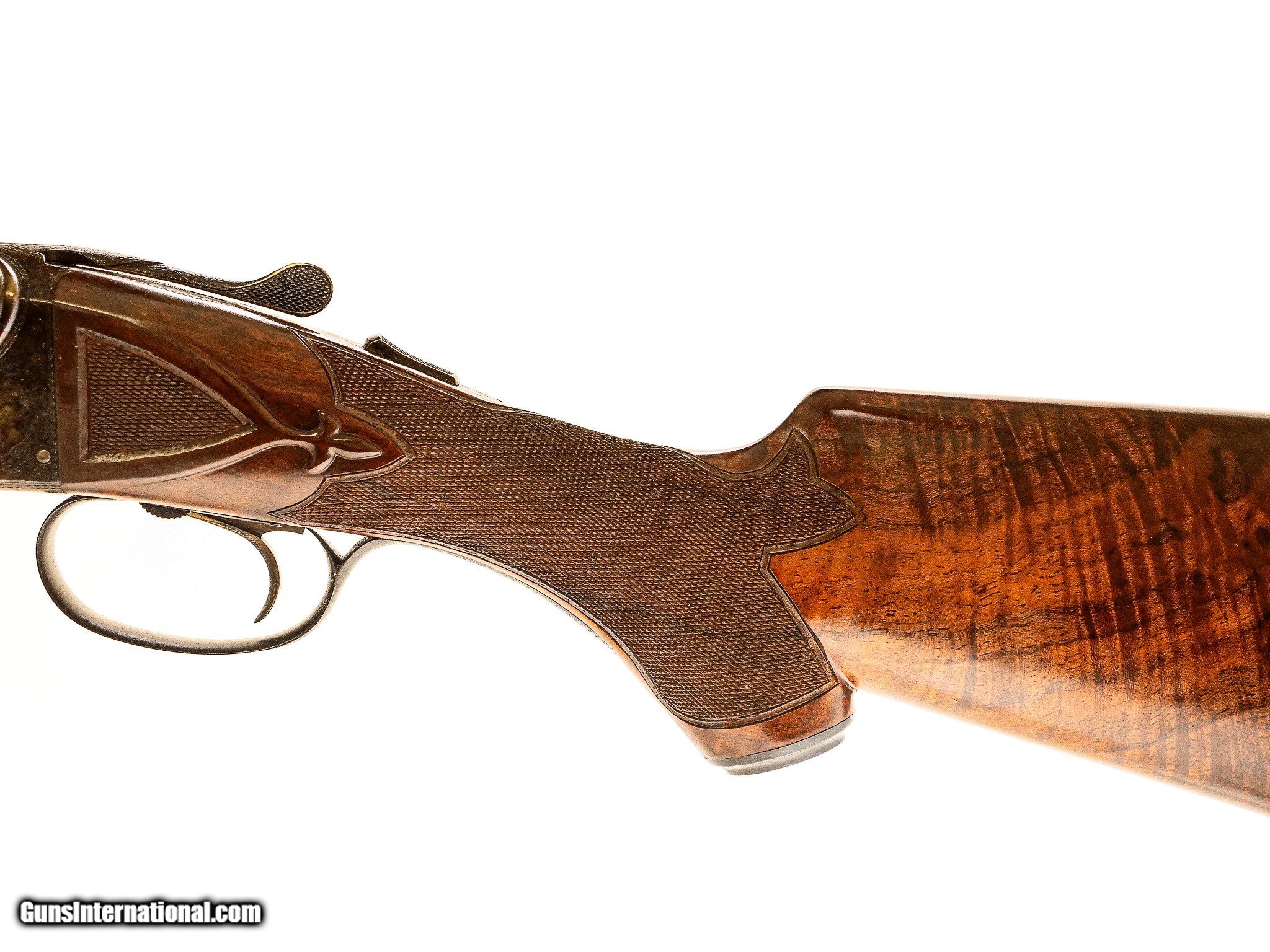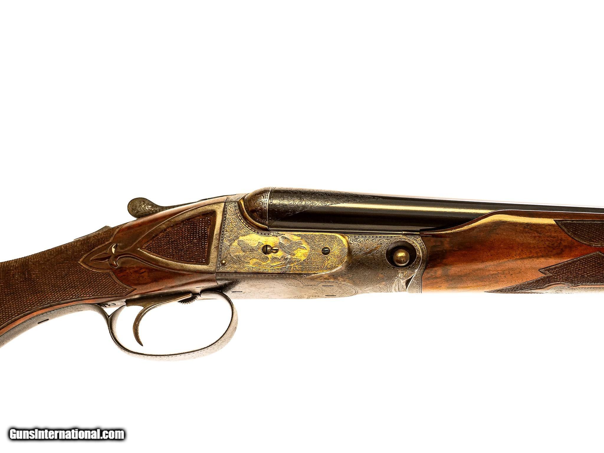 Description: Parker Reproduction - BHE Grade, SxS, RARE Two Barrel Set, 20ga. 30" F/F & 26" Q1/Q2. This gun is new, never shot, and only assembled by us. Factory single selective trigger, factory beavertail forend, drop point, elaborate checkering, capped pistol grip, gold oval, jeweled forend. Two sets of barrels: 20ga 30" Barrels Choked F/F, 3" Magnum, and 20ga 26" Barrels Choked Q1/Q2, 2 3/4" Chambers. Barrels have original grease on them. Ultra rare configuration, with the highest quality of feather crotch wood available, 100% case color, 100% wood finish, 100% Fleur De Lis checkering, and 100% blue. Brand new without a mark on it. This is one of the rarest configurations of Parkers we have had. Inv: 64083 14 1/4" x 1 1/2" x 2 1/4" $13,995.00 CALL 860-225-6581 FOR FURTHER INFORMATION ABOUT THIS GUN & THE INSPECTION PERIOD. SOLD |