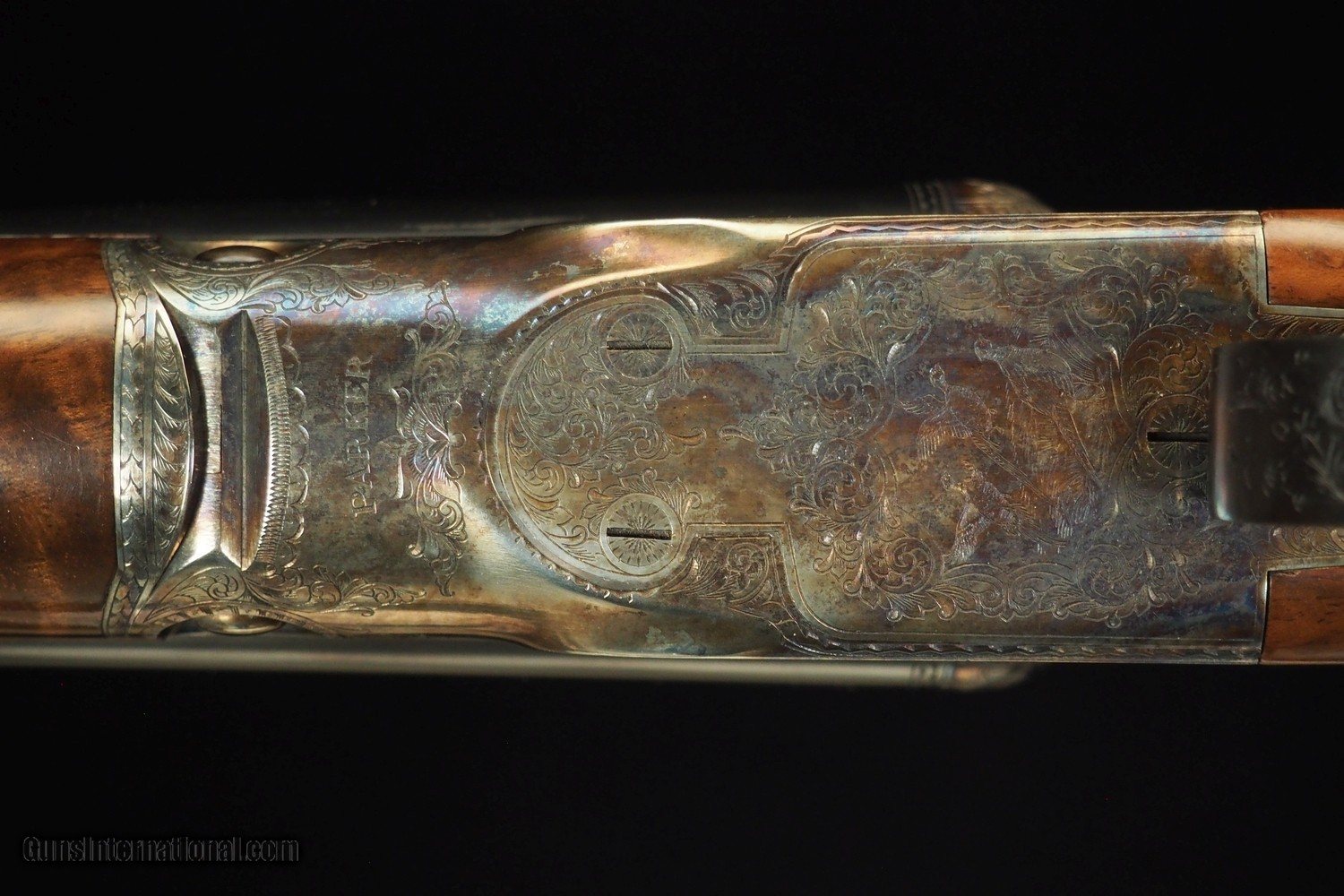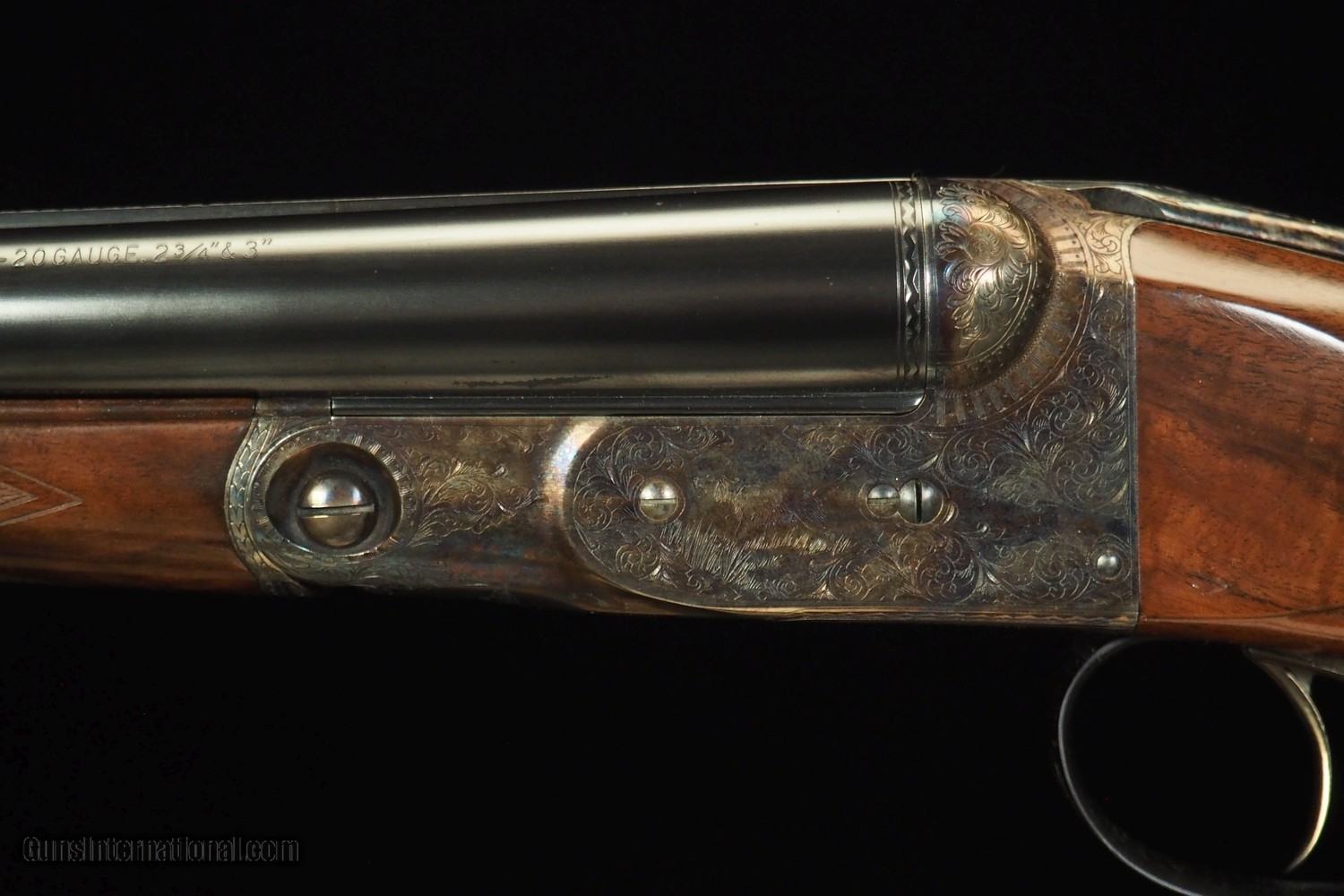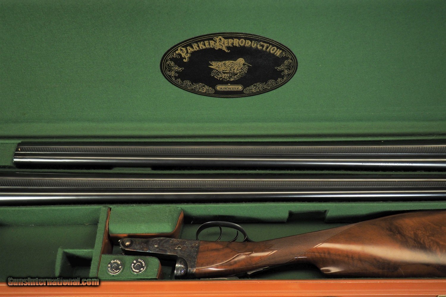 Description: **Sale Pending** Parker Reproduction, DHE, 20 bore, 2 barrel set, 26" barrels with 2 3/4" chambers and choked IC and Mod, 28" barrels with 3" chambers and choked Mod and Full, barrels have wide concave machined game ribs and rib extensions 6 lbs. 8 oz. with 26" barrels and 6 lbs. 9 oz. with 28" barrels, case hardened boxlock action with acanthus scroll and game scene engraving, top tang automatic safety, long trigger guard extension, double triggers, 14 1/4" LOP over a skeleton butt, 1 1/2" DAC, 2 1/8" DAH, neutral cast, nicely figured walnut, drop points, splinter forend, vacant gold oval. Comes with original labeled leather case with snap caps and case keys. Condition: excellent used condition with top lever well right of center indicating very little use, case colors remain 90%, wood has a couple of handling marks with one on right side of butt that can be seen in photo, case exterior with some scuffs. SOLD |