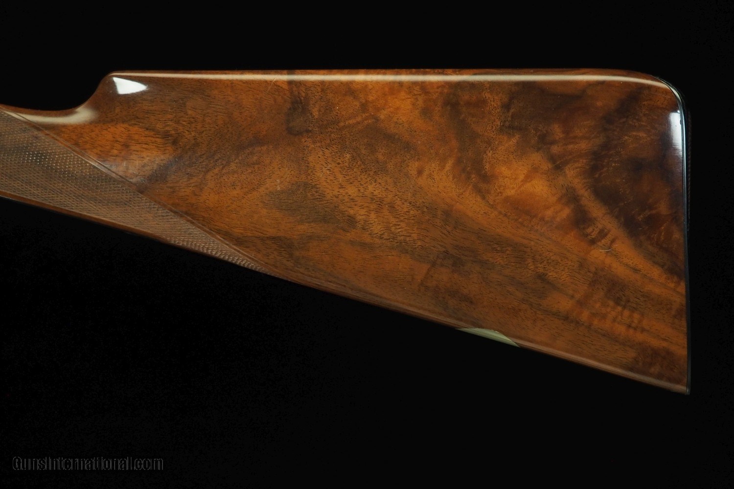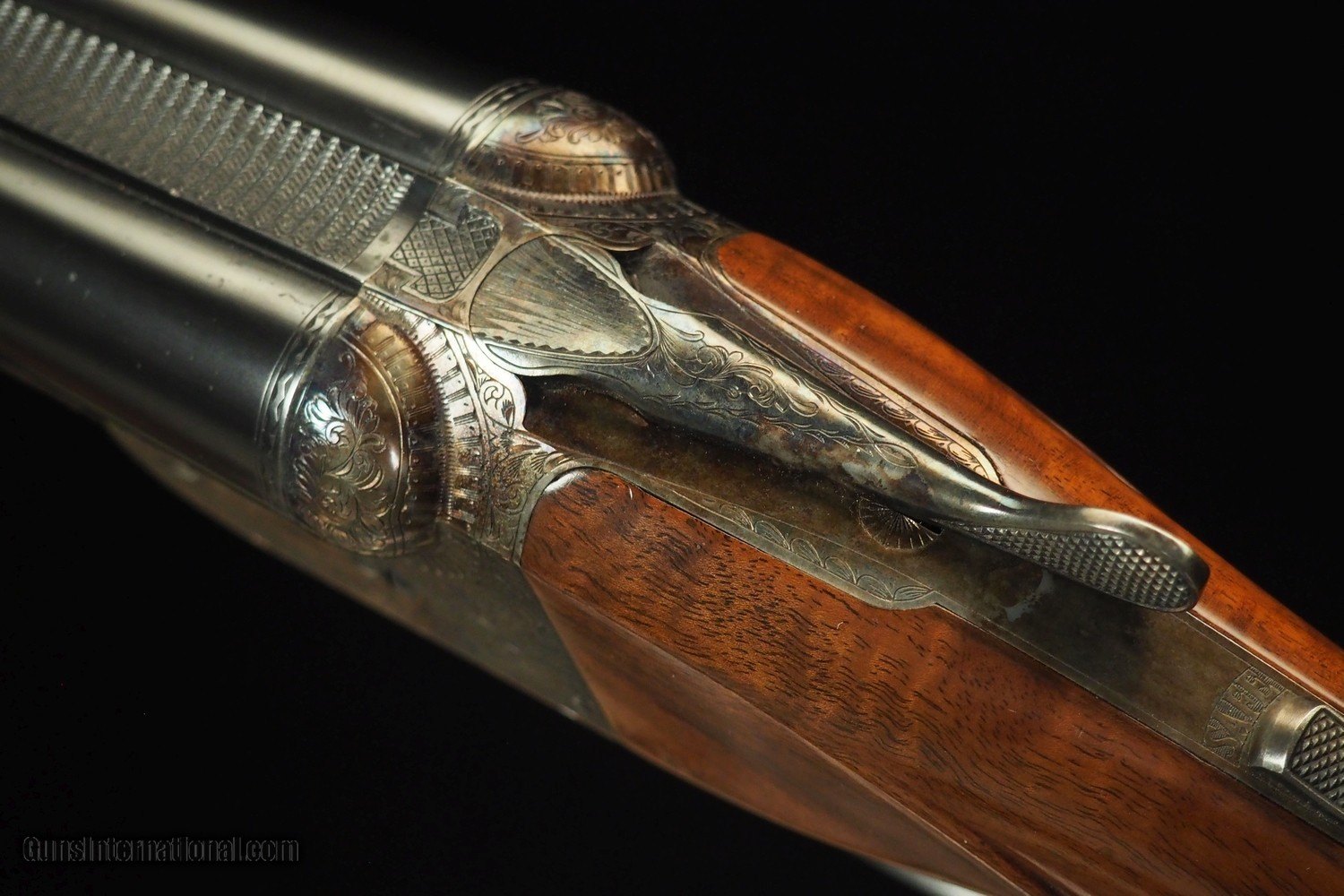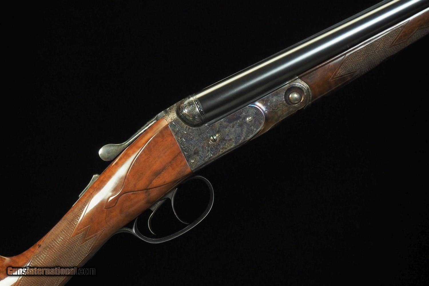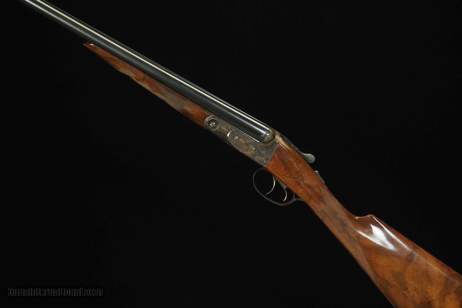 Description: **Sale Pending** Parker Reproduction, DHE, 20 bore, 2 barrel set, 26" barrels with 2 3/4" chambers and choked IC and Mod, 28" barrels with 3" chambers and choked Mod and Full, barrels have wide concave machined game ribs and rib extensions 6 lbs. 8 oz. with 26" barrels and 6 lbs. 9 oz. with 28" barrels, case hardened boxlock action with acanthus scroll and game scene engraving, top tang automatic safety, long trigger guard extension, double triggers, 14 1/4" LOP over a skeleton butt, 1 1/2" DAC, 2 1/8" DAH, neutral cast, nicely figured walnut, drop points, splinter forend, vacant gold oval. Comes with original labeled leather case with snap caps and case keys. Condition: excellent used condition with top lever well right of center indicating very little use, case colors remain 90%, wood has a couple of handling marks with one on right side of butt that can be seen in photo, case exterior with some scuffs. SOLD |