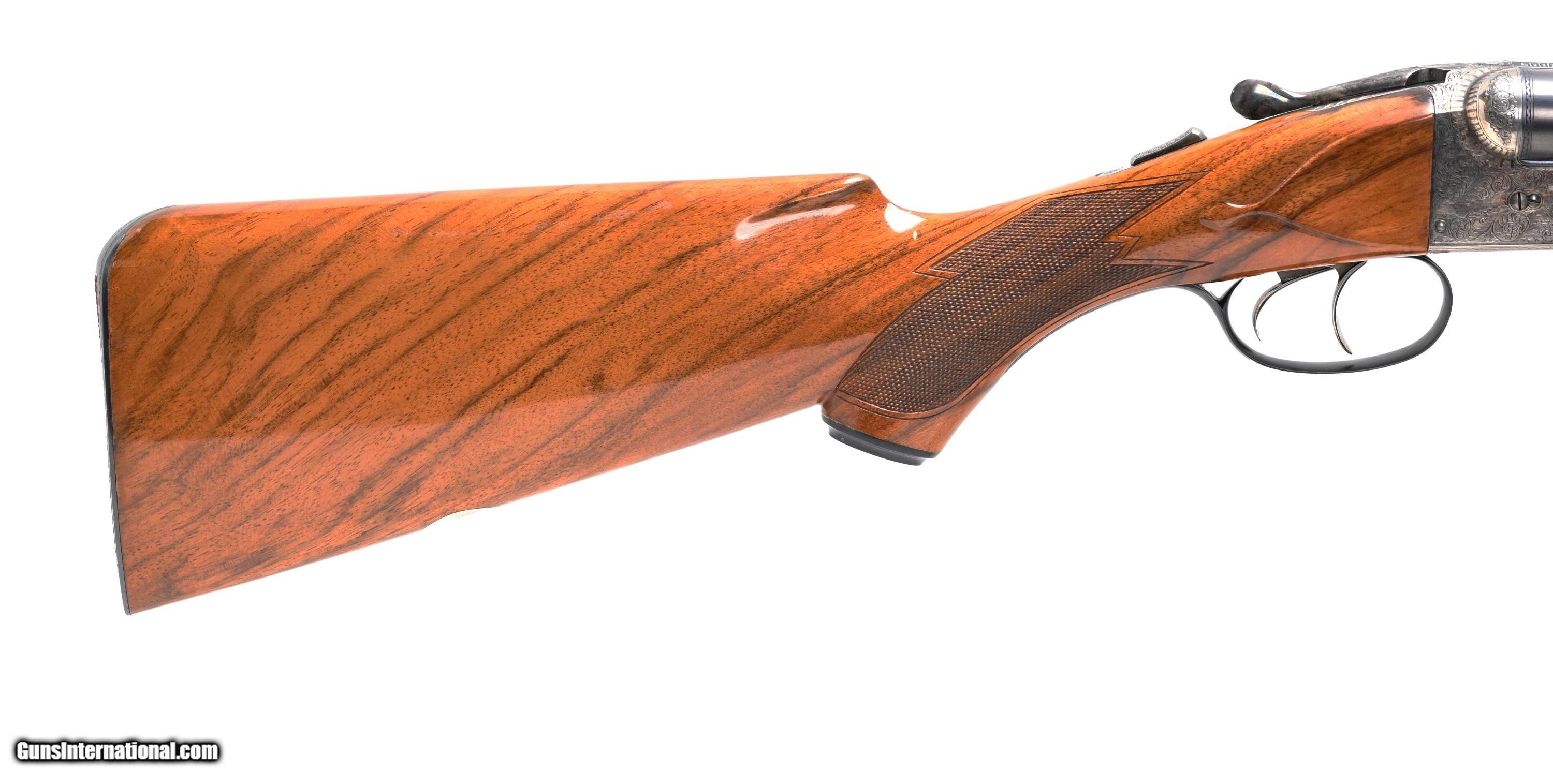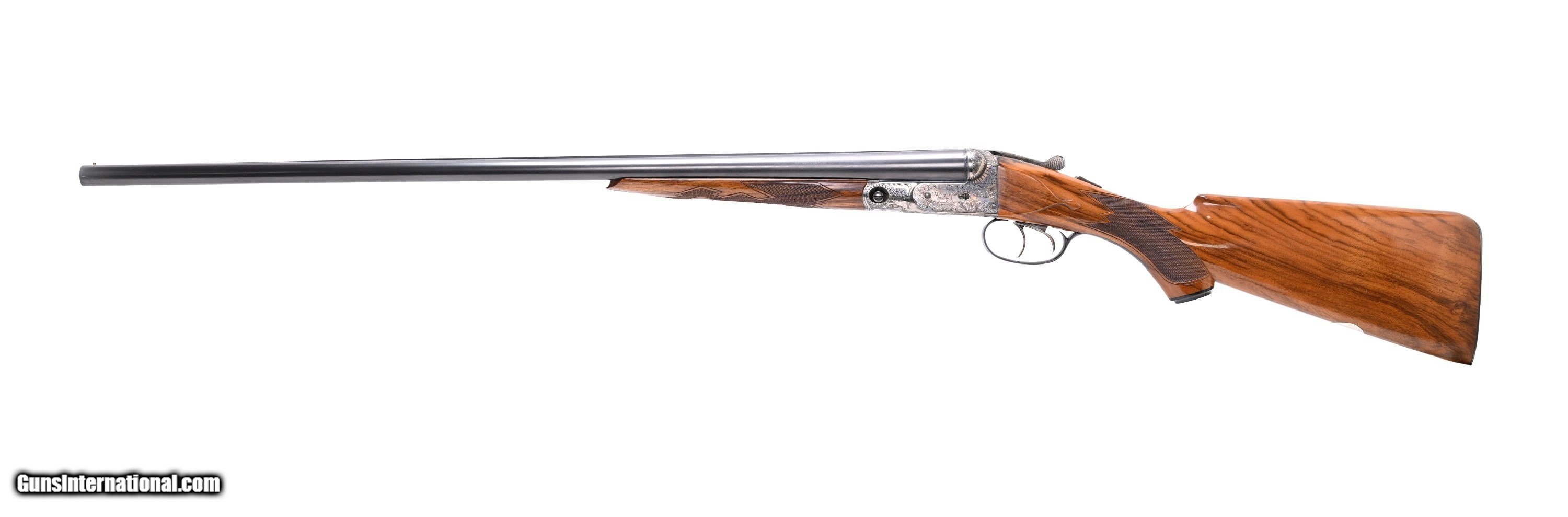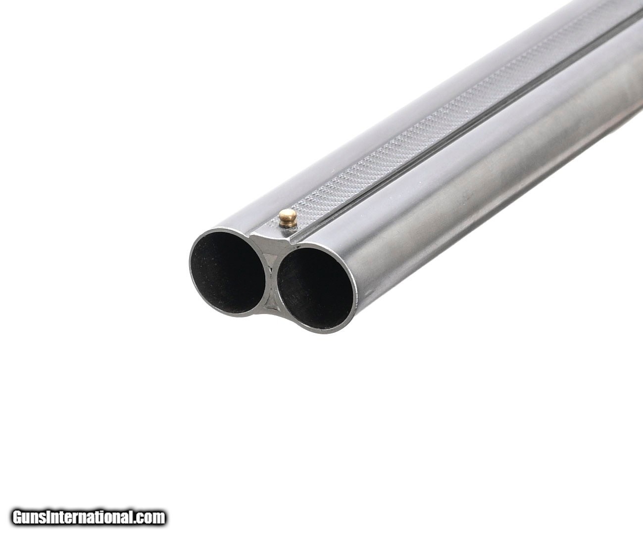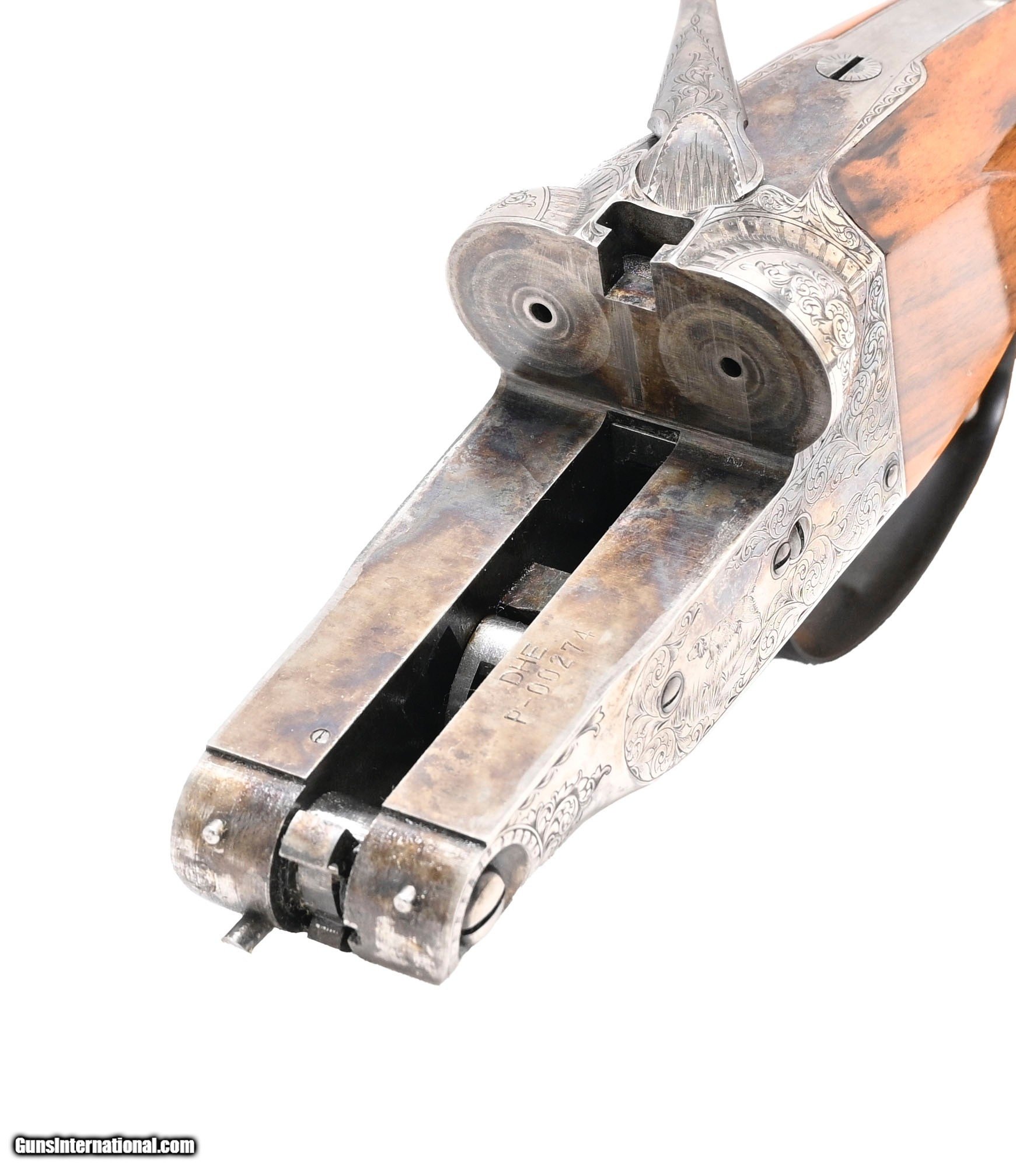 Description: "Early" Parker Reproduction DHE 20 gauge SxS shotgun. "P" series serial number that often indicated a Prototype gun. This gun is configured with 28" barrels choked Modified & Full. Chambered for both 2 3/4" & 3" cartridges. Double triggers. The Prince of Wales grip butt stock has a skeleton butt plate with a 14 1/4" length of pull. 1 1/2" drop at the comb and 2 1/2" drop at the heel with slight cast for a right hand shooter. Matching splinter forearm with Deeley style release latch. This gun has seen gentle use. No marks, scratches or damage. The blued metal pieces are excellent. The wood is excellent. The case colors have faded on the receiver to the point that the receiver almost looks polished! Mechanically excellent. Price: $4,500.00 Contact Seller |