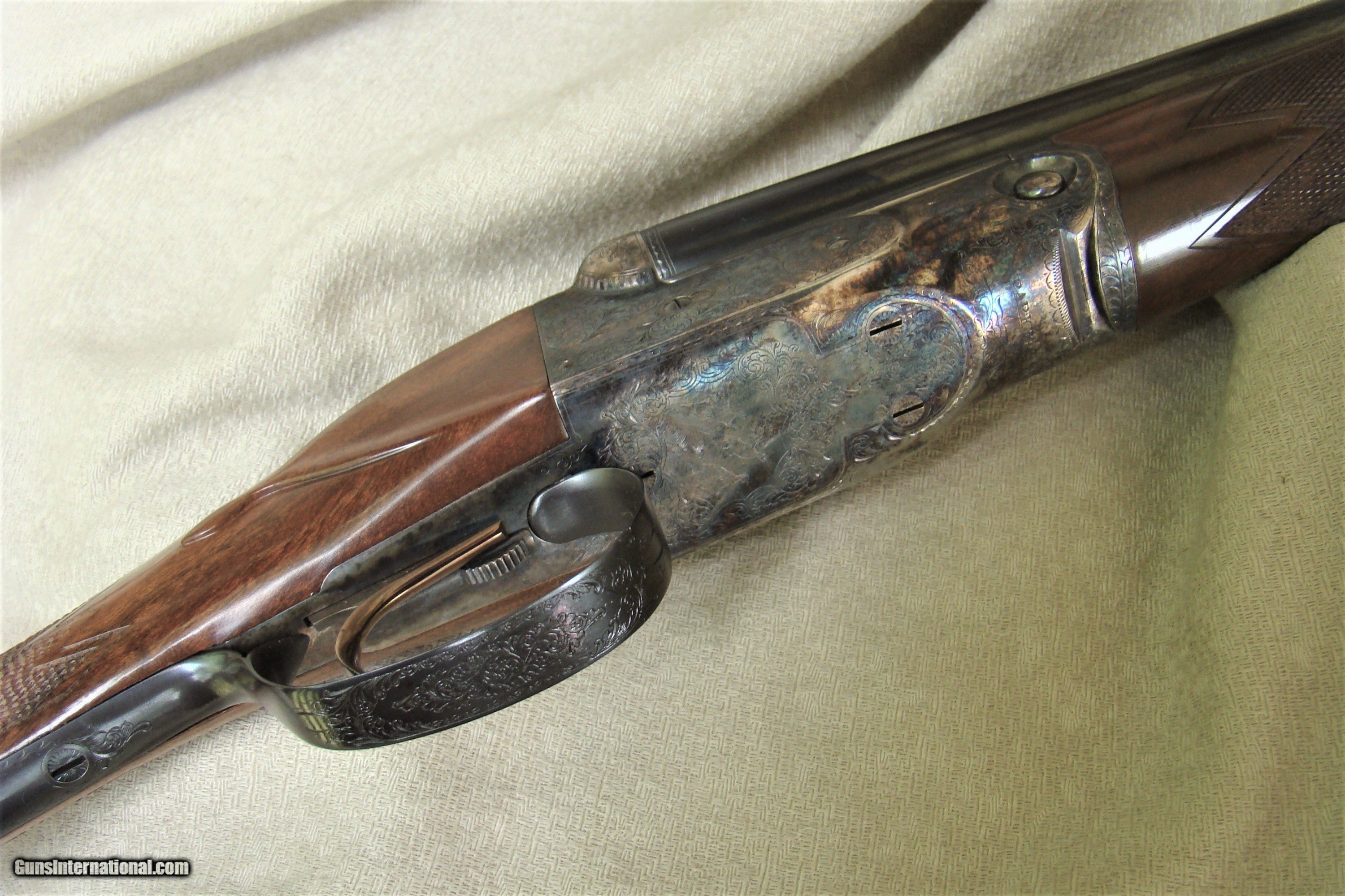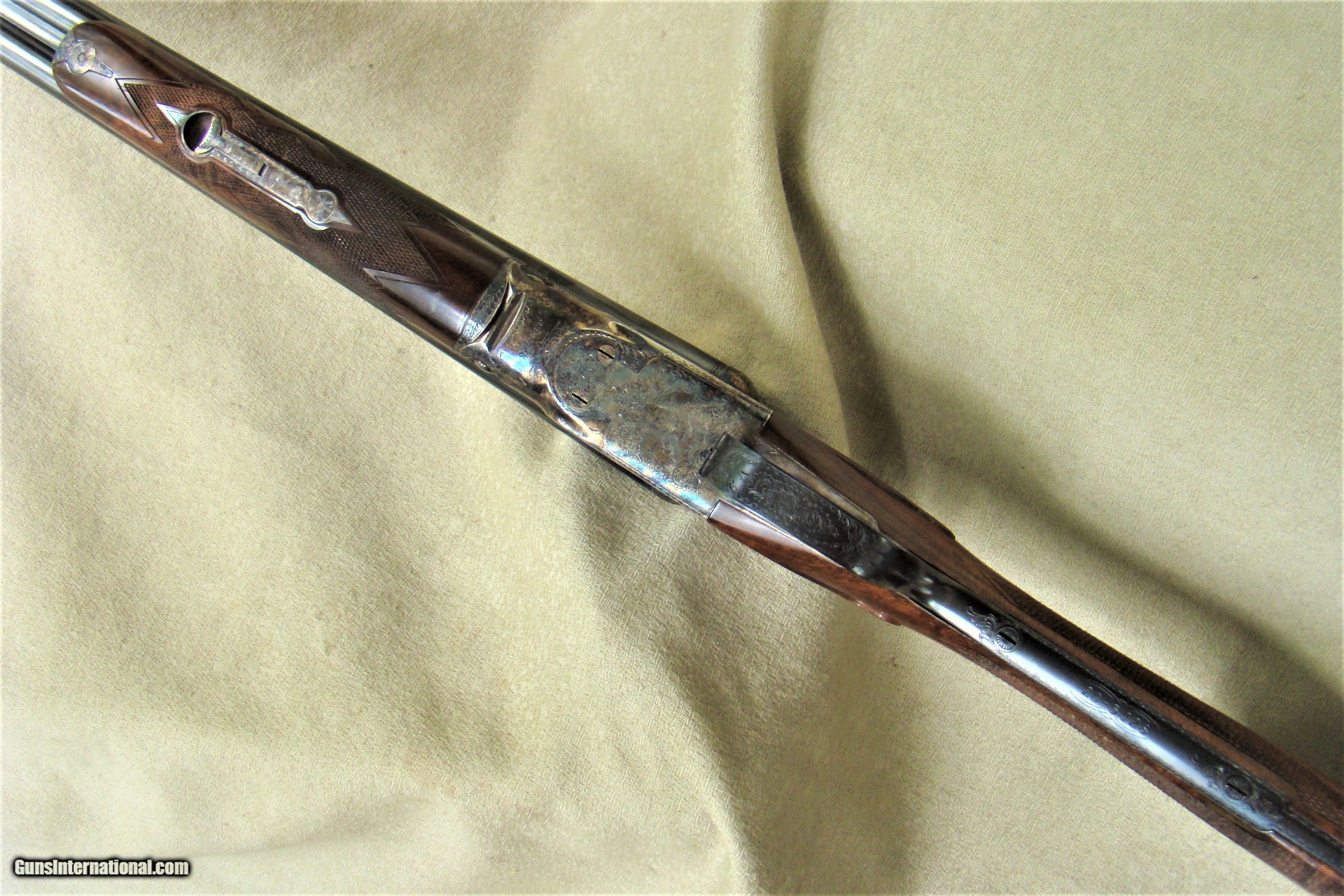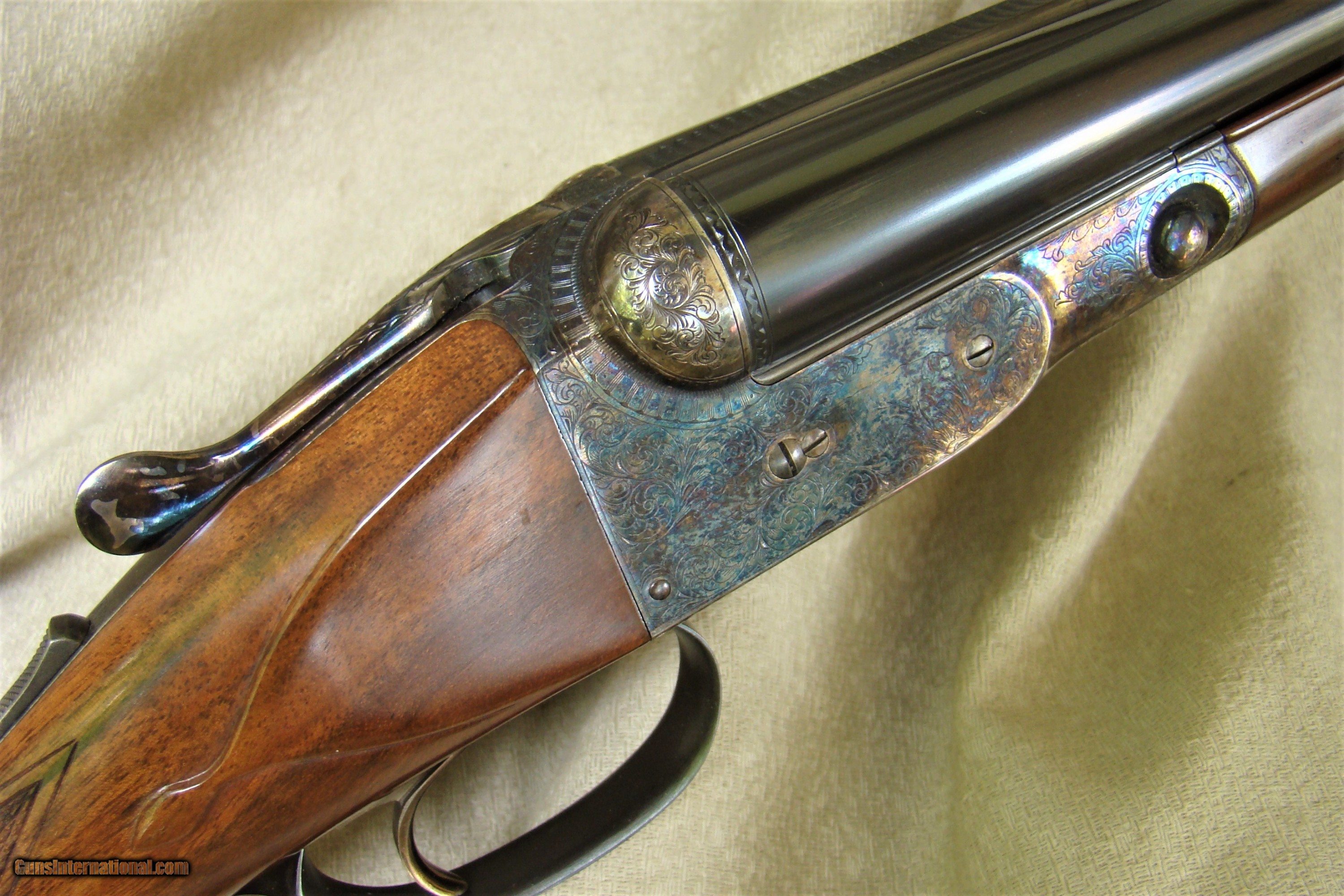 Description: Parker Reproduction DHE 20 gauge, 26" barrels choked improved cylinder and modified. Single selective trigger, straight hand stock splinter for end . Highly figured stock measures 1-3/8", comb 2-1/4" heel, 14-1/4" over the skeleton butt plate. 99 % case color and blue, some small handling marks. Weighs just 6lbs, 5-1/2 oz. SOLD |