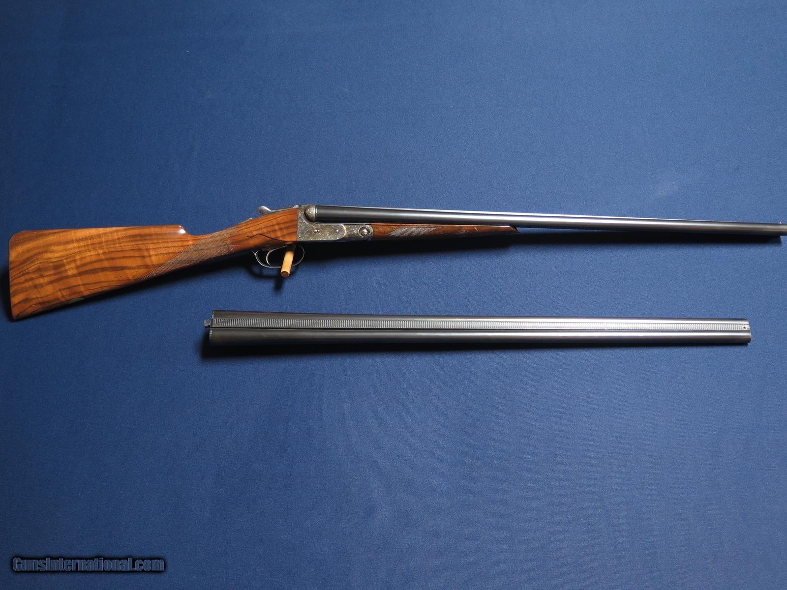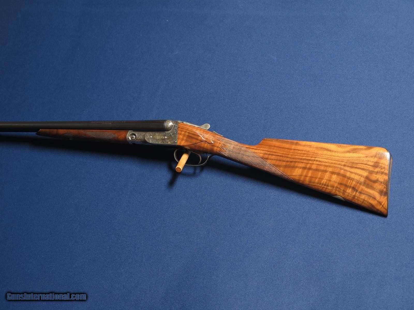 Description: Parker Reproduction DHE 20ga/20ga 2 barrel set. 26 inch IC & Mod + 28 inch 3 inch Mod & Full. S.S.T. A.E. Straight grip. 14 3/8 LOP skeleton butt. Splinter forearm. 85% case coloring. 98% blue. With case and cover. SOLD |