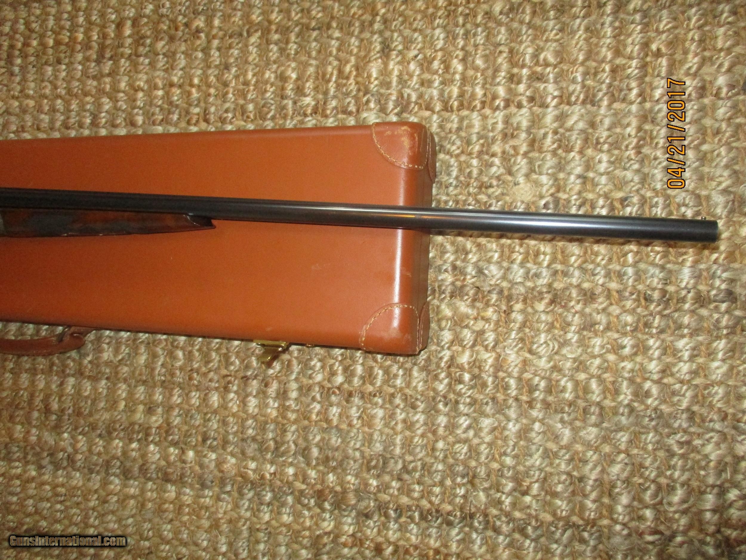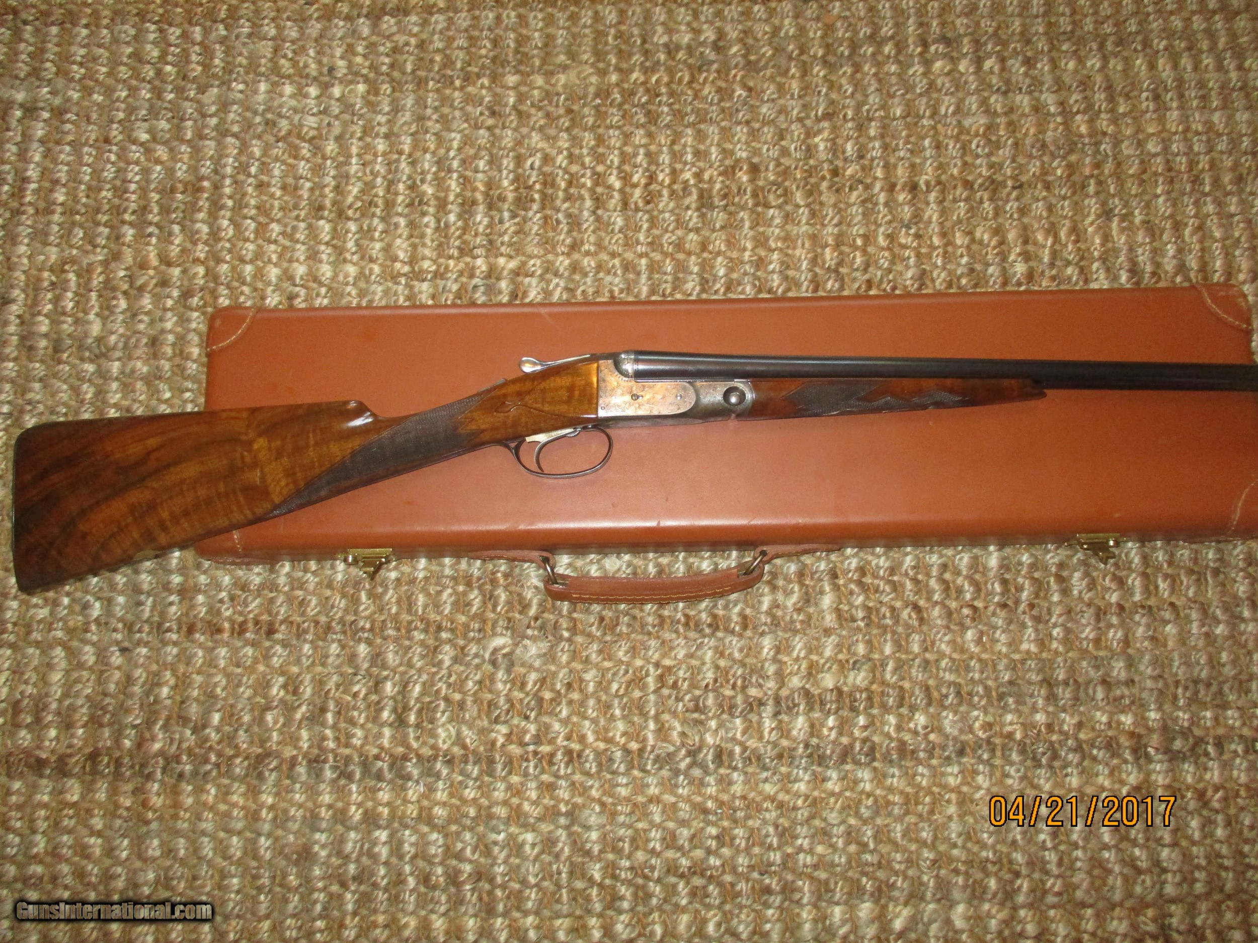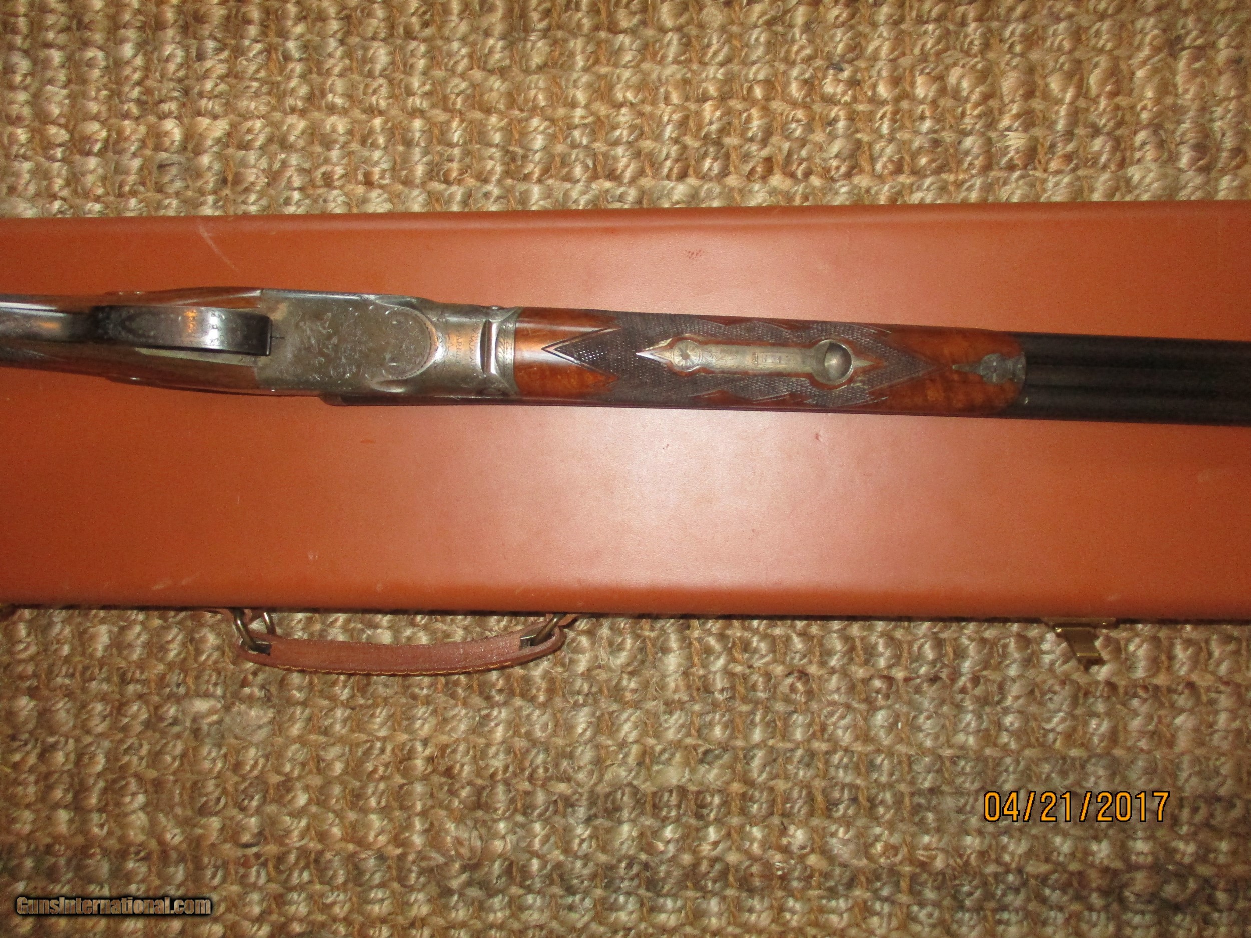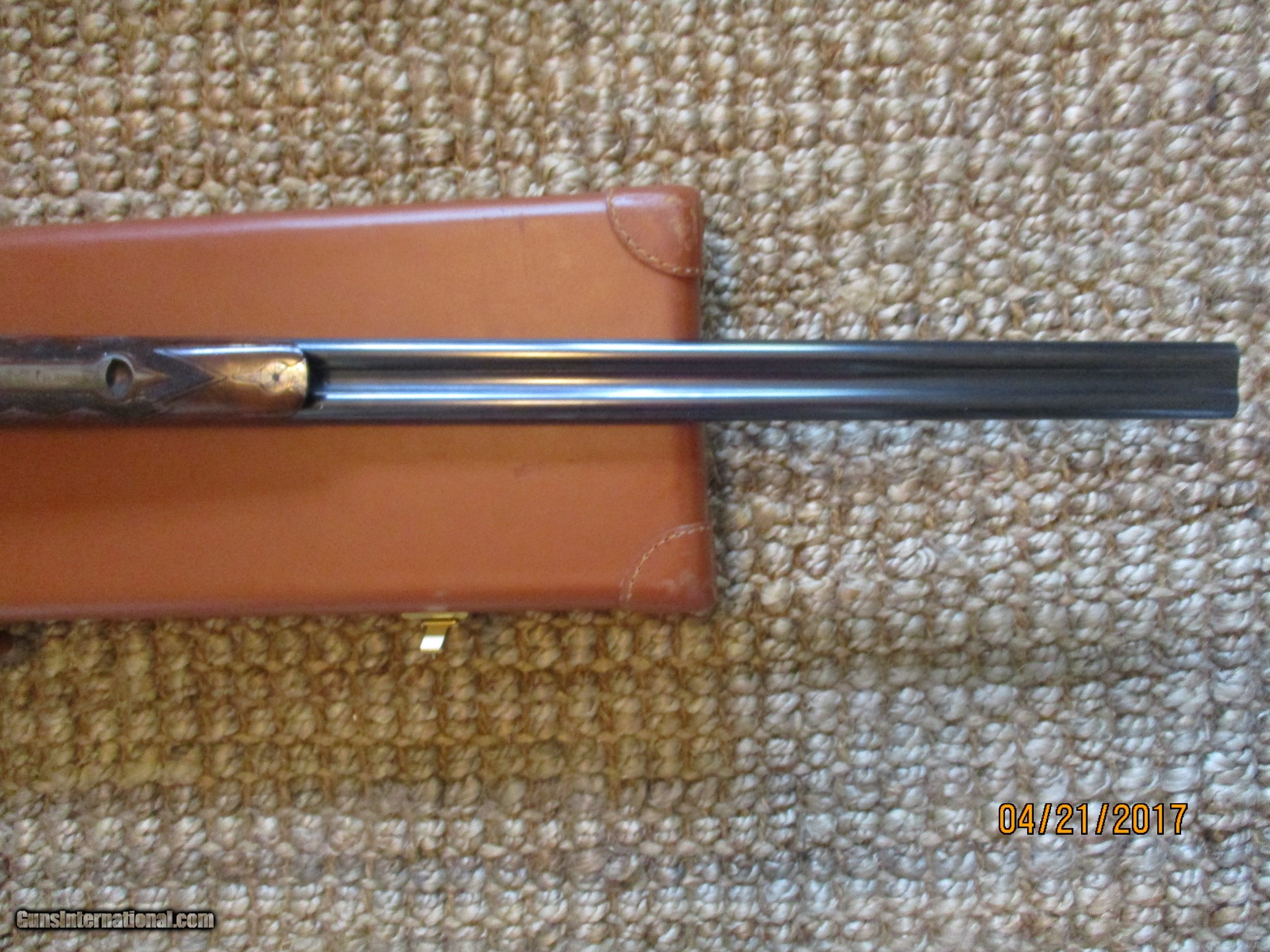Description: 26" checkered, tapered swamp rib choked IC/M, Parker style single select trigger, ejectors, full covererage gamescenes, slightly fading Nitrous Oxide CC as - normal for Repros., fantastic European Circasian checkered straight stock, engraved skeleton butt also metal takedown forearm release, splinther forearm, some scratches & minor indents top end of stock (pictured);otherwise looks as new, 99% bbl., blue, fully covered slightly fading CC., truly tight as new, comes with original blond leather motor case, excellent with slight exception of stock blemish! SOLD |