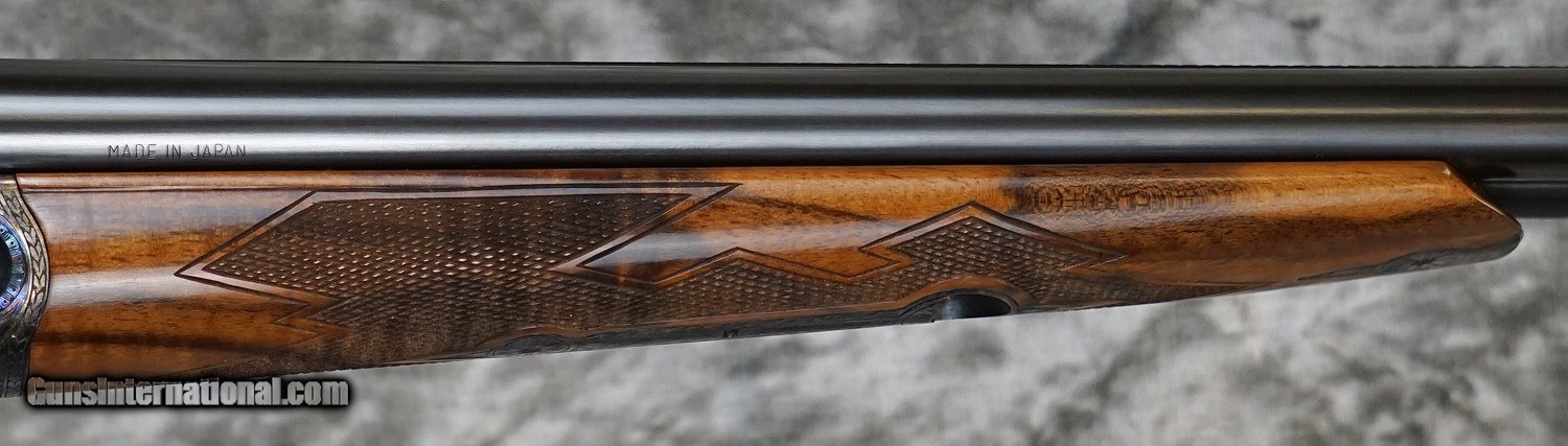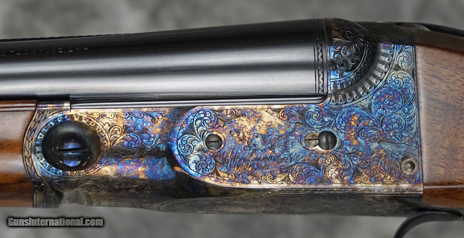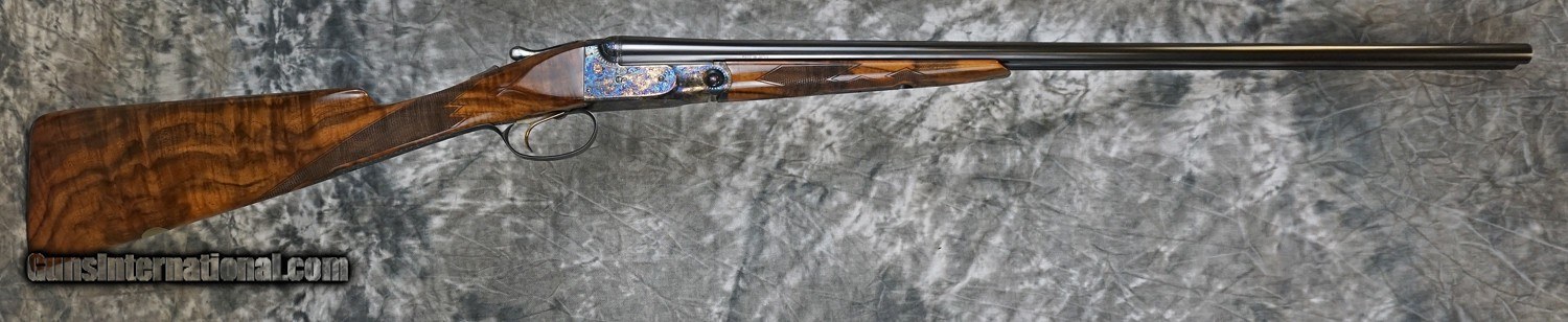 Description: Pre-Owned Parker DHE Grade Reproduction 28GA with 26" fixed (IC/M) chokes, factory swamped rib. Factory case color (Size 00 Frame) scaled action with scroll engraving and small game scene, 97%+ of factory case-color remaining. Factory single, selective trigger and ejectors. English straight-hand stock to factory skeleton butt, splinter forearm. Outstanding overall condition, only very minor handling marks. Includes factory case with original case-cover. SOLD Shotgun Gauge: 28 Gauge |