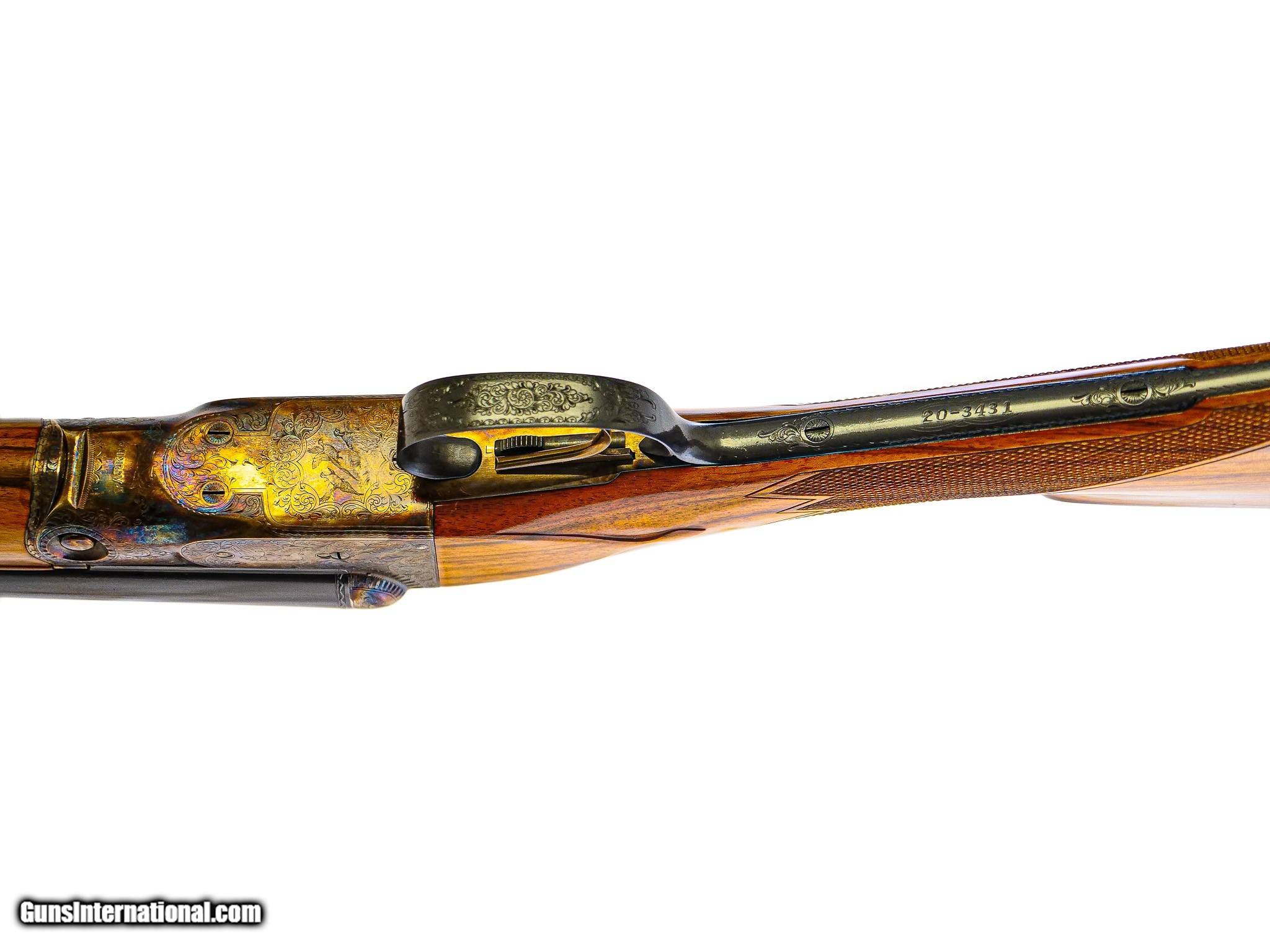 Description: Parker Reproduction - DHE Grade, SxS, Two Barrel Set, 16ga/20ga. 28" IC/M & 26" Q1/Q2. 16ga was manufactured by Kriughoff as per the original specifications, skeleton butt, brand new unfired gun. 16ga has 28” barrels, 2 3/4” chambers, choked IC/M. 20ga has 26” barrels, choked Q1/Q2. Magnificent blonde English walnut stock with dark mineral lines, splinter forend, single selective trigger, auto ejector, never been assembled out of its original box. If you want a new version of this gun, this is it. In original leather case, correct accessories including snap caps, keys, oil bottle and canvas cover. If you want a truly brand new, unused example, this would be it. Inv: 69441 14 1/8" x 1 3/8" x 2" $11,250.00 SOLD |